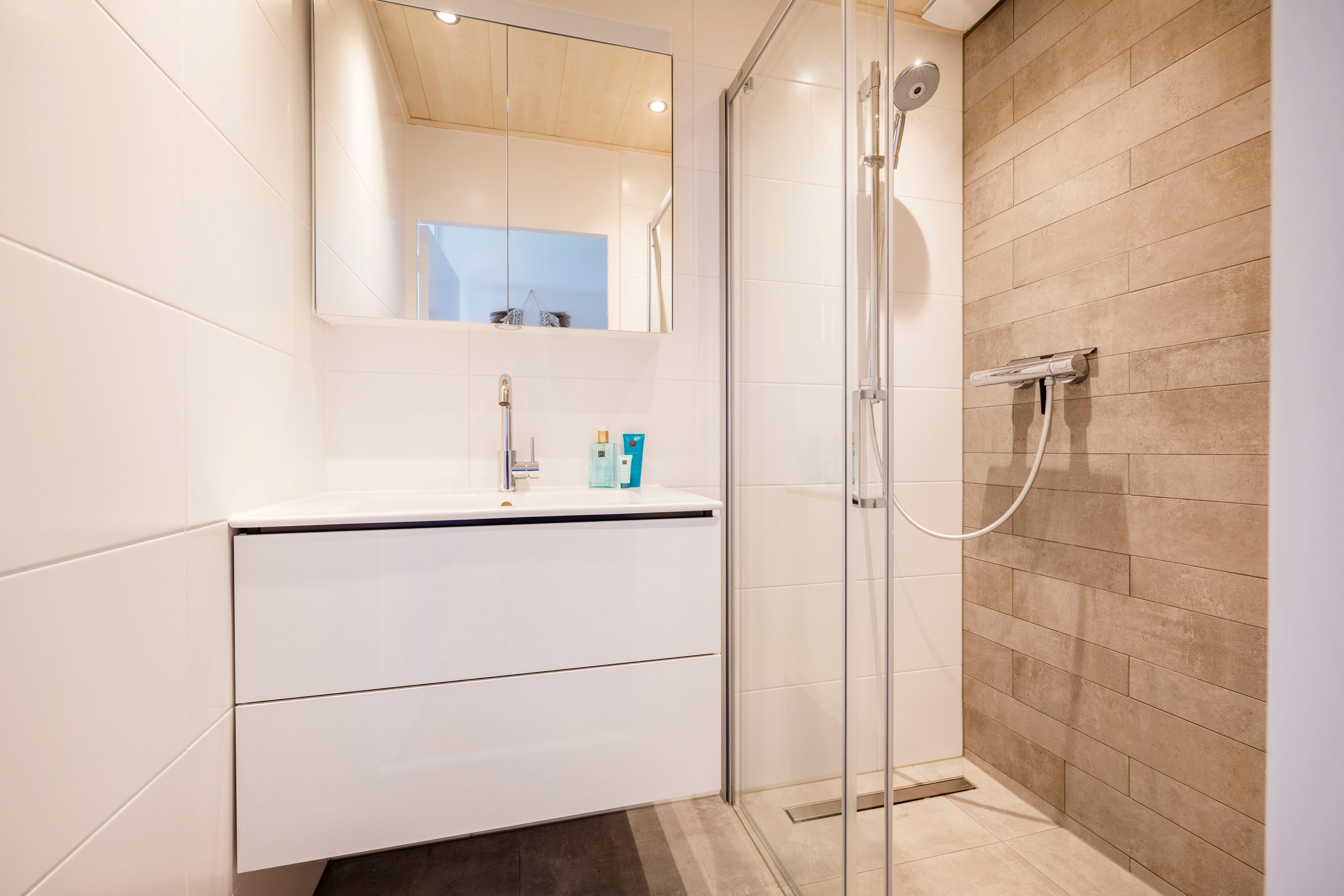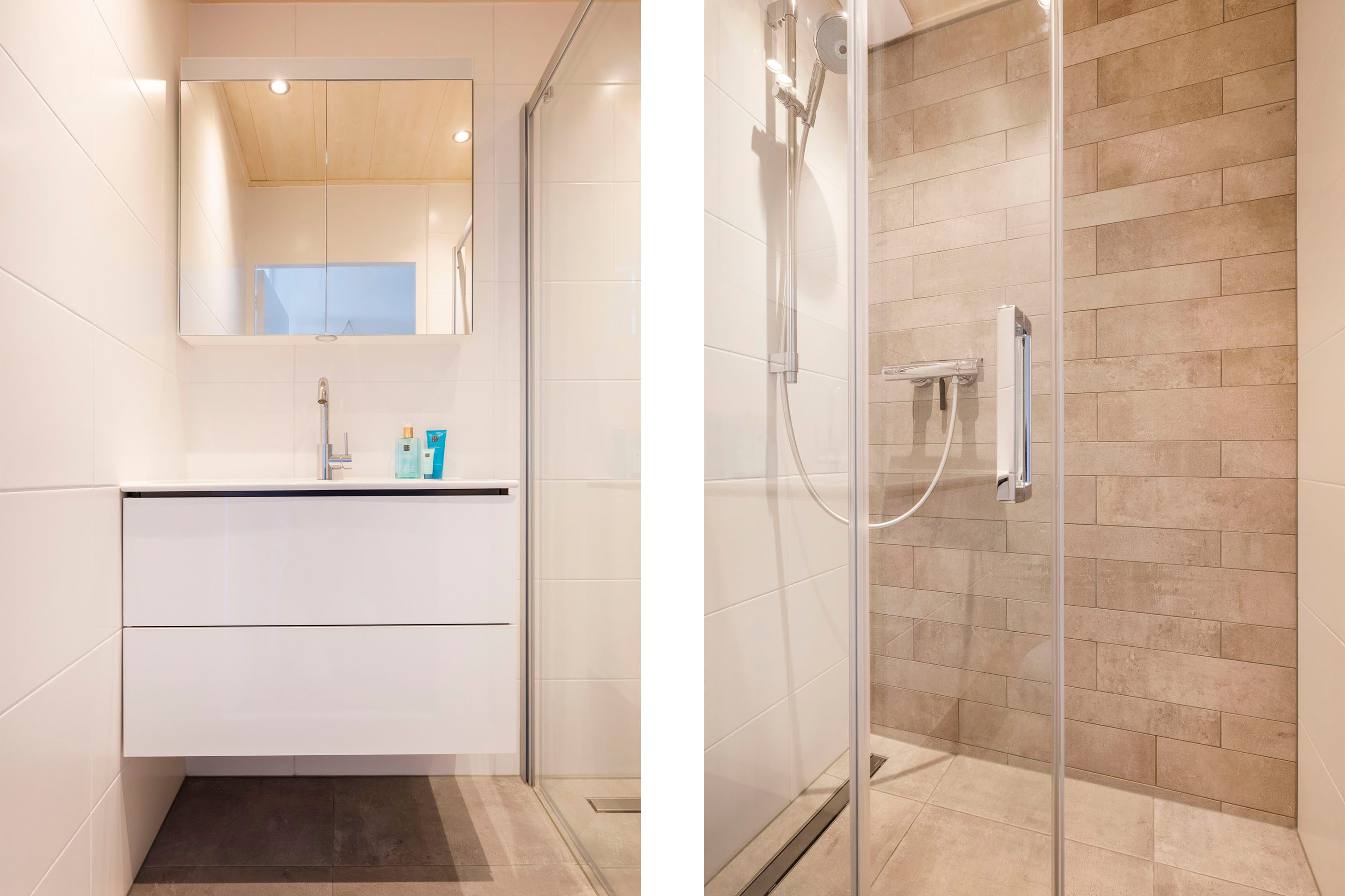 De badkamer (2020) is centraal gelegen tussen de drie slaapkamers, is voorzien van lichte vloer- en wandtegels en uitgevoerd met een wastafelmeubel met enkele wastafel en inloopdouche. Het toilet is separaat en qua uitstraling een match met de badkamer. De aansluitingen voor de wasmachine en droger bevinden zich in de wasruimte. Hier bevindt zich tevens de boiler.