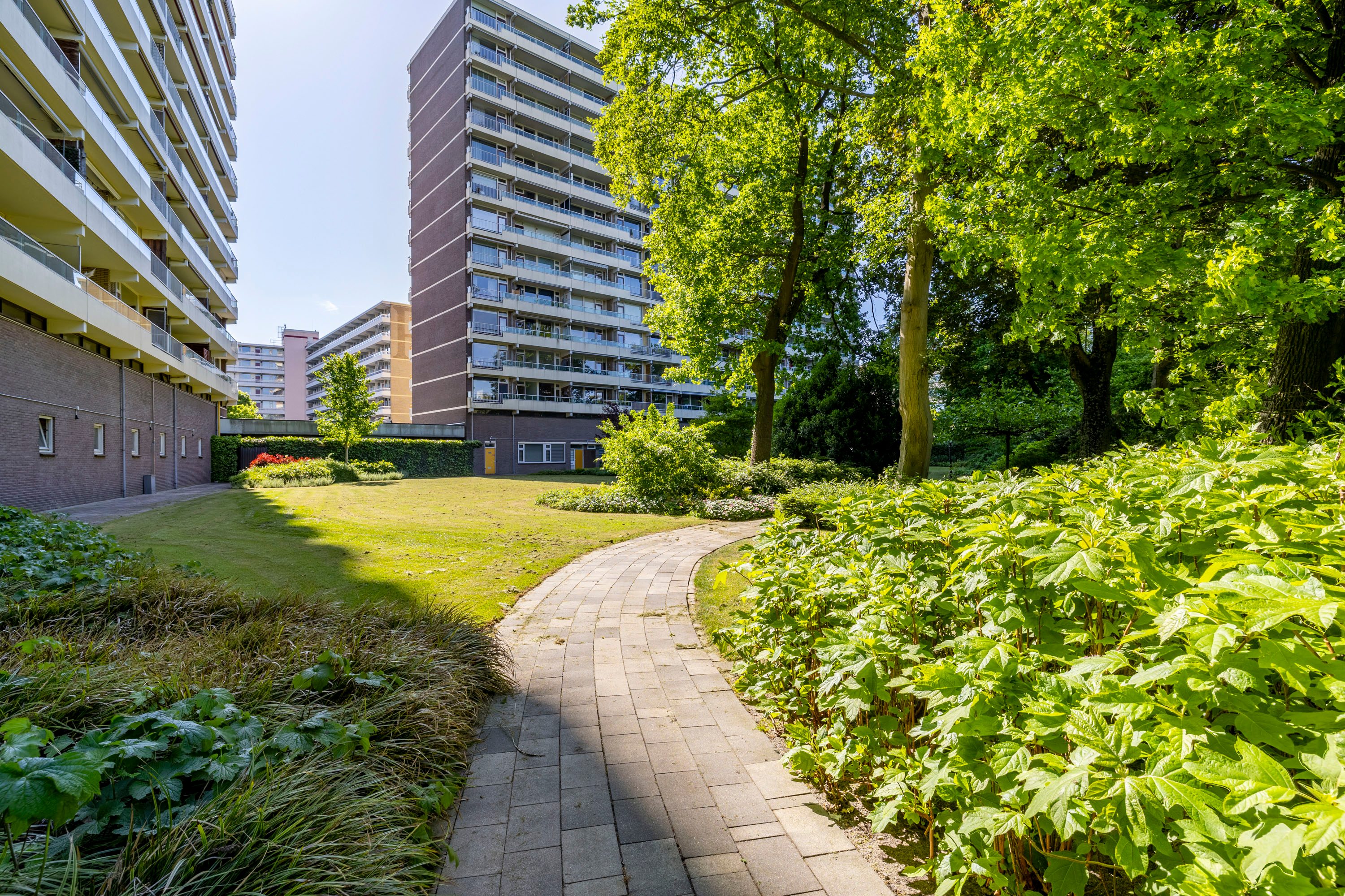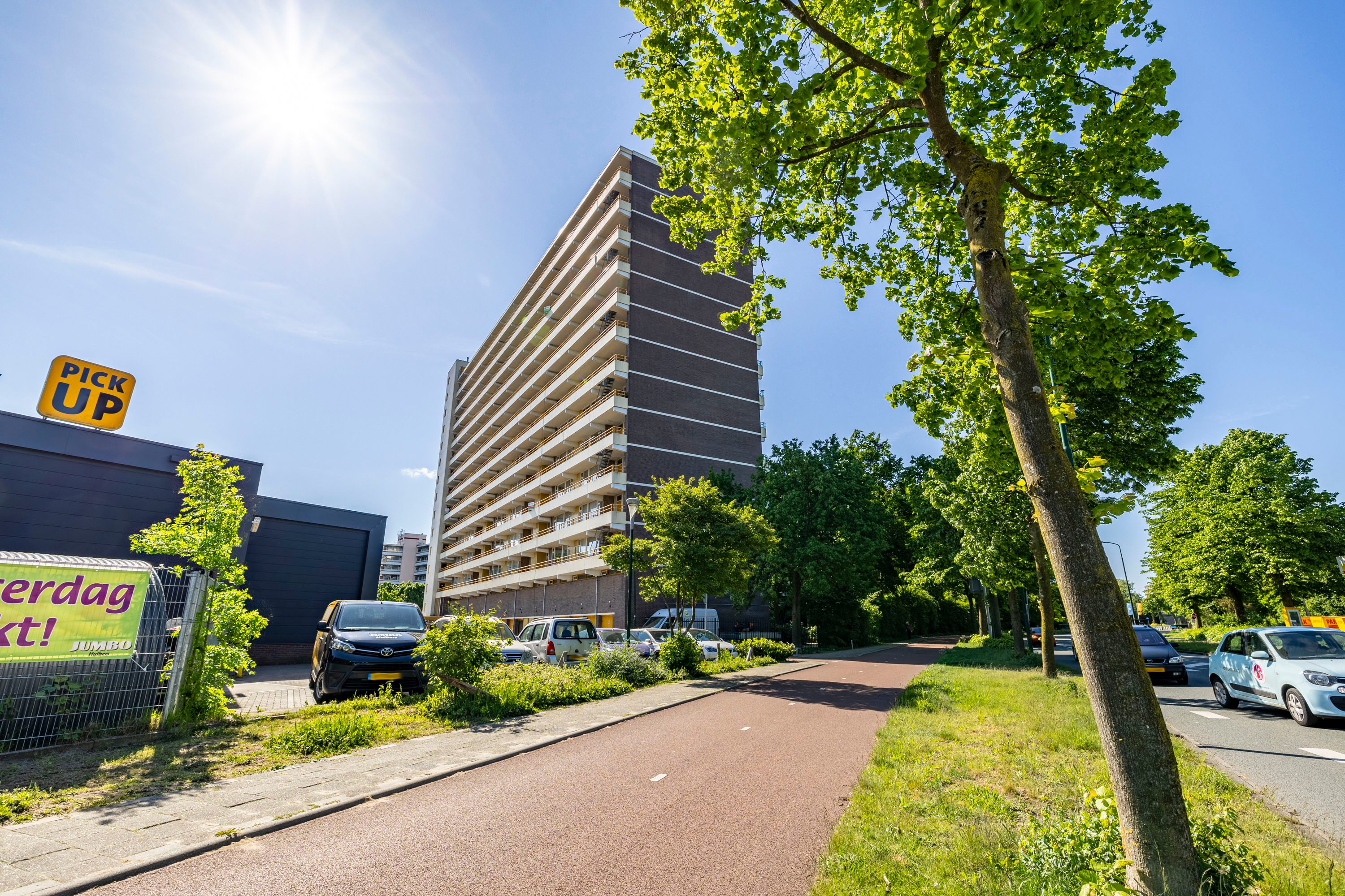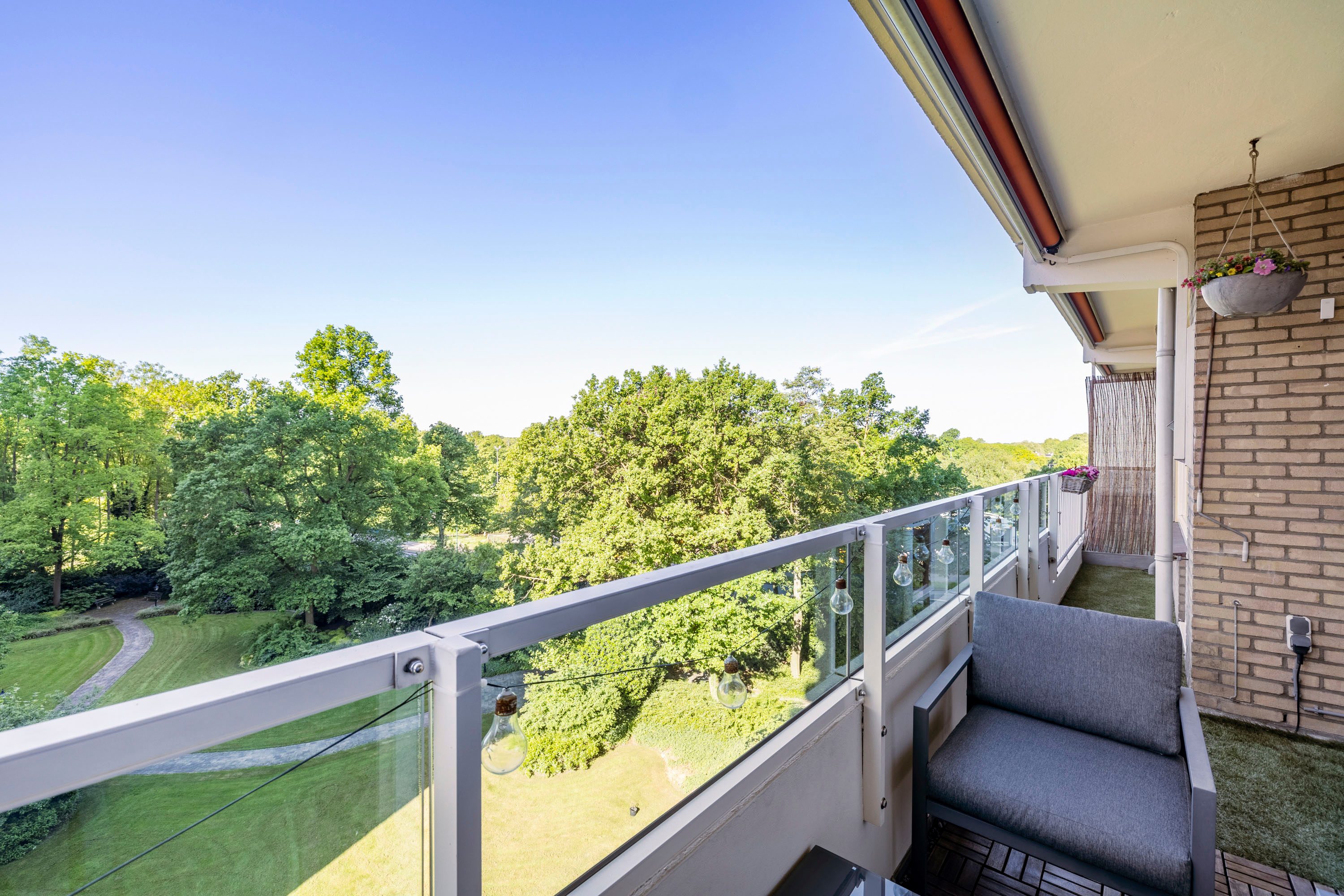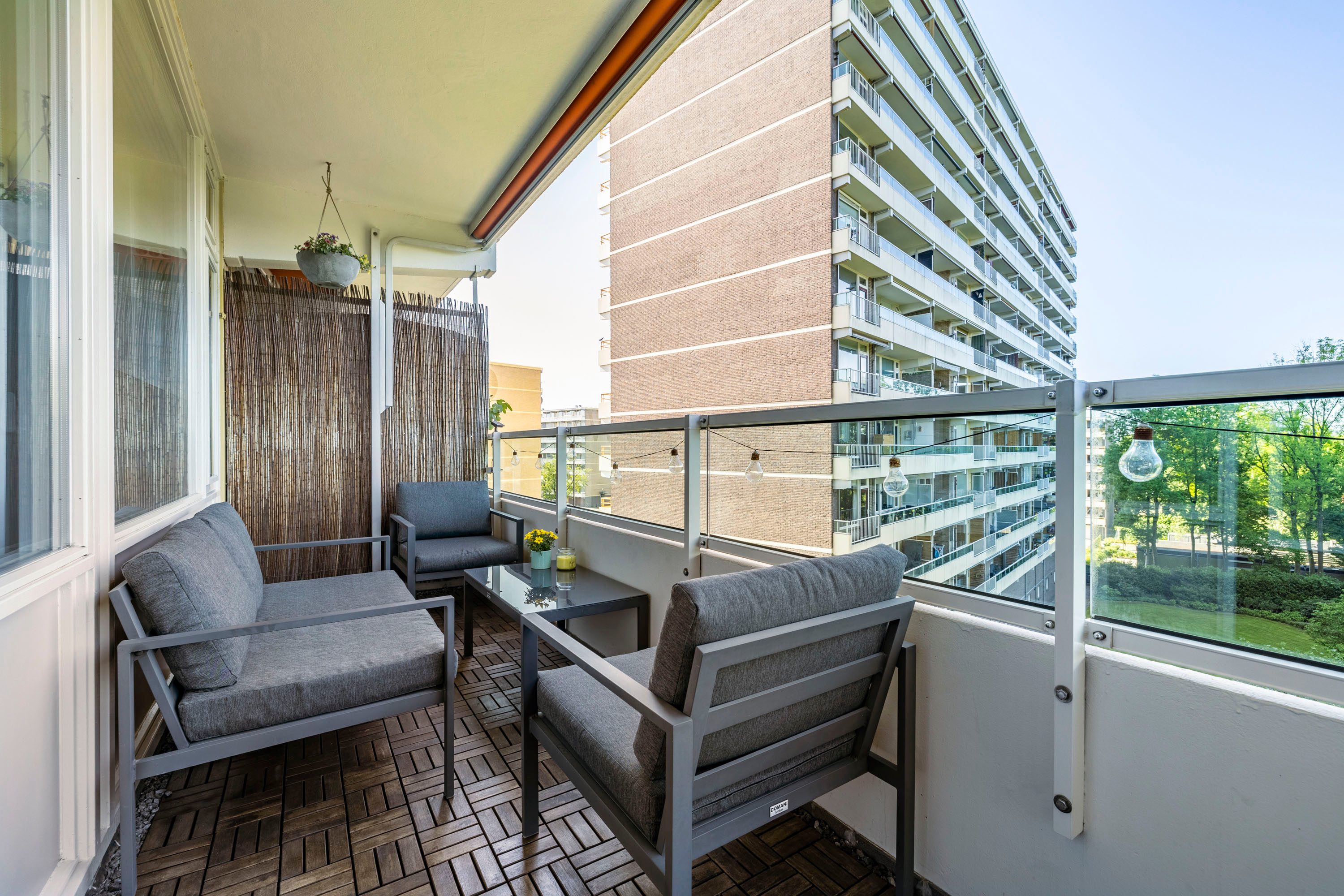 Het balkon is gelegen op het zuidwesten en biedt je fantastisch en vrij uitzicht over de gemeenschappelijk tuin en Veenendaal West met o.a. de sportvelden van voetbalverenigingen DOVO en GVVV. Door de (eind)middag- en avondzon is dit een heerlijk plek om na een drukke dag werken te genieten van een hapje en/of drankje!