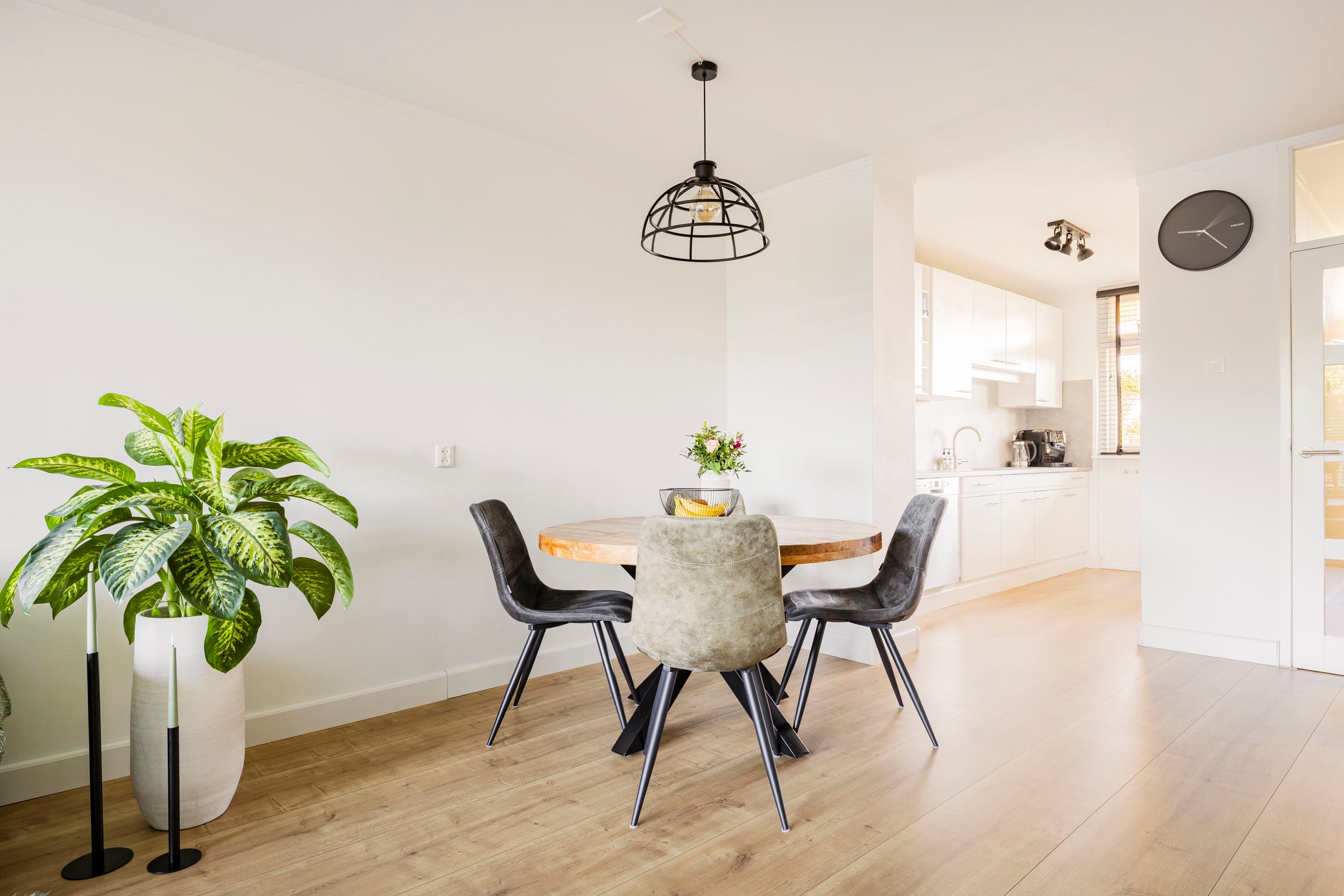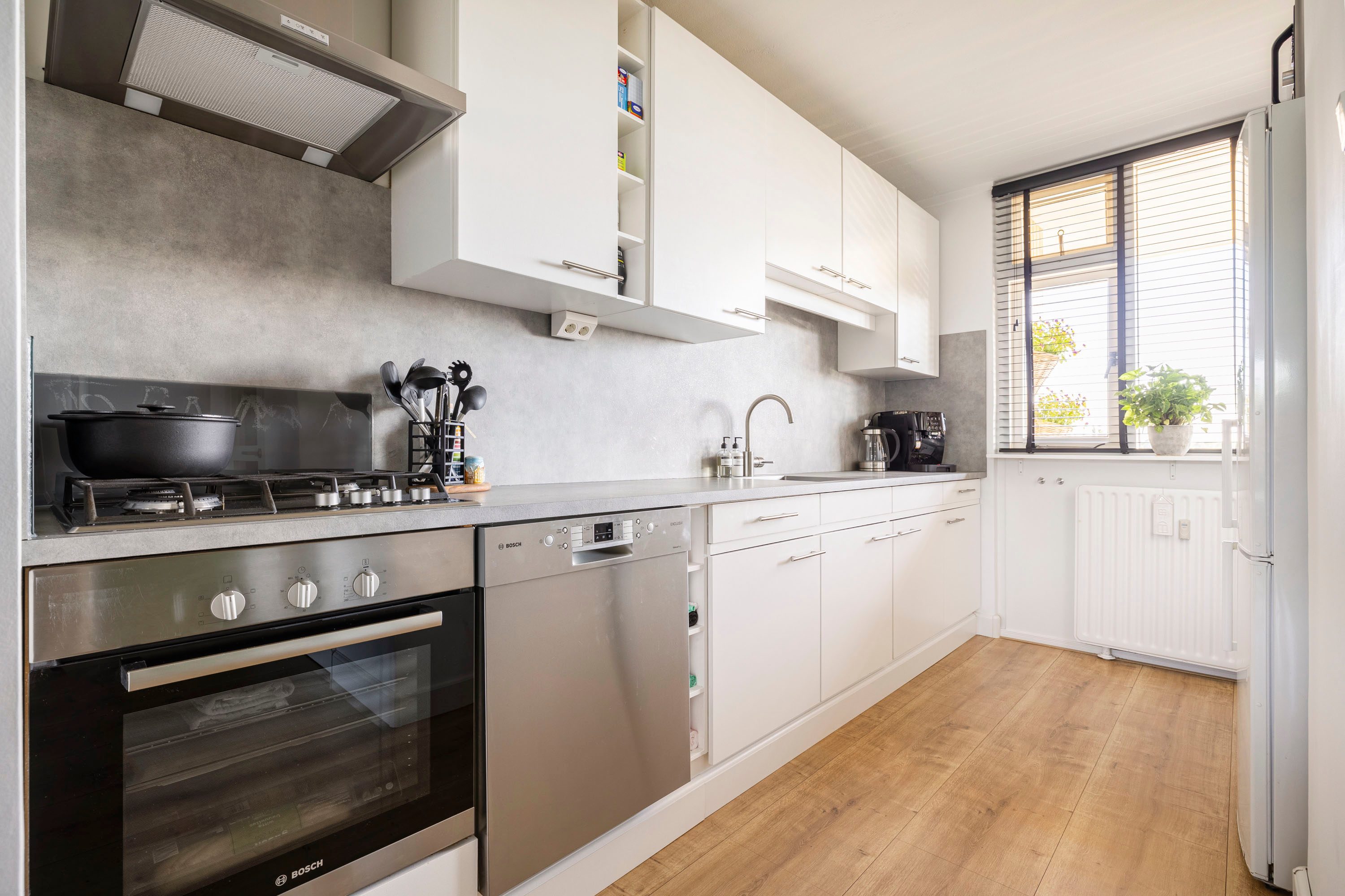 Eenmaal in de woon-/eetkamer vallen gelijk aan aantal dingen op: het is speels ingedeeld, grote raampartijen met veel daglichttoetreding (HR++), een breed en zonnig balkon, een ruime en verzorgde open keuken (2020) met witte fronten, betonlook aanrechtblad en het benodigde inbouwapparatuur en uiteraard het formaat van de woon-/eetkamer.