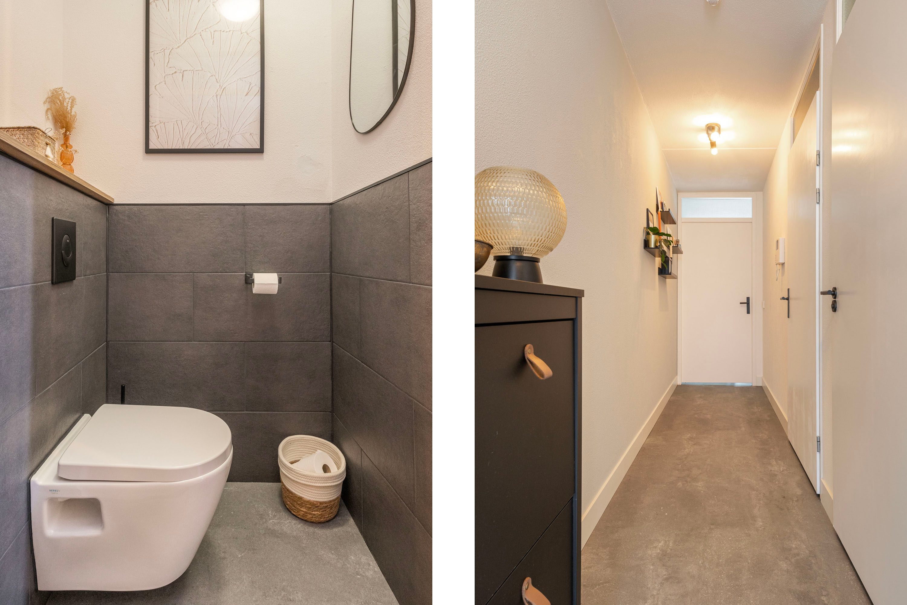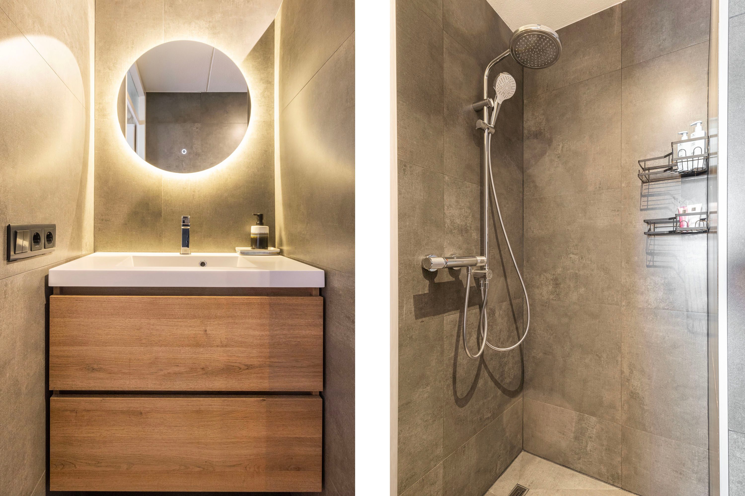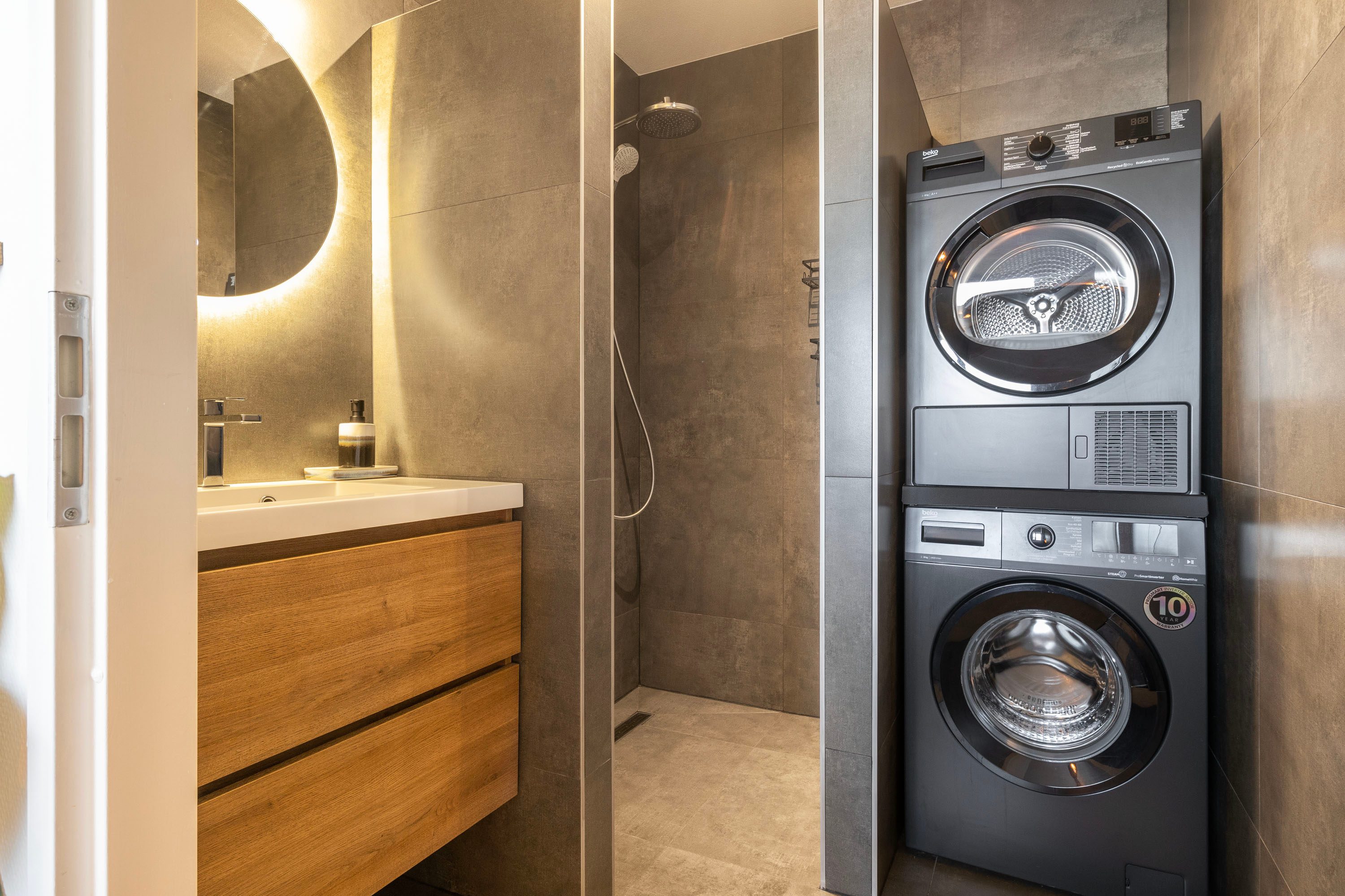 De badkamer is modern afgewerkt met antracietgrijze tegels en beschikt over een ruim wastafelmeubel en een inloopdouche. Hier bevinden zich tevens de aansluitingen voor de wasmachine en droger.