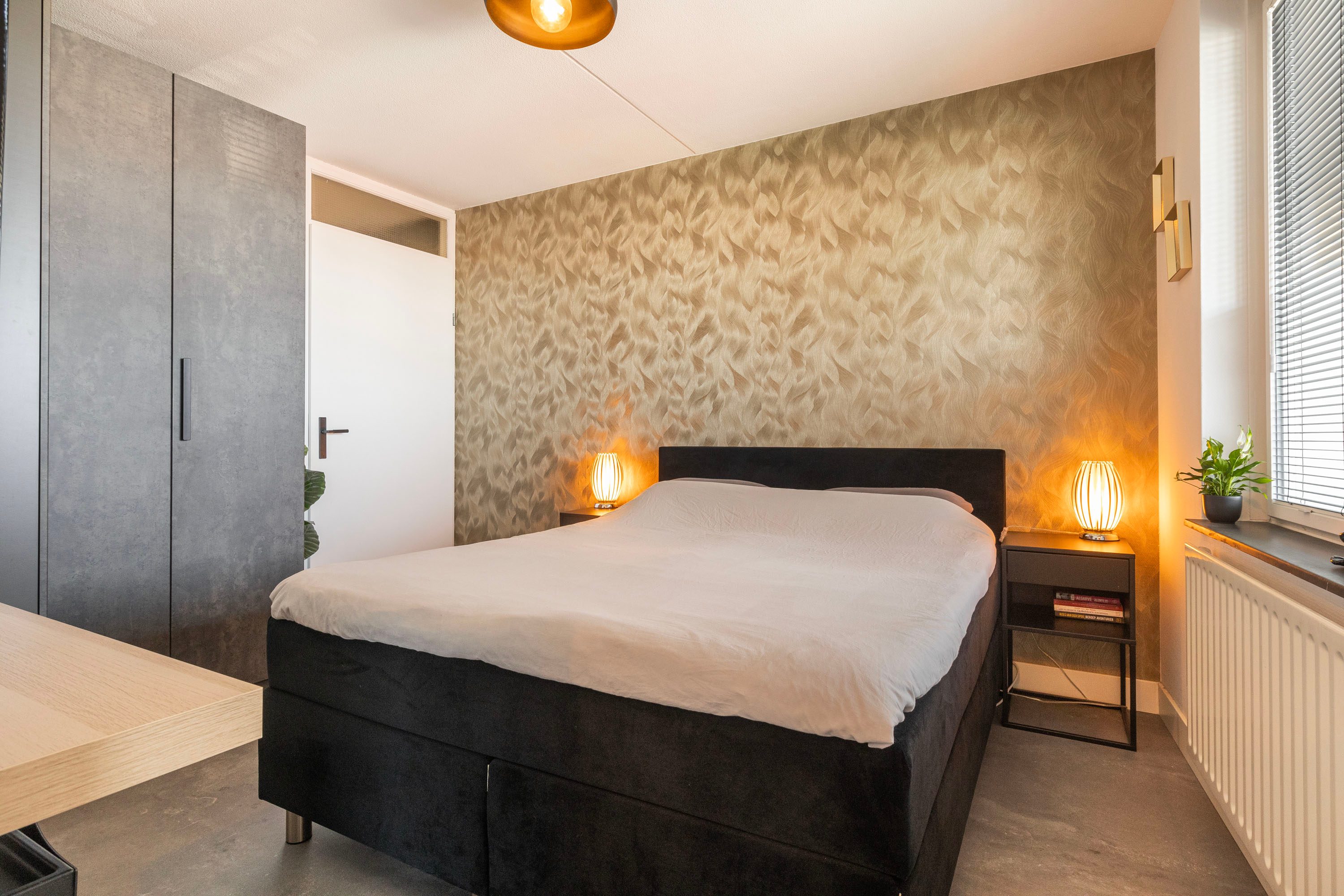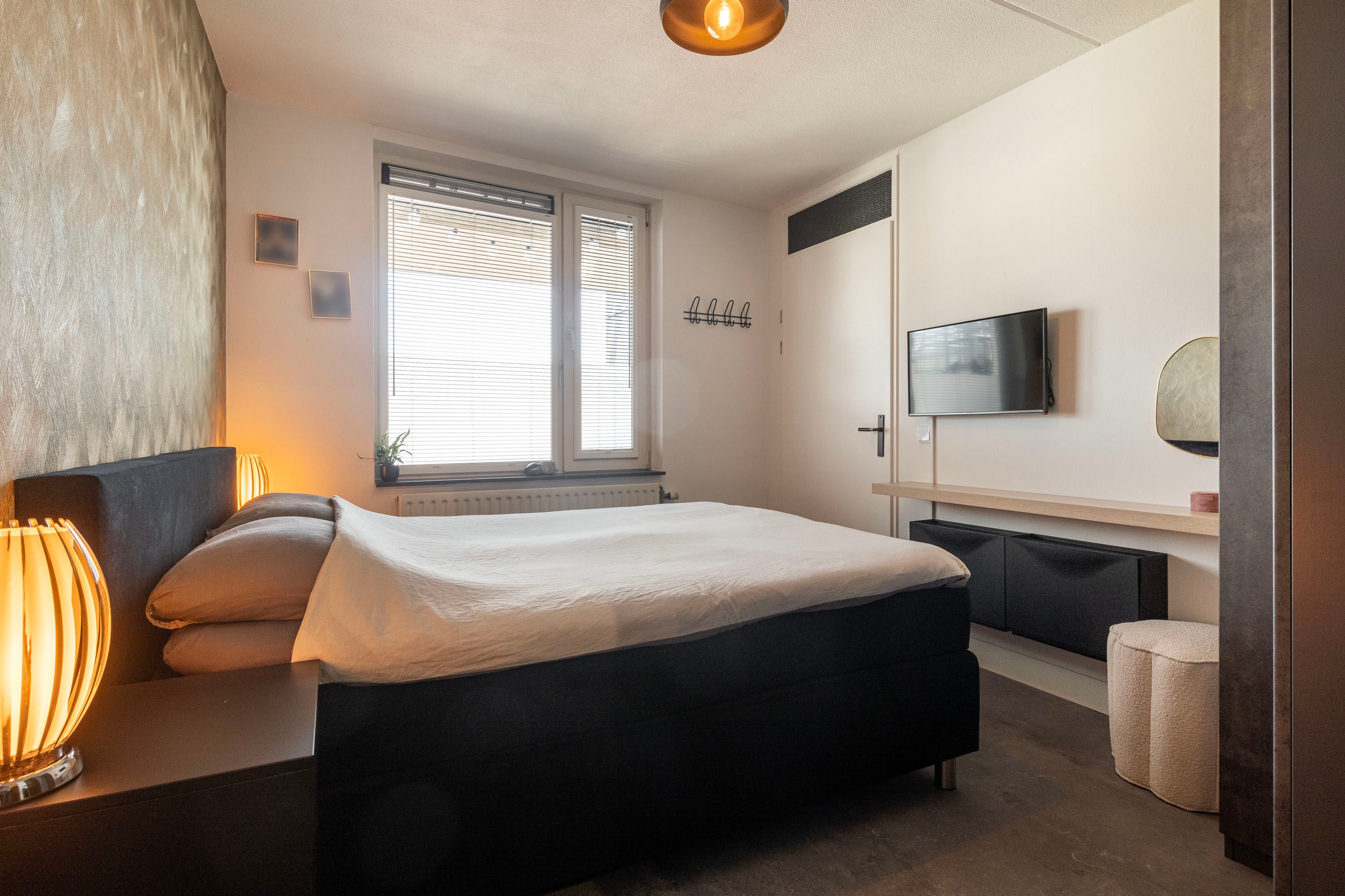 Aan de voorzijde van het appartement bevindt zich de slaapkamer van 11,2 m², voorzien van een grote raampartij en opbergruimte. Vanuit deze slaapkamer is ook de badkamer bereikbaar.