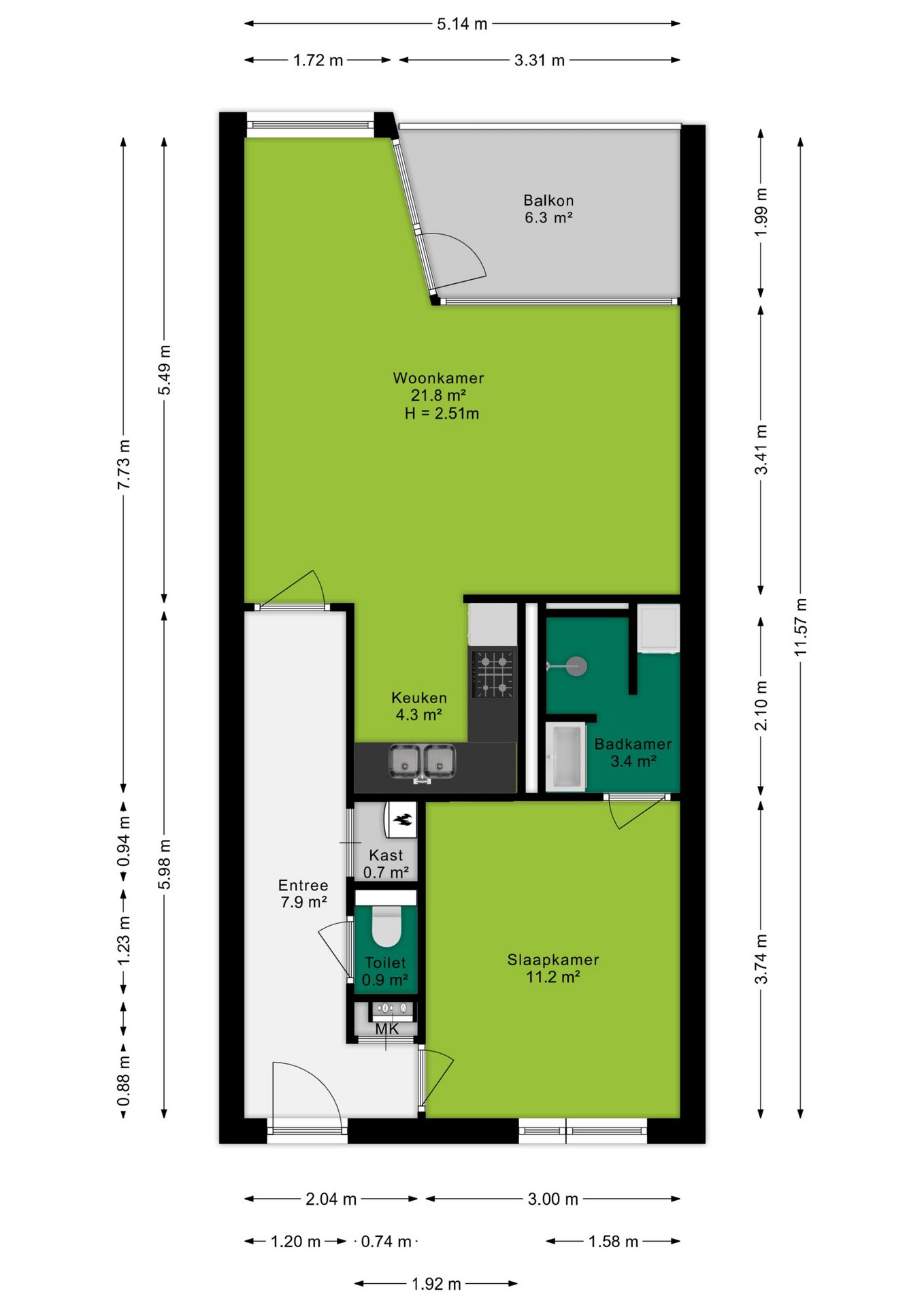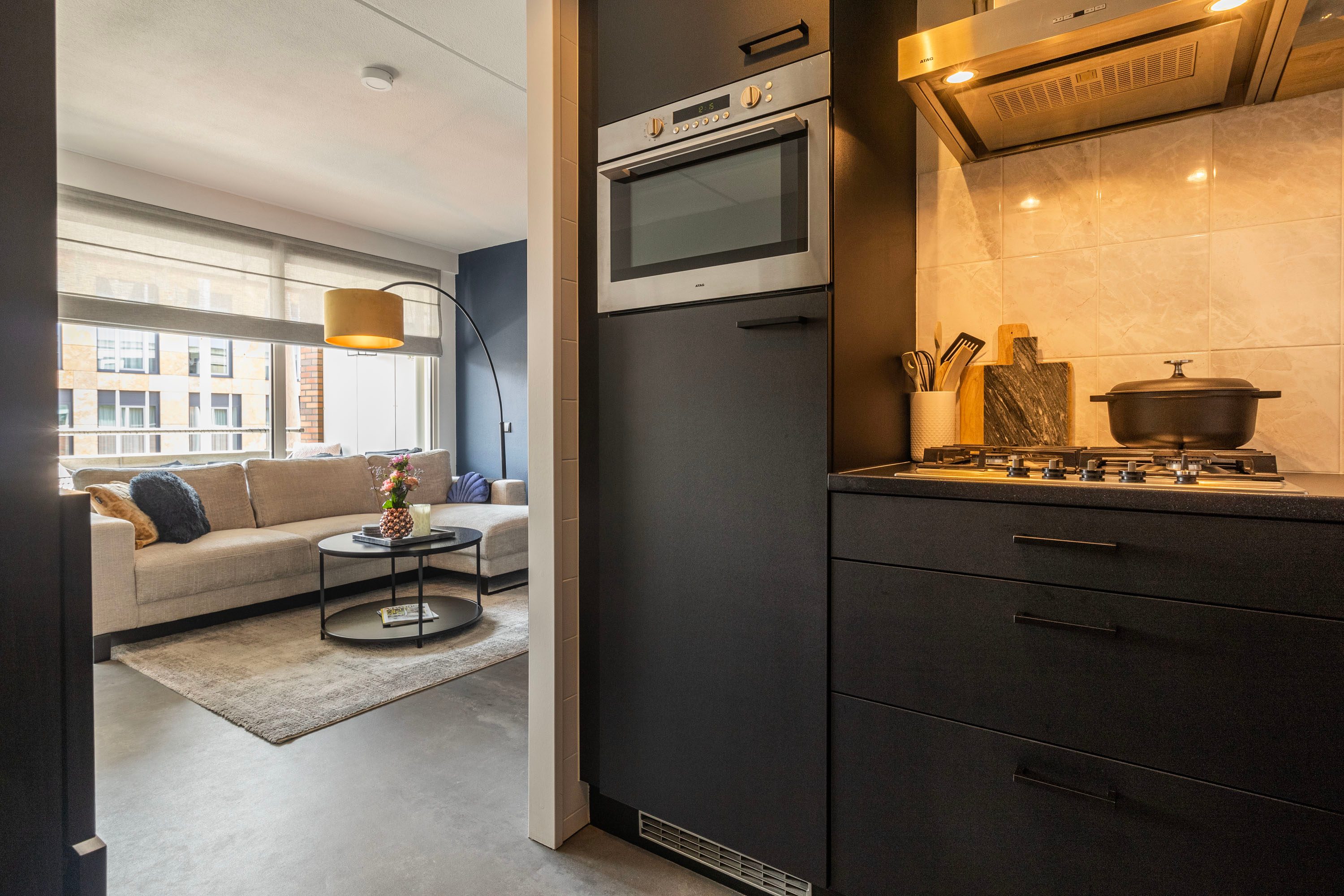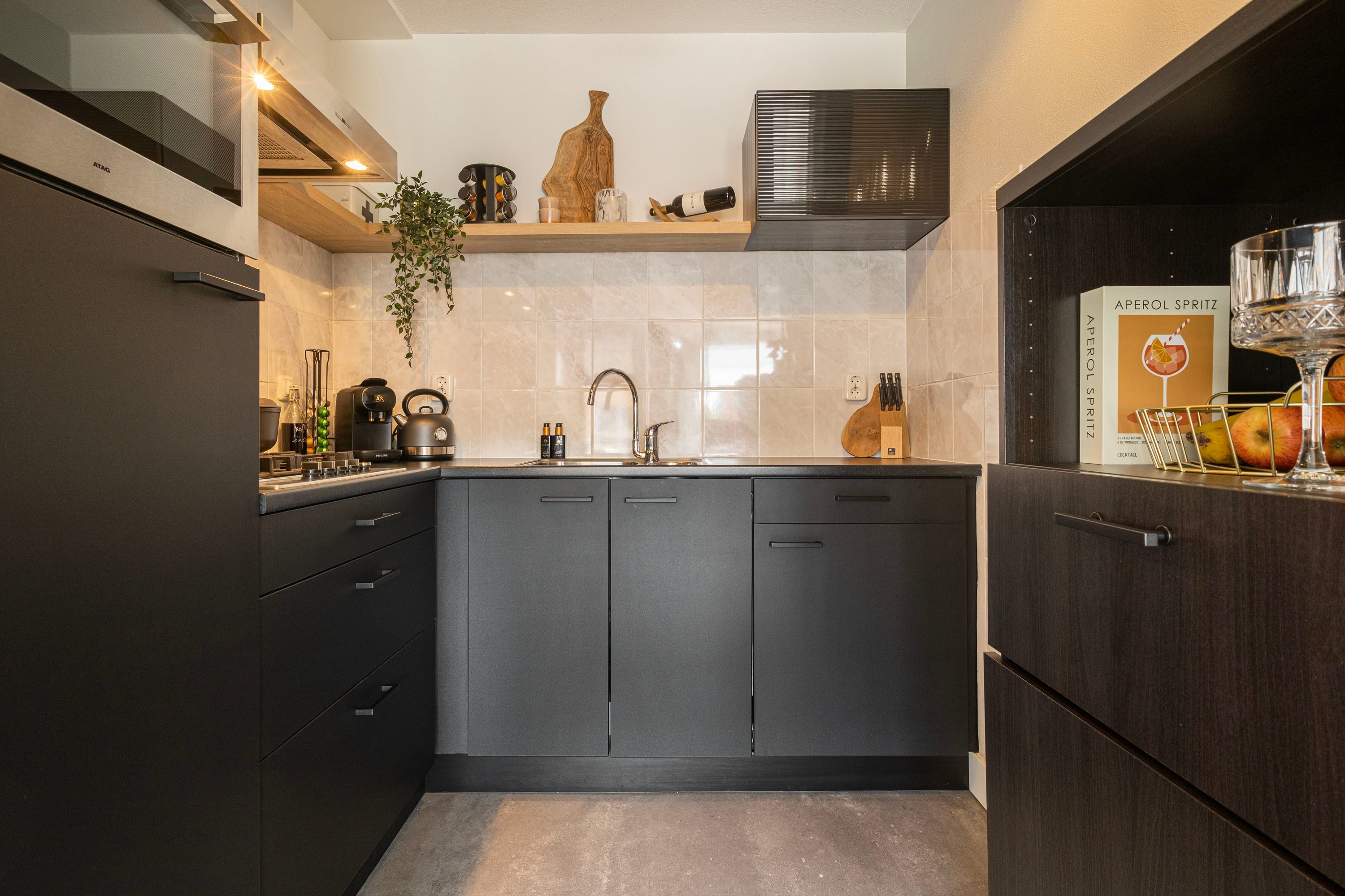 Bij binnenkomst in het appartement betreed je een ruime hal met plaats voor een garderobe, toegang tot de meterkast, een apart toilet en twee deuren die leiden naar de slaapkamer en de rest van de woning. De woon- en eetkamer heeft een royale oppervlakte van 21,8 m² en biedt veel lichtinval. Er is voldoende ruimte voor een grote bank, een ruime eettafel en zelfs een extra gezellige zithoek of thuiswerkplek, tevens vindt je hier ook de toegang naar het balkon. De moderne keuken, voorzien van stijlvol tegelwerk en diverse inbouwapparatuur, is praktisch en esthetisch ingericht.
