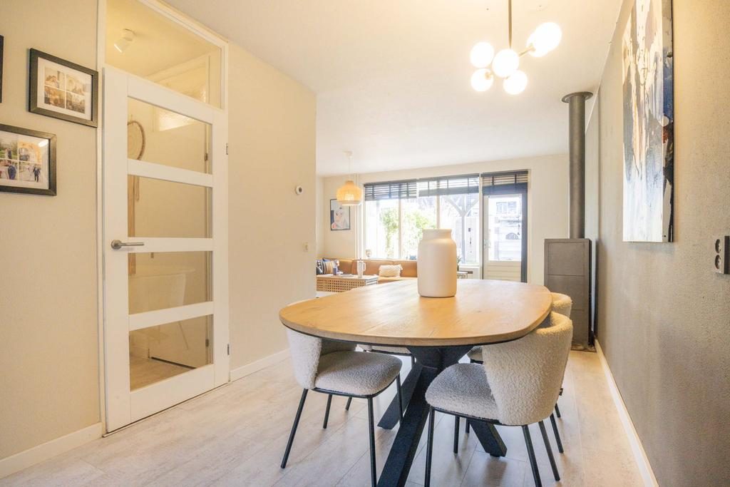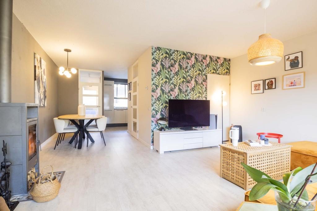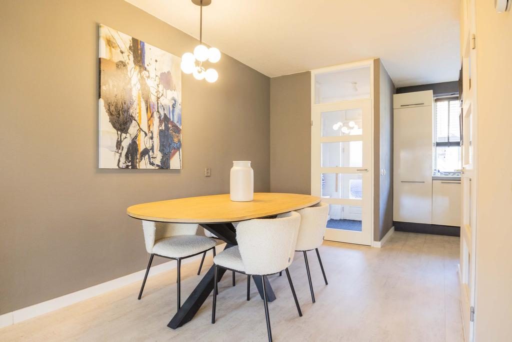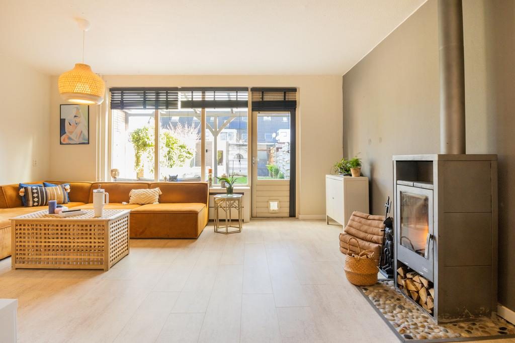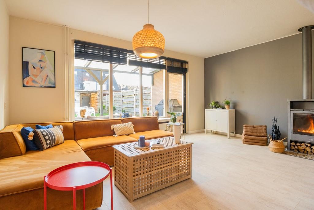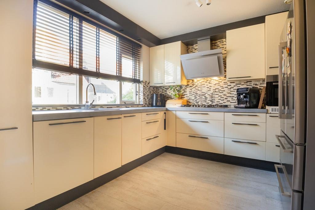 Via de entree en hal met meterkast is de woonkamer te bereiken. De royale woonkamer heeft een afmeting van ruim 25m², is voorzien van een sfeervolle laminaatvloer, neutrale wanden en heerlijk veel lichtinval. Vooral de open haard geeft hier nog sfeer. Door de ruime afmeting is er plek genoeg voor een eetgedeelte en ontstaat er een gezellige verbinding tussen de woonkamer en de keuken. De keuken heeft een lichte kleurstelling en is voorzien van diverse inbouwapparatuur waaronder een vaatwasser, gasfornuis, afzuigkap, combi-oven/magnetron, koelkast en vriezer.