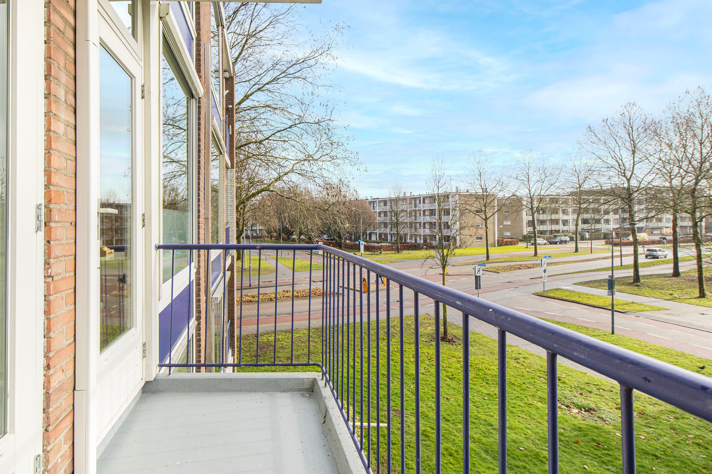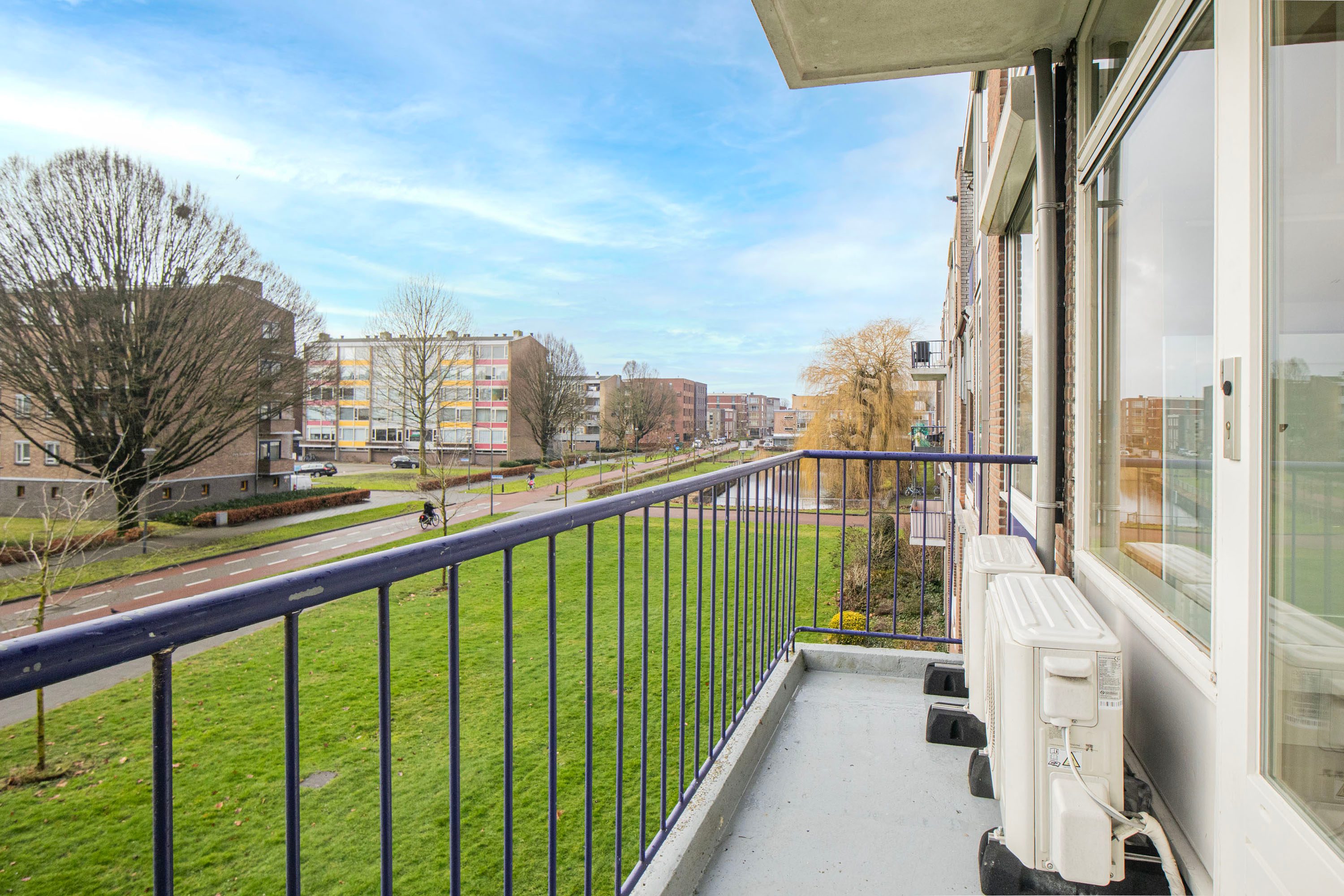 Het balkon, gelegen op het zuiden, is een fijne verlenging van de woonkamer. Hier geniet je van een vrij uitzicht over de groene omgeving en kun je heerlijk ontspannen in de middag- en avondzon.