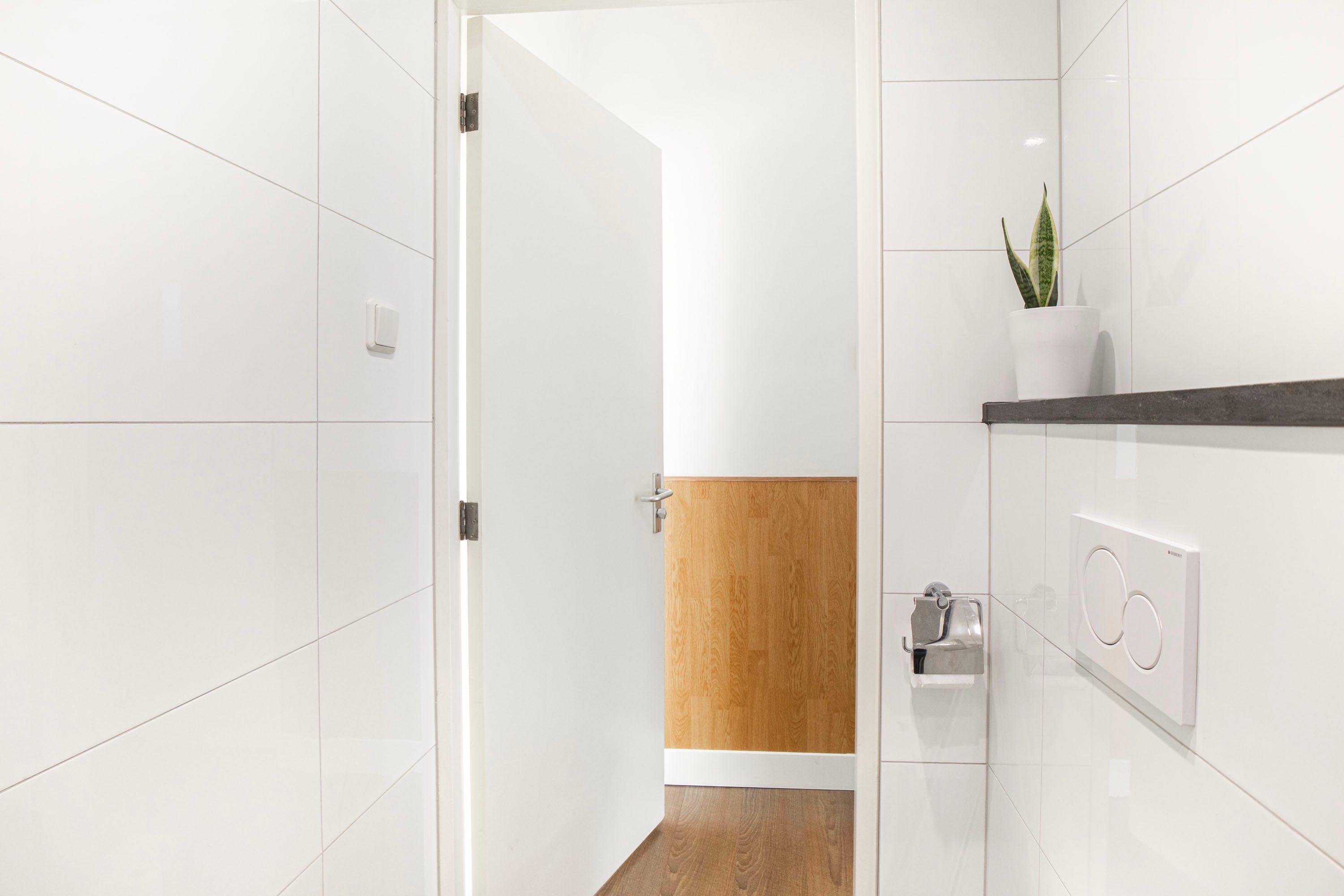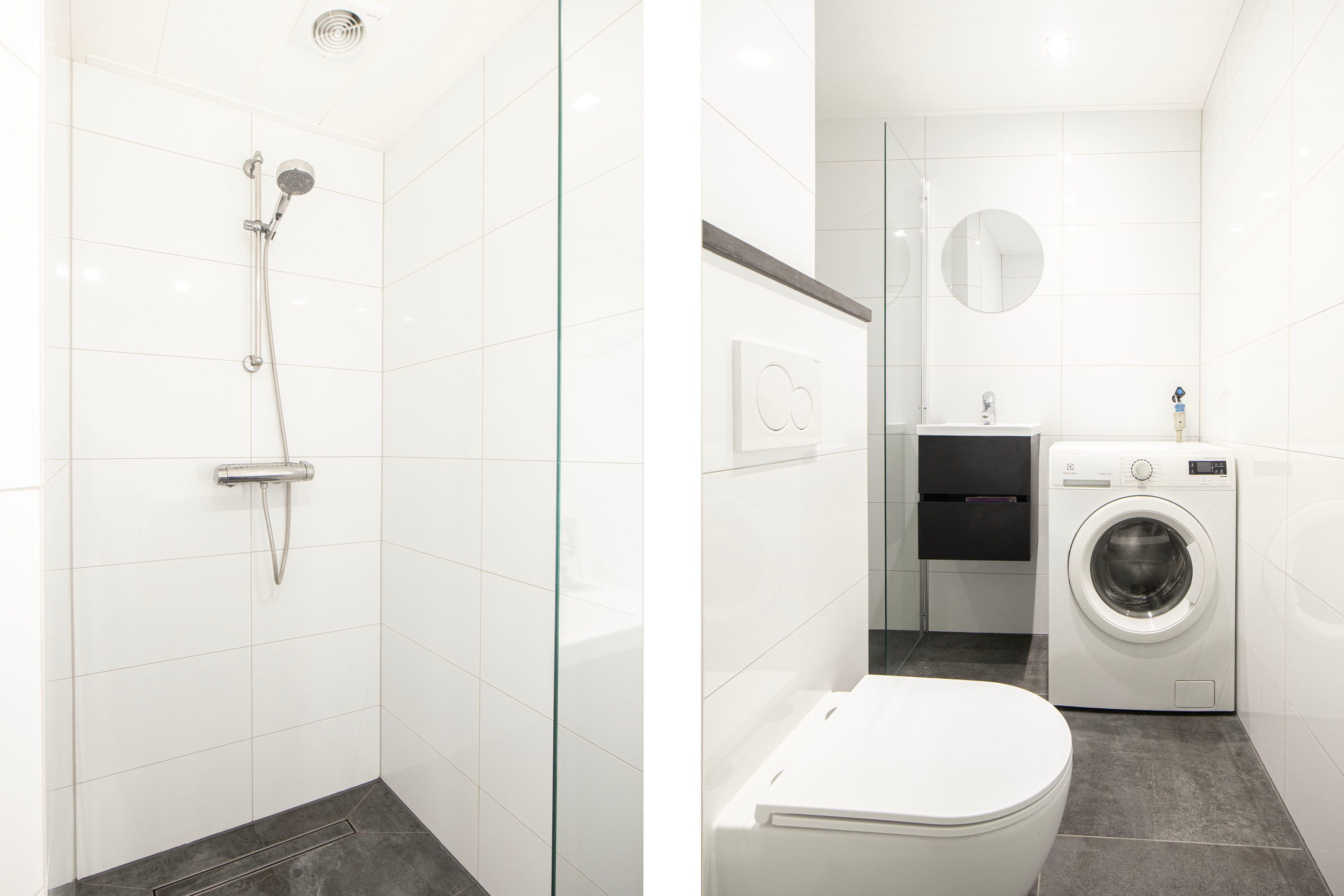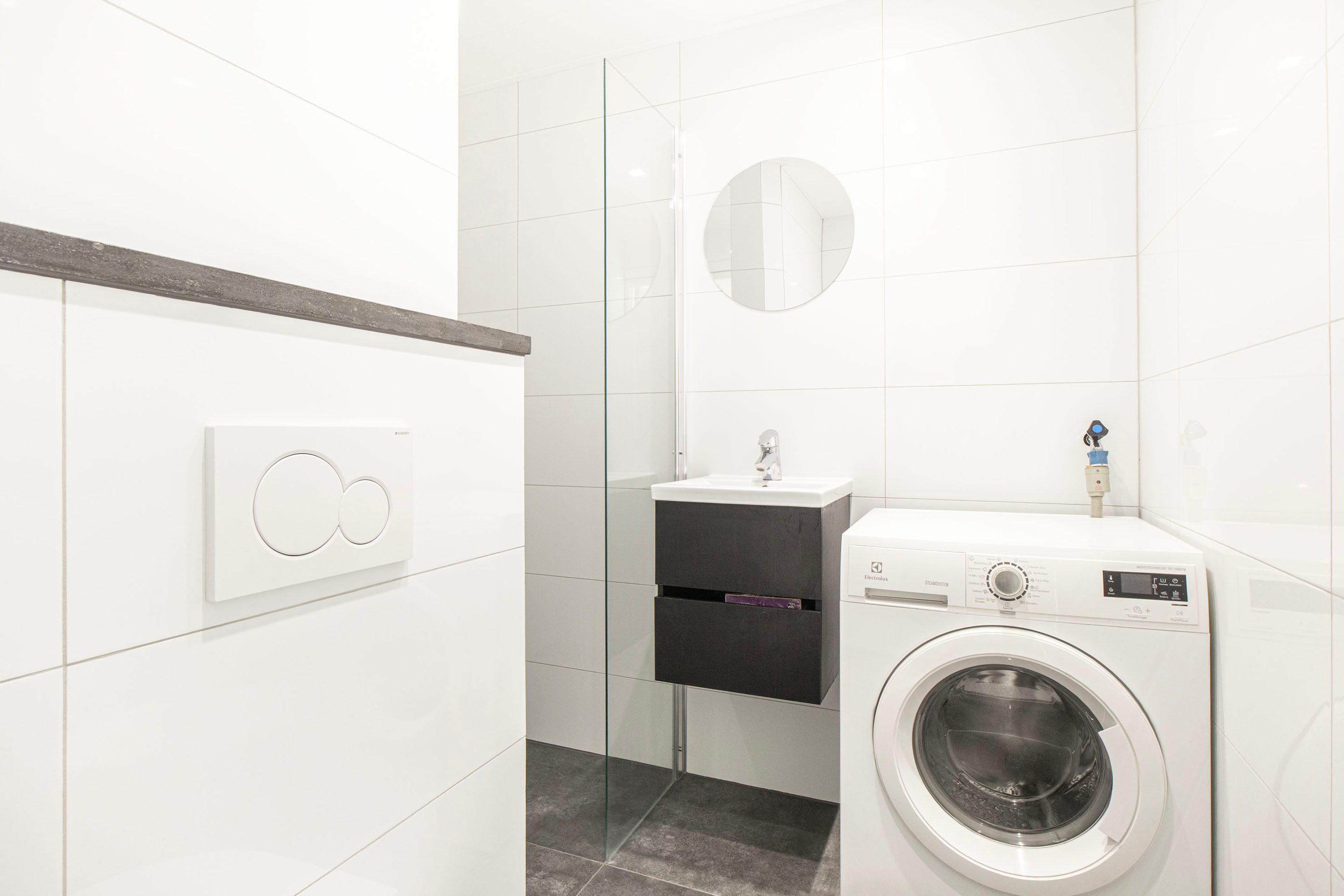 + Badkamer met douche, wastafelmeubel en wasmachineaansluiting