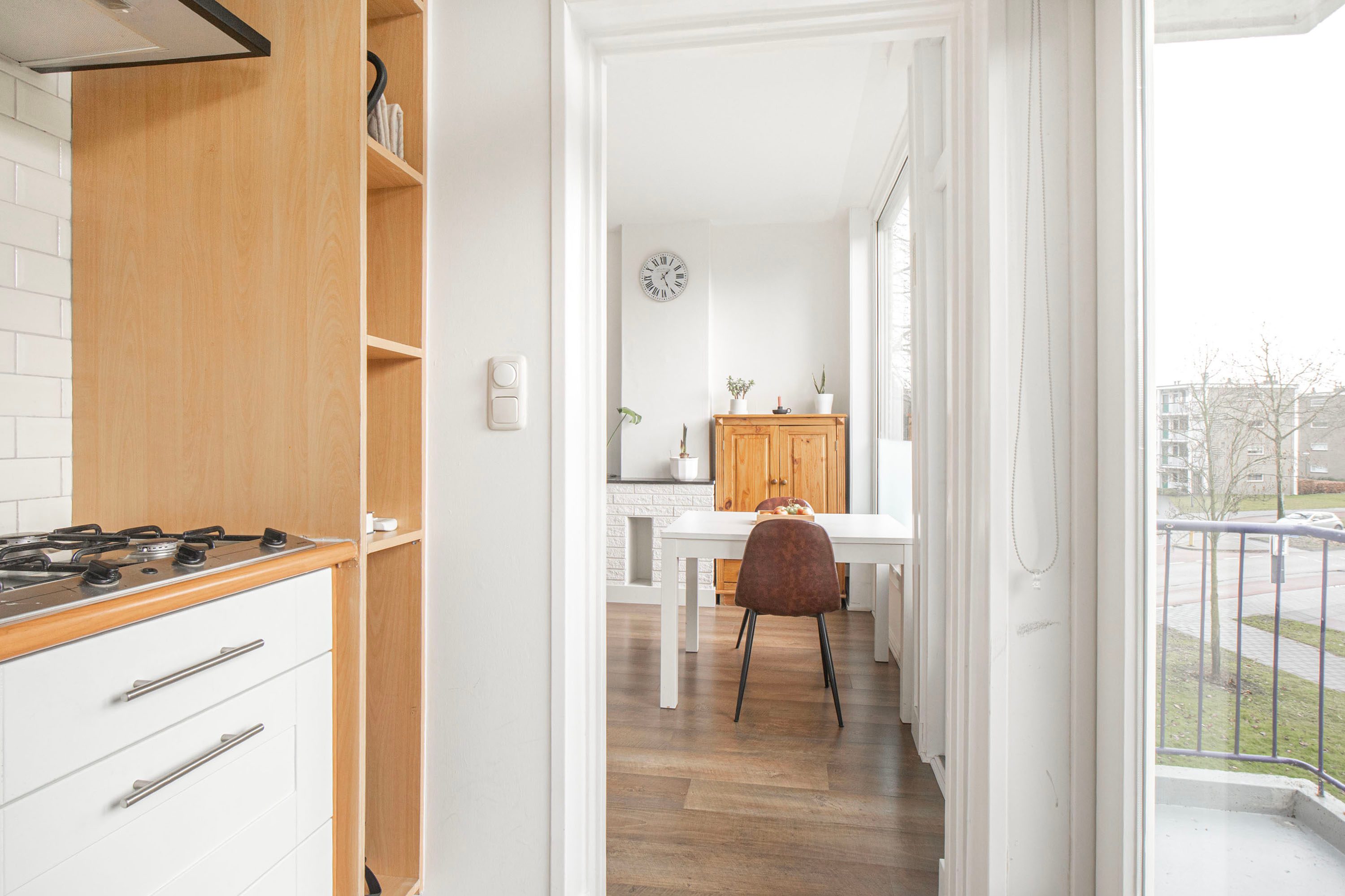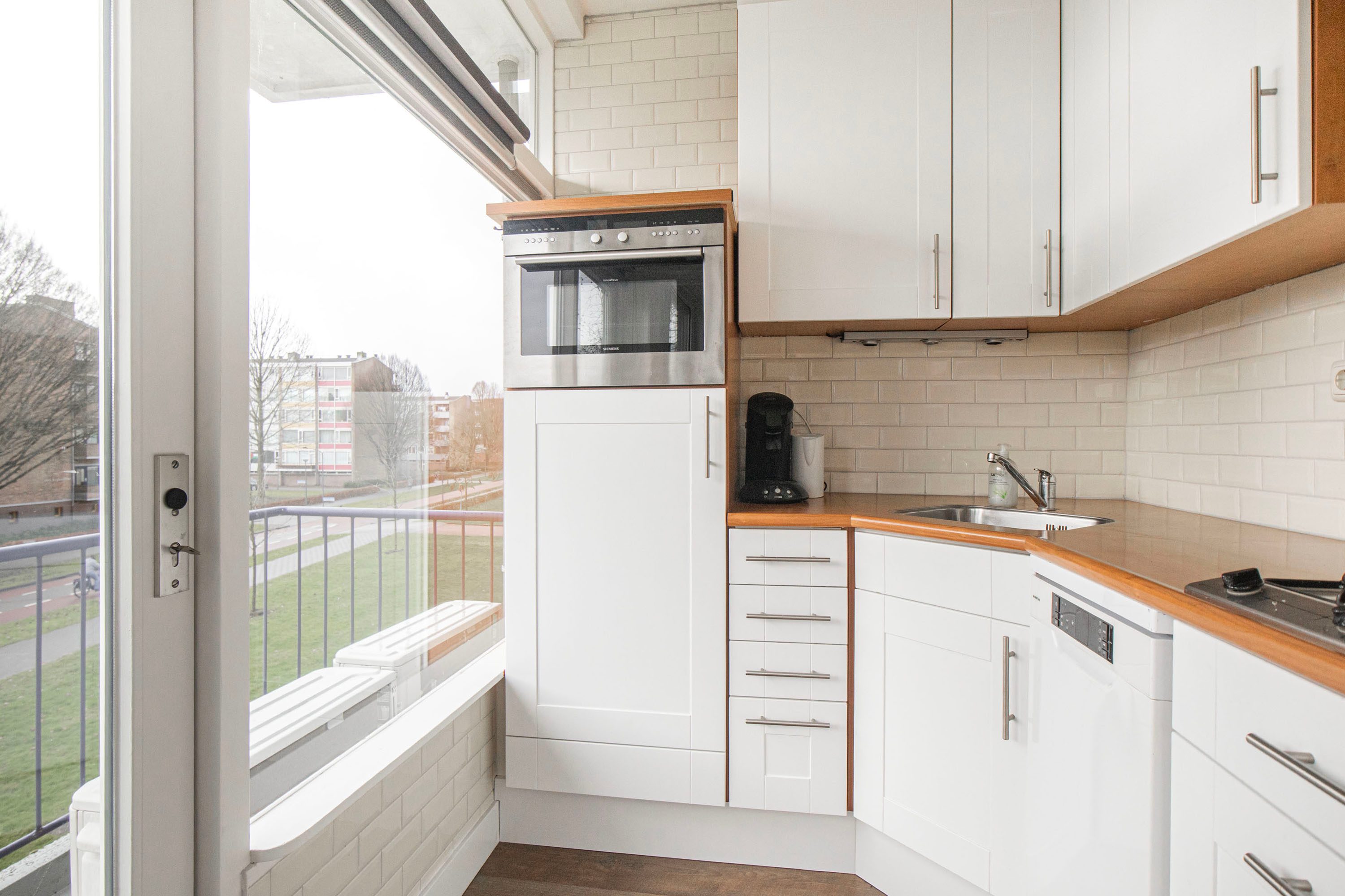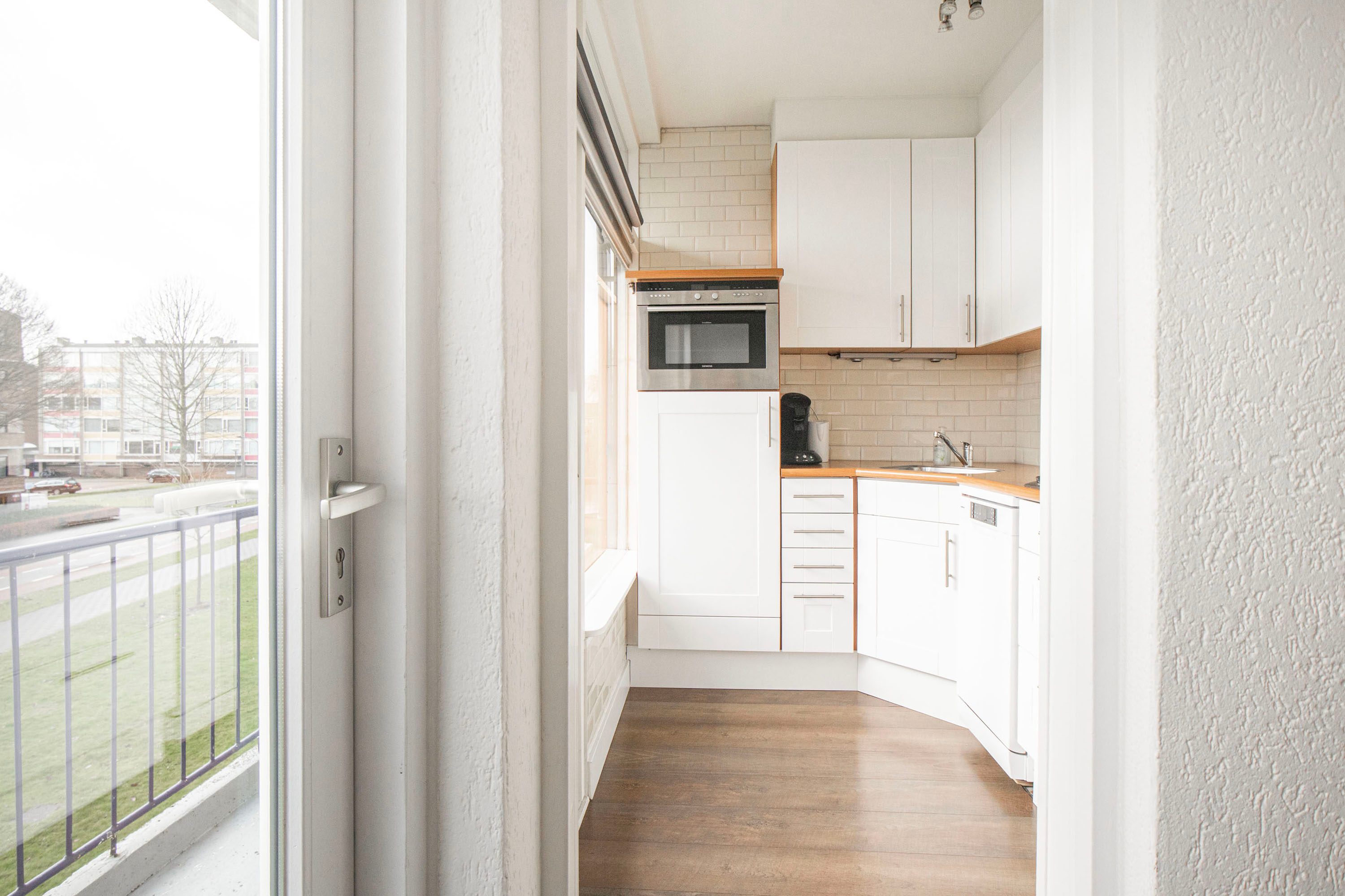 Via de centrale entree bereik je het appartement. Vanuit de hal zijn alle vertrekken toegankelijk, wat zorgt voor een praktische indeling. De woonkamer is heerlijk licht dankzij de grote ramen en biedt een mooi uitzicht op het omliggende groen. De woonkamer wordt verwarmd en gekoeld door een airconditioning. De keuken is functioneel ingericht en voorzien van diverse inbouwapparatuur. Hier heb je een fijn en vrij uitzicht.