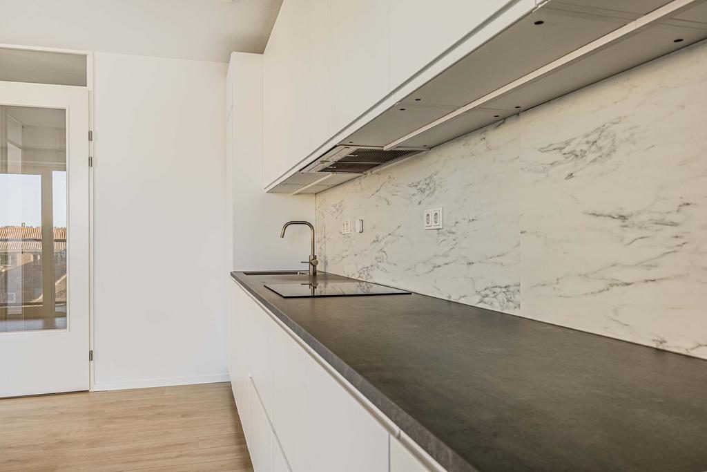 Het appartement is voorzien van een luxe inbouwkeuken. Uiteraard is de keuken uitgerust met luxe inbouwapparatuur, te weten; vaatwasser, inductie kookplaat, koelkast, vrieskast en combi-magnetron. De keuken beschikt over veel kastruimte.