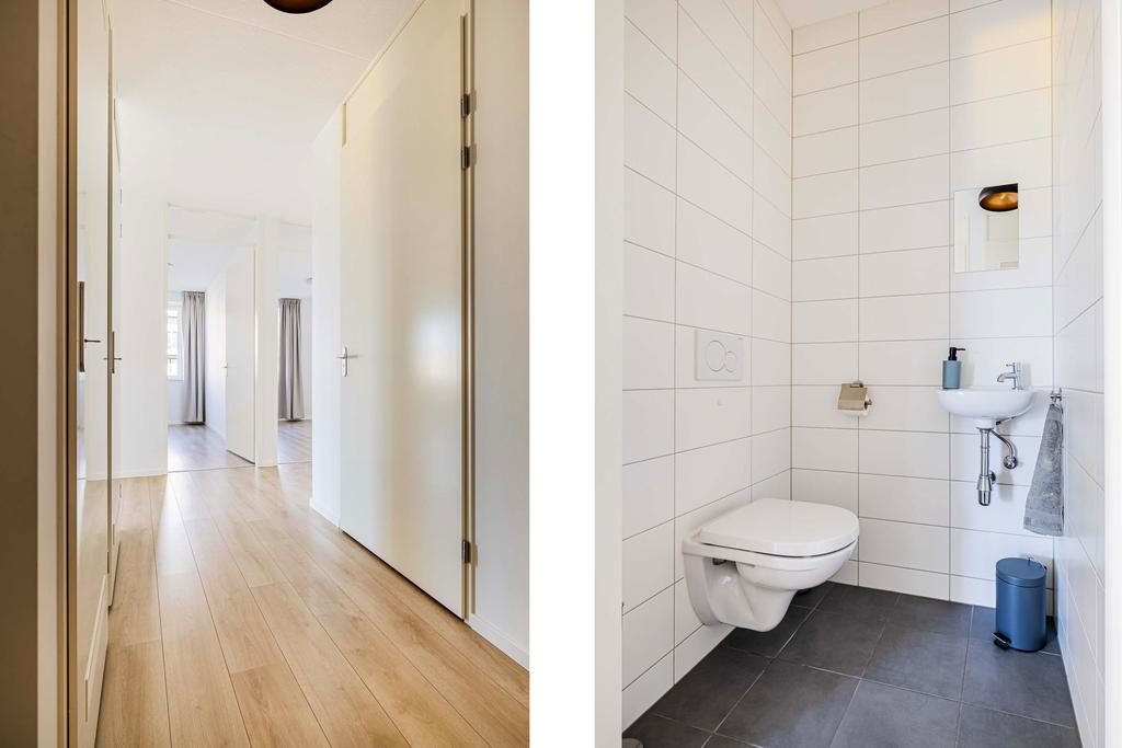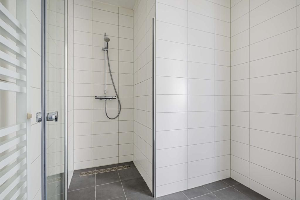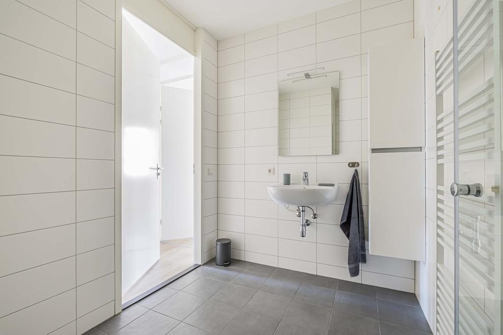 De badkamer is geheel betegeld in wit en antraciet kleurstelling en is ingericht met een ruime douchehoek, een wastafel met spiegel en een design radiator. De separate toiletruimte is eveneens geheel betegeld. De toiletruimte is afgewerkt met een hangend toilet en fonteintje in de zelfde kleurstelling als de badkamer.