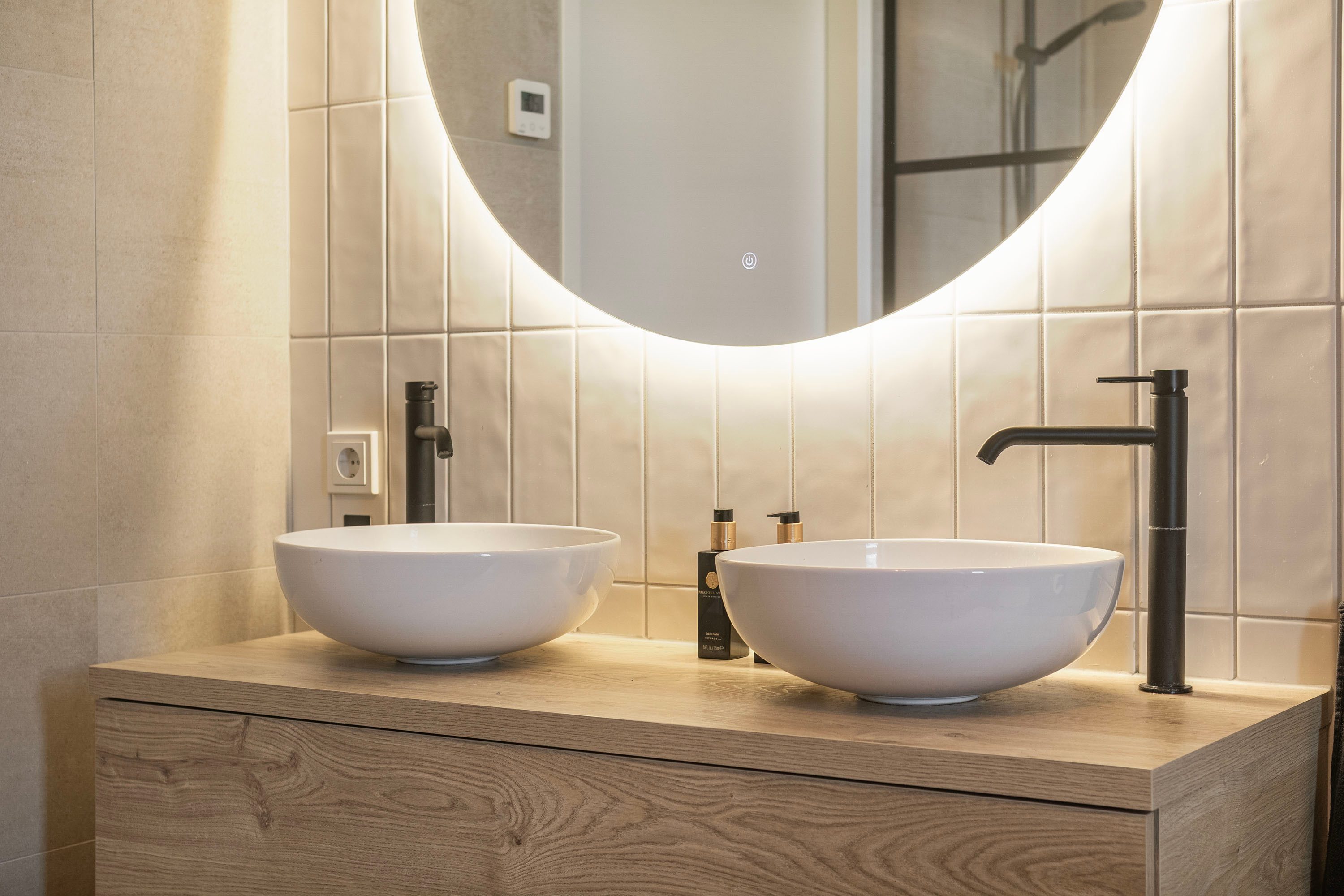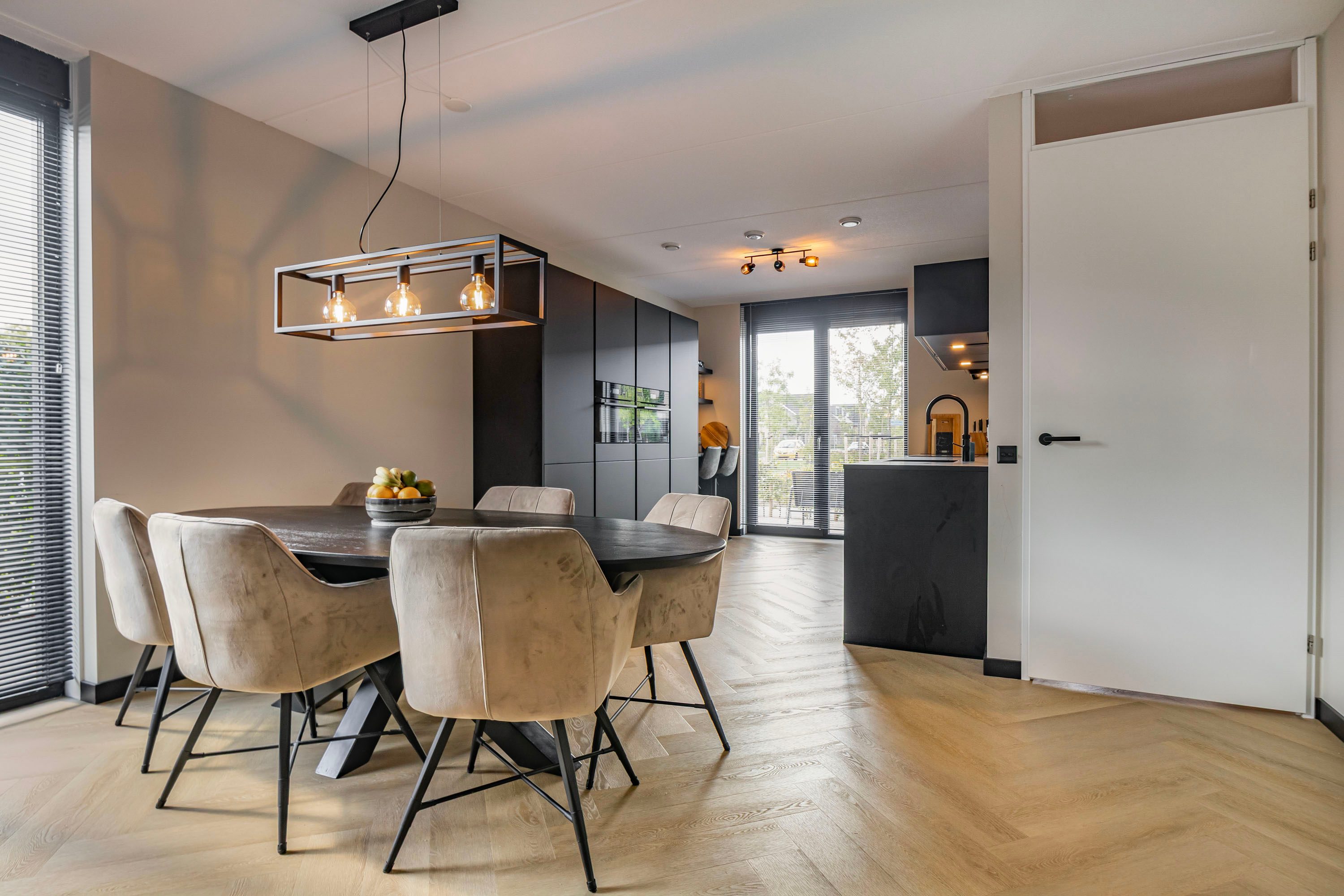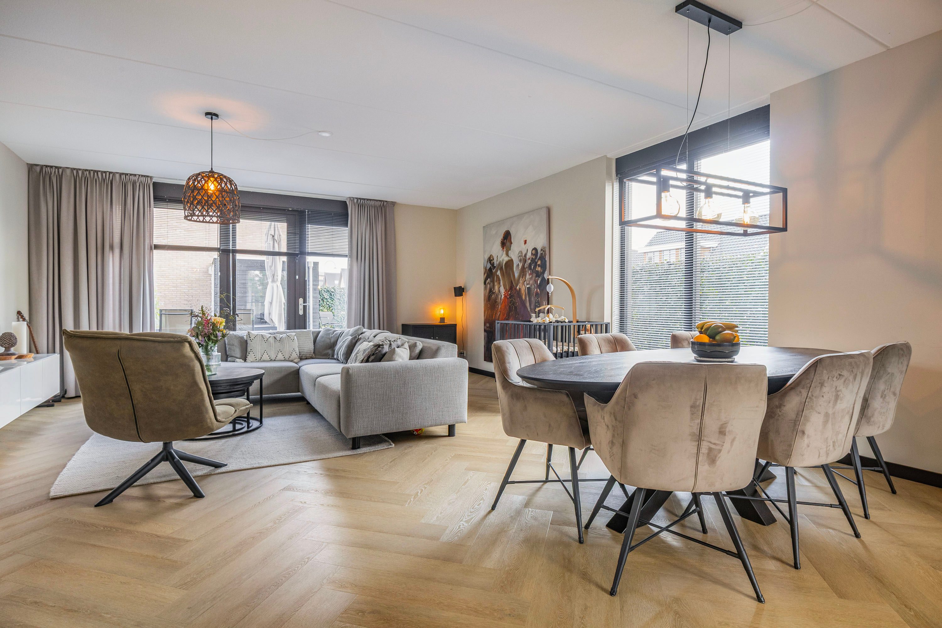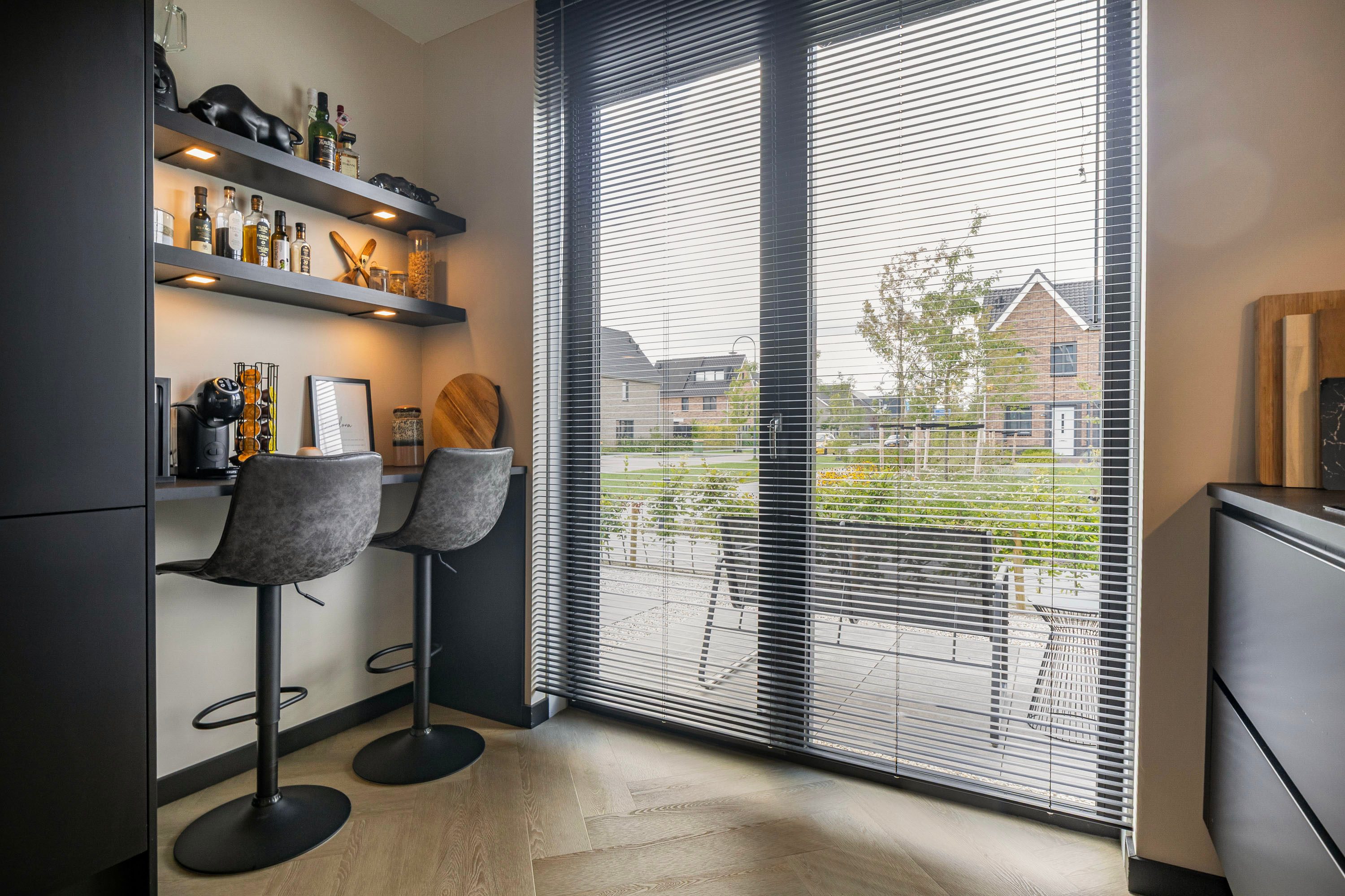 De woonkamer is ruim, breed (5.40 m) en tuigericht. Een heerlijk plek om te zitten! Via de openslaande tuindeuren is de zonnige en zeer verzorgd aangelegde achtertuin te bereiken. Centraal gelegen bevind zich het eetgedeelte met ruimte voor een riante eettafel. De open keuken is het stoere hart van het huis: matzwarte fronten, strak lijnenspel en voorzien van álle denkbare inbouwapparatuur. Denk o.a. aan een vaatwasser, koel-vriescombinatie, Quooker, stoomoven én combi-oven, inductie kookplaat met strakke afzuigkap, plus een wijnklimaatkast voor je mooiste flessen. Koken, borrelen, leven—het kan hier allemaal. De begane grond is volledig afwerkt met een PVC visgraatvloer, gladde wanden, vloerverwarming en vloerkoeling.