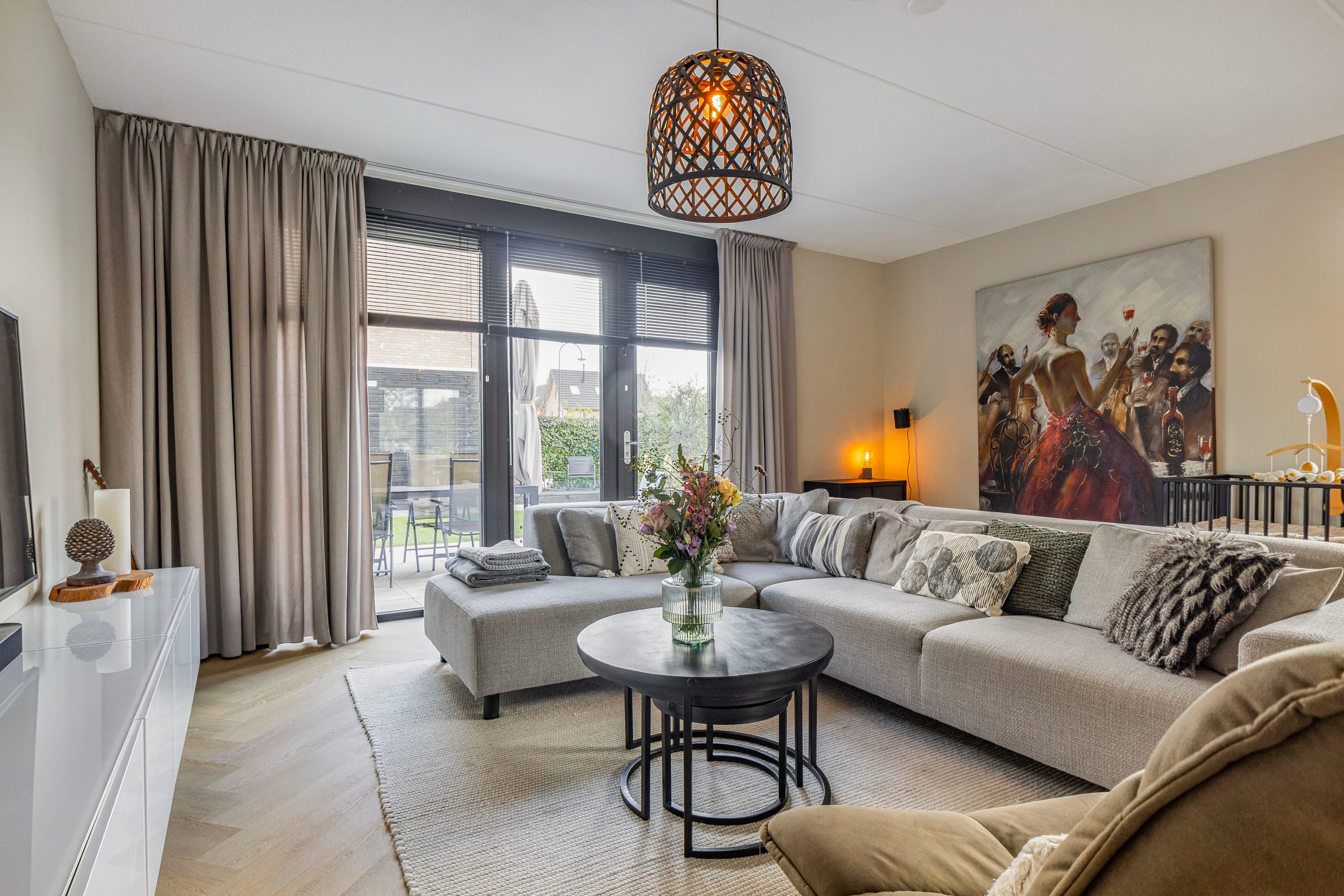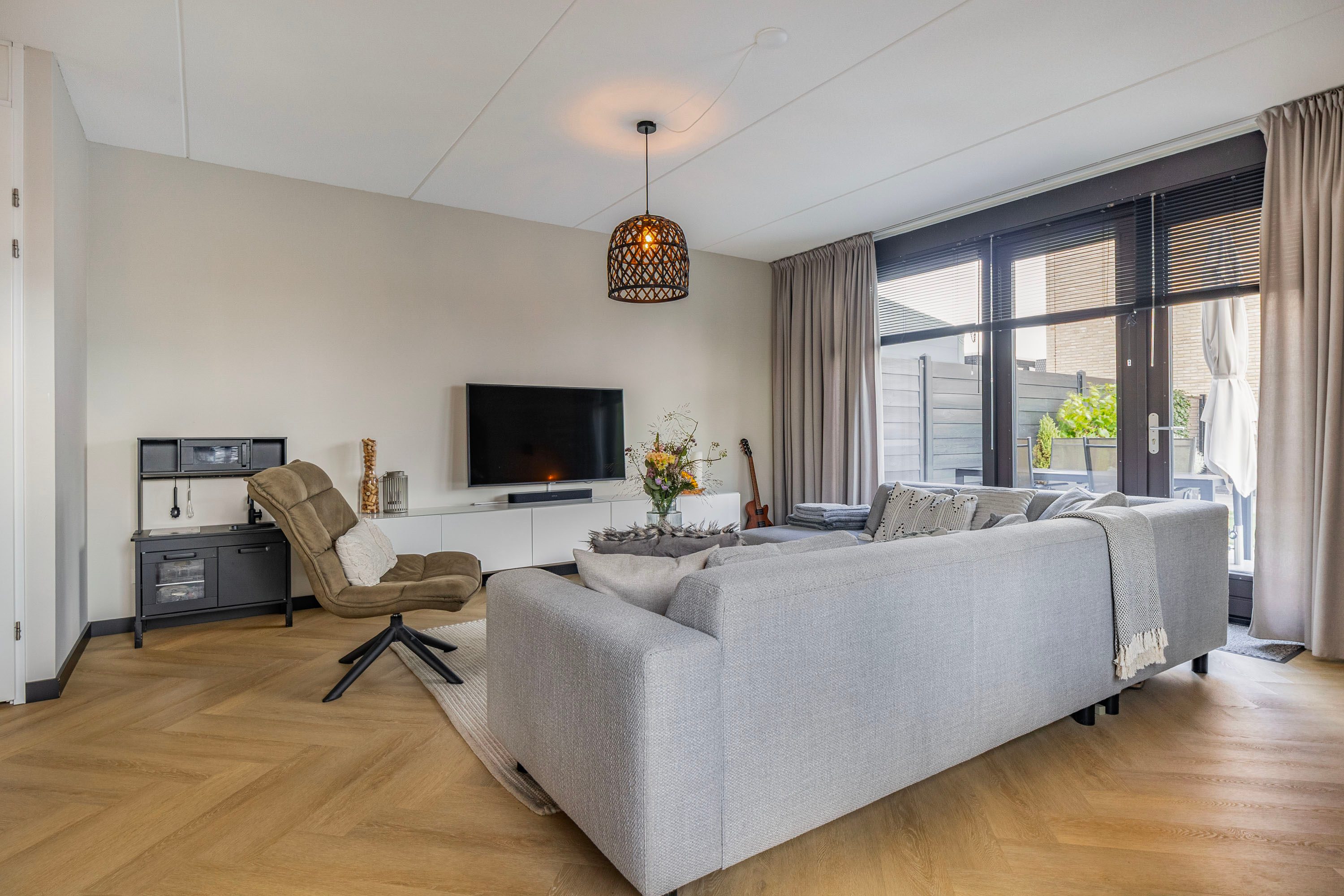 Via de entree kom je bij de hal met meterkast, garderoberuimte, toilet (zwevend) met fonteintje, trap naar de eerste verdieping en deur naar de living. De tuingerichte woonkamer is heerlijk licht en groot genoeg voor een ruime hoekbank plus een gezellige zithoek.