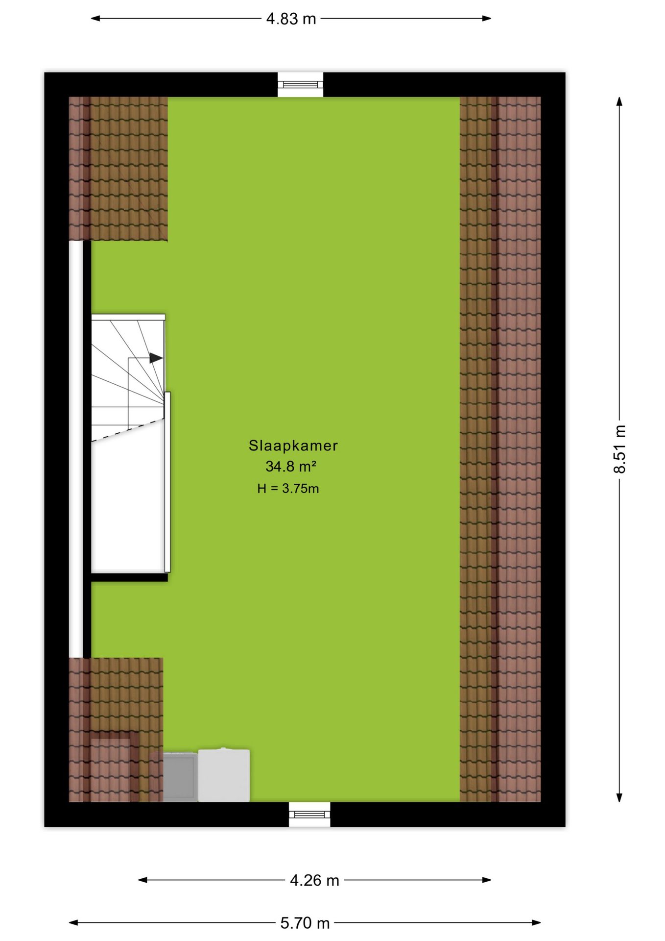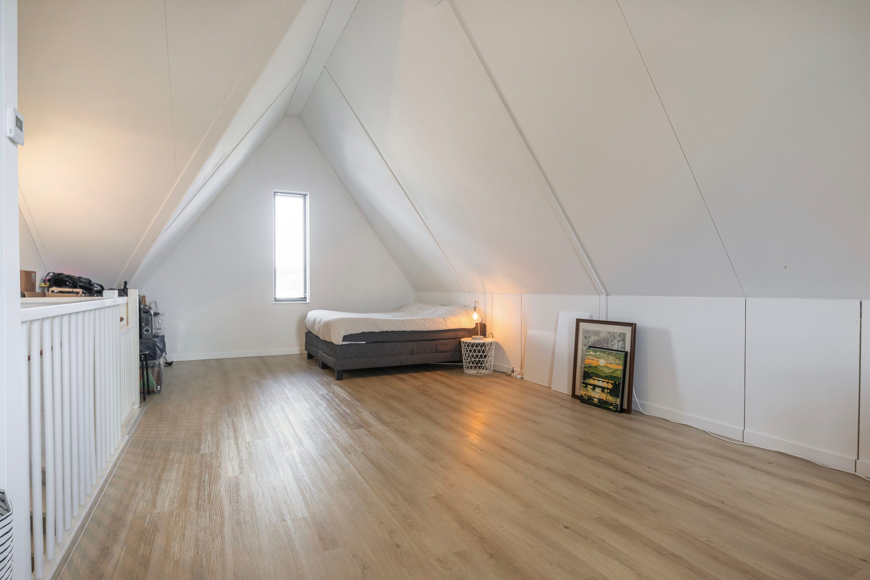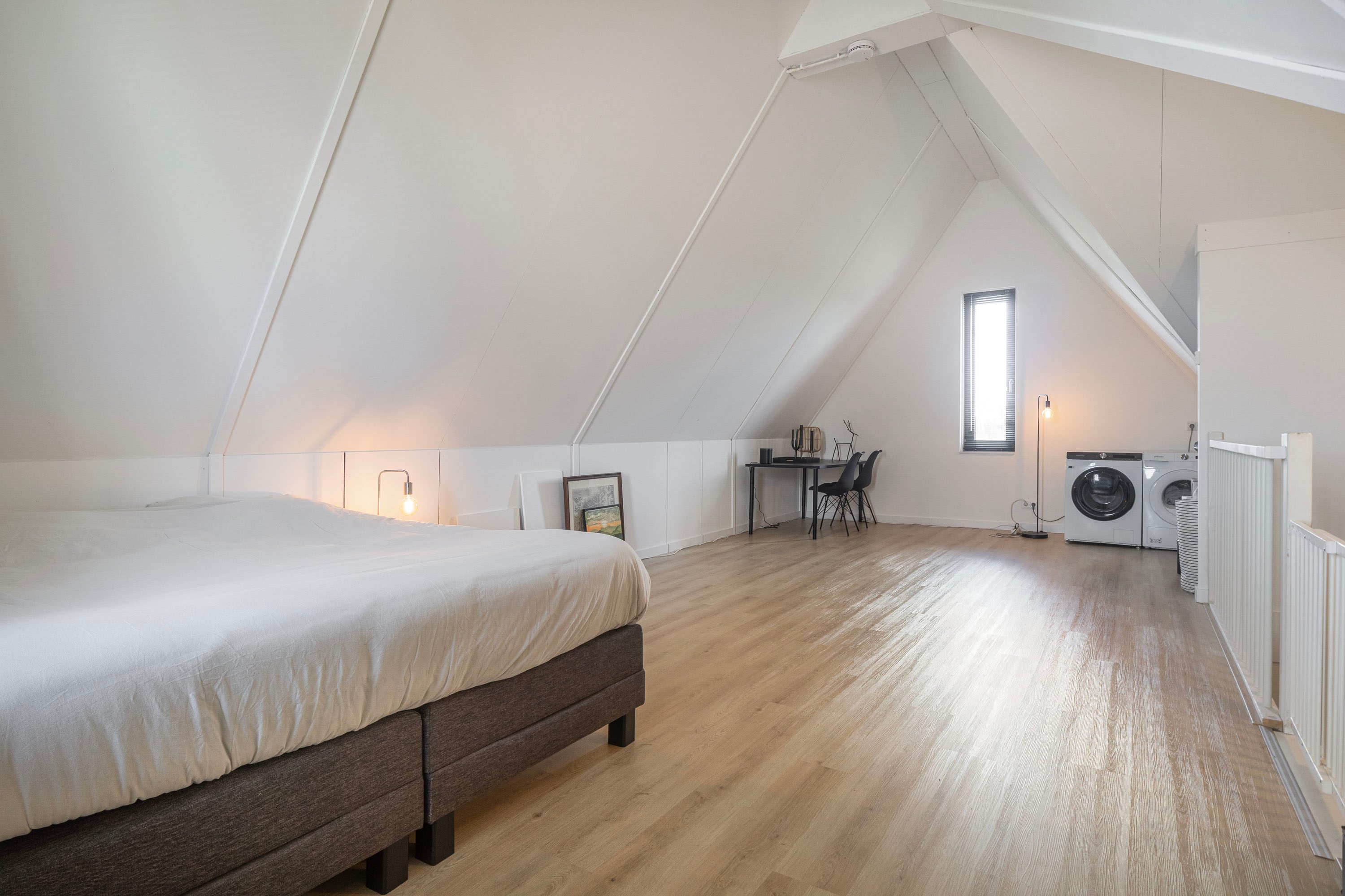 Via de vaste trap bereik je de 2e verdieping met een open indeling. Deze kan als vierde slaapkamer dienen of als een werk/sportruimte. Ook in te delen naar vierde én vijfde slaapkamer met een apart was/berg hok. Kortom: naar wens te gebruiken en/of in te delen. De aansluitingen voor wasmachine en/of droger bevinden zich hier ook.