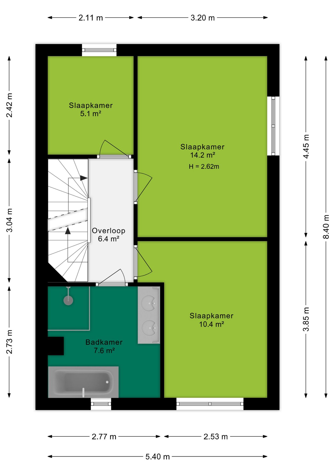 Door middel van de vaste trap kom je op de eerste verdieping, hier loopt de visgraatvloer stijlvol door naar alle drie de slaapkamers. De drie slaapkamers zijn 5,1 m², 10,4 m² en 14,2 m² groot. Twee slaapkamers zijn gelegen aan de achterzijde van de woning en bieden je fijn uitzicht op de verzorgde achtertuin. De master bedroom beschikt tevens over een zijraam waardoor je over zeer veel daglichttoetreding beschikt. De derde slaapkamer is samen met de badkamer gelegen aan de voorzijde van de woning. Ook vanuit deze slaapkamer heb je prettig uitzicht over de voorgelegen groenstrook met kinderspeeltoestellen. Ideaal om je kinderen in de gaten te houden. De badkamer is modern en hotelwaardig: een ligbad voor de relaxmomenten, een ruime inloopdouche, tweede toilet, een strak wastafelmeubel met dubbele wastafel. Ook in de badkamer beschik je over vloerverwarming met koelfunctie. Hoe fijn om het hele jaar door comfort in huis te hebben!