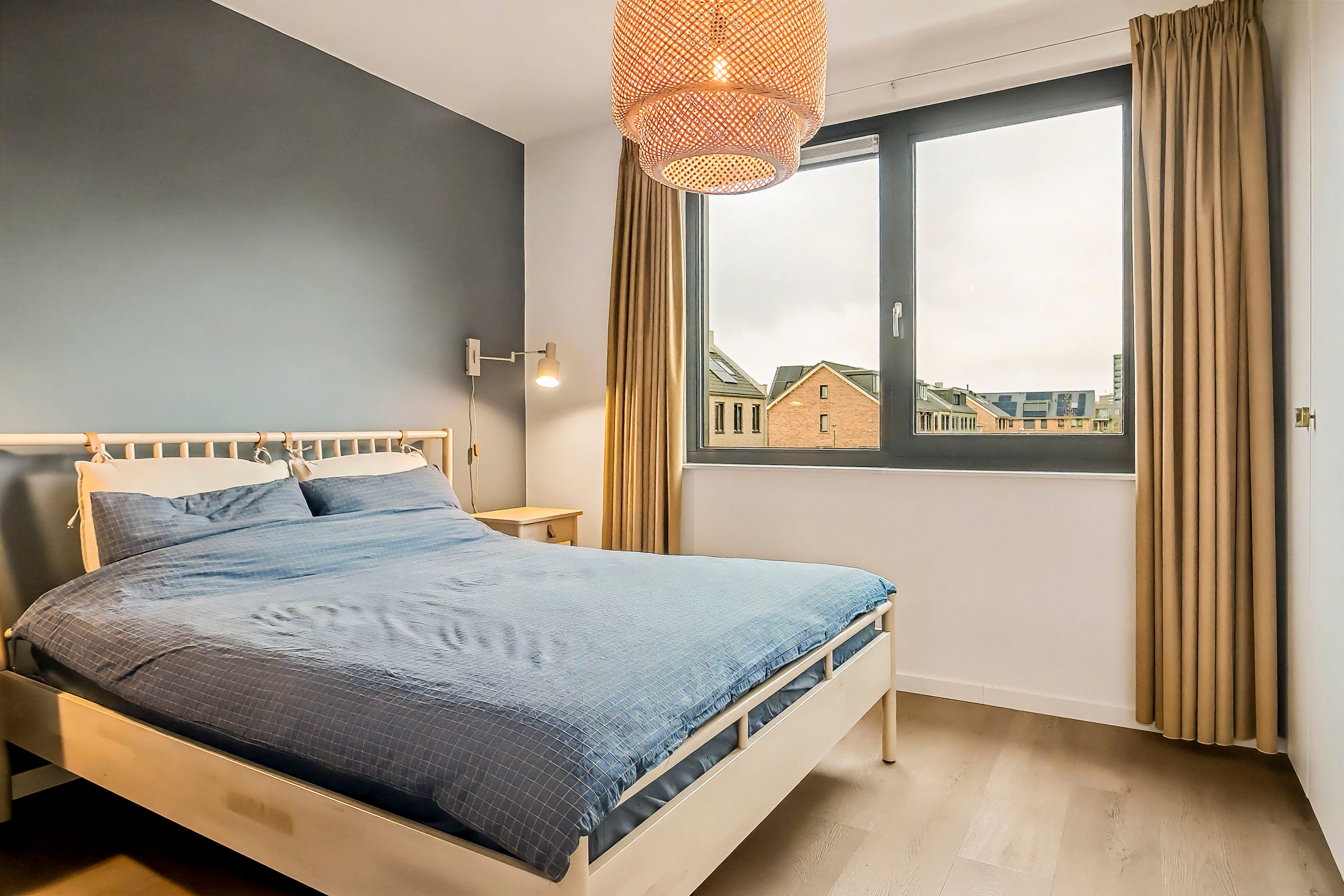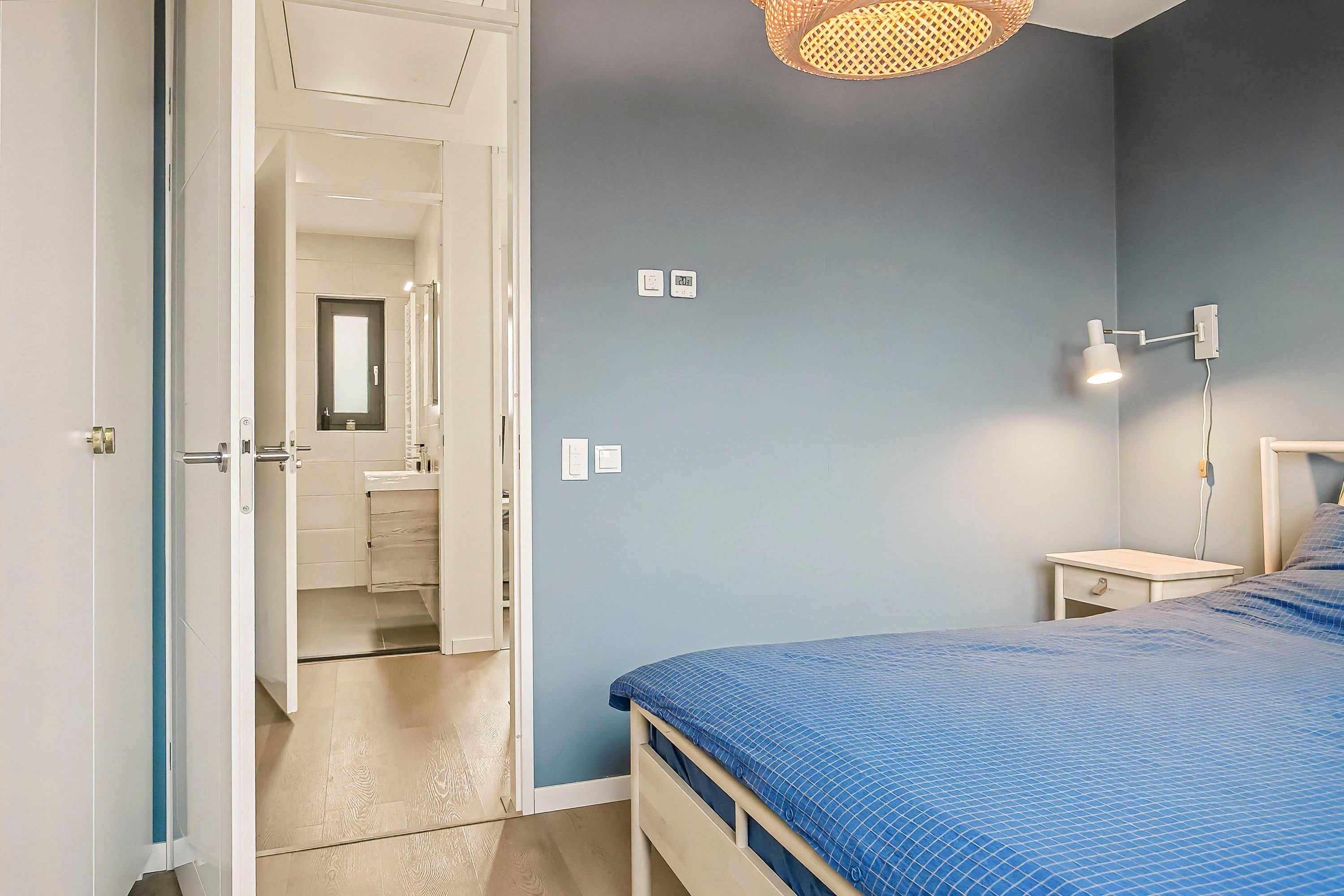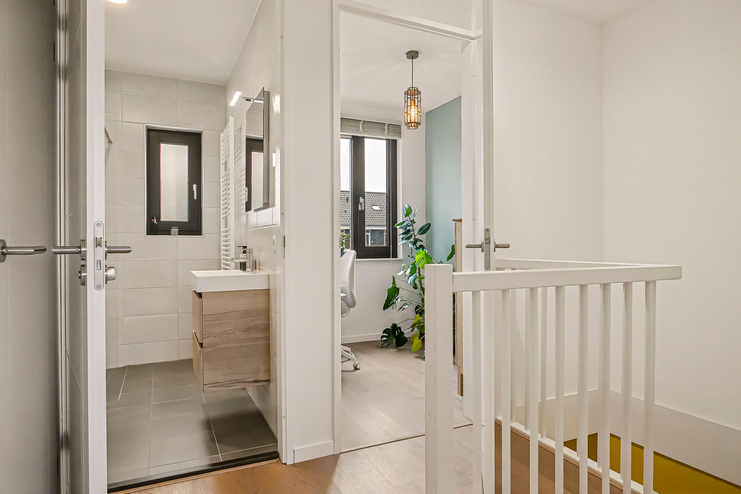 Aan de overloop grenzen 2 slaapkamers, de badkamer en een kastenwand. De slaapkamers zijn door de rechte wanden en de oppervlaktes van 12 m² en 5 m² praktisch in te richten. De nette badkamer is voorzien van een wastafelmeubel en spiegel, een inloopdouche met glazen scheidingsscherm en een elektrische handdoekenradiator. Net als in de toiletruimte op de begane grond vormen ook hier de witte wandtegels en de antracietkleurige vloertegels een neutrale en tijdloze basis. In de kastenwand vind je de aansluiting voor de wasmachine en de unit van de mechanische ventilatie. Ook de eerste verdieping is afgewerkt met een nette en lichte (click) PVC vloer.