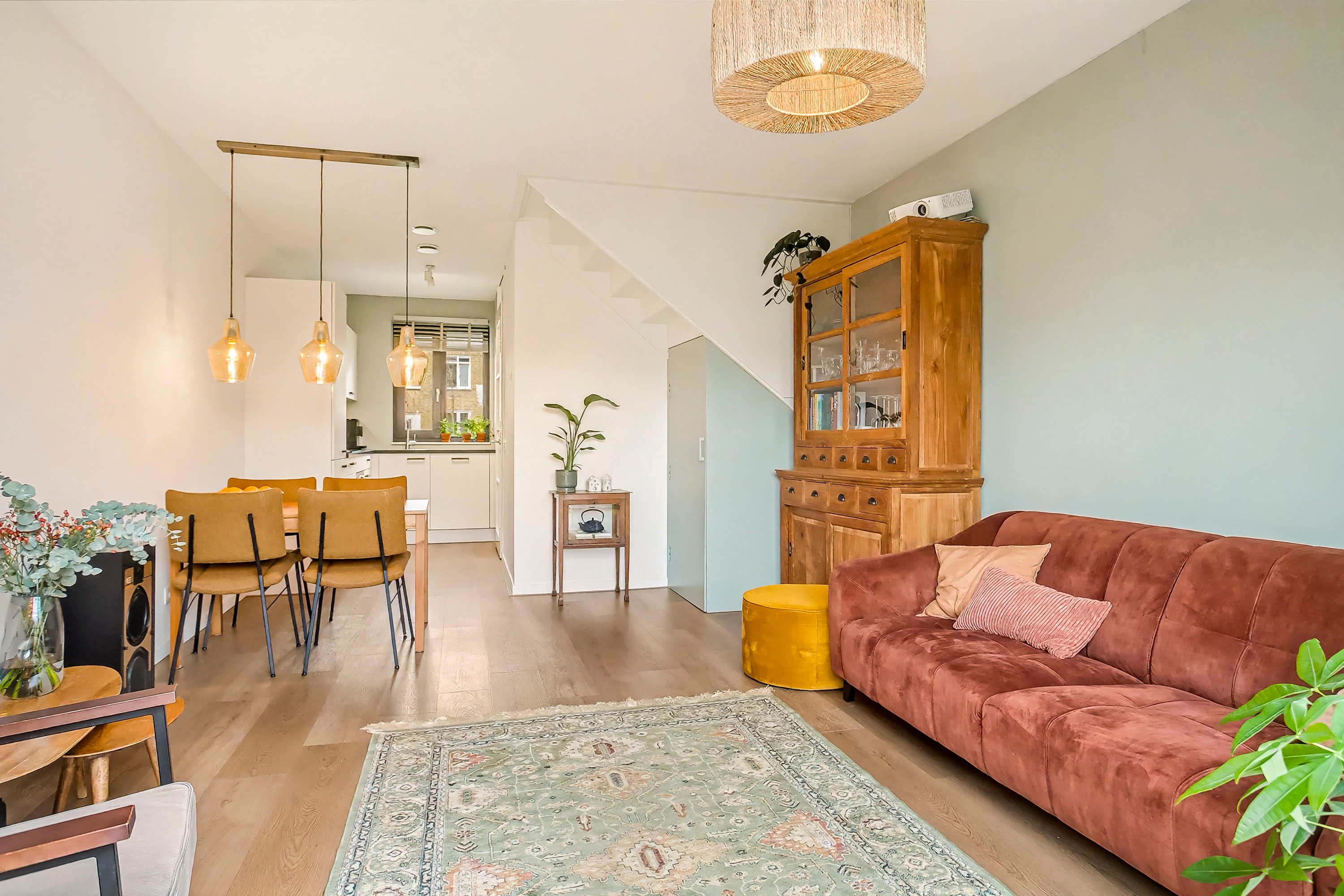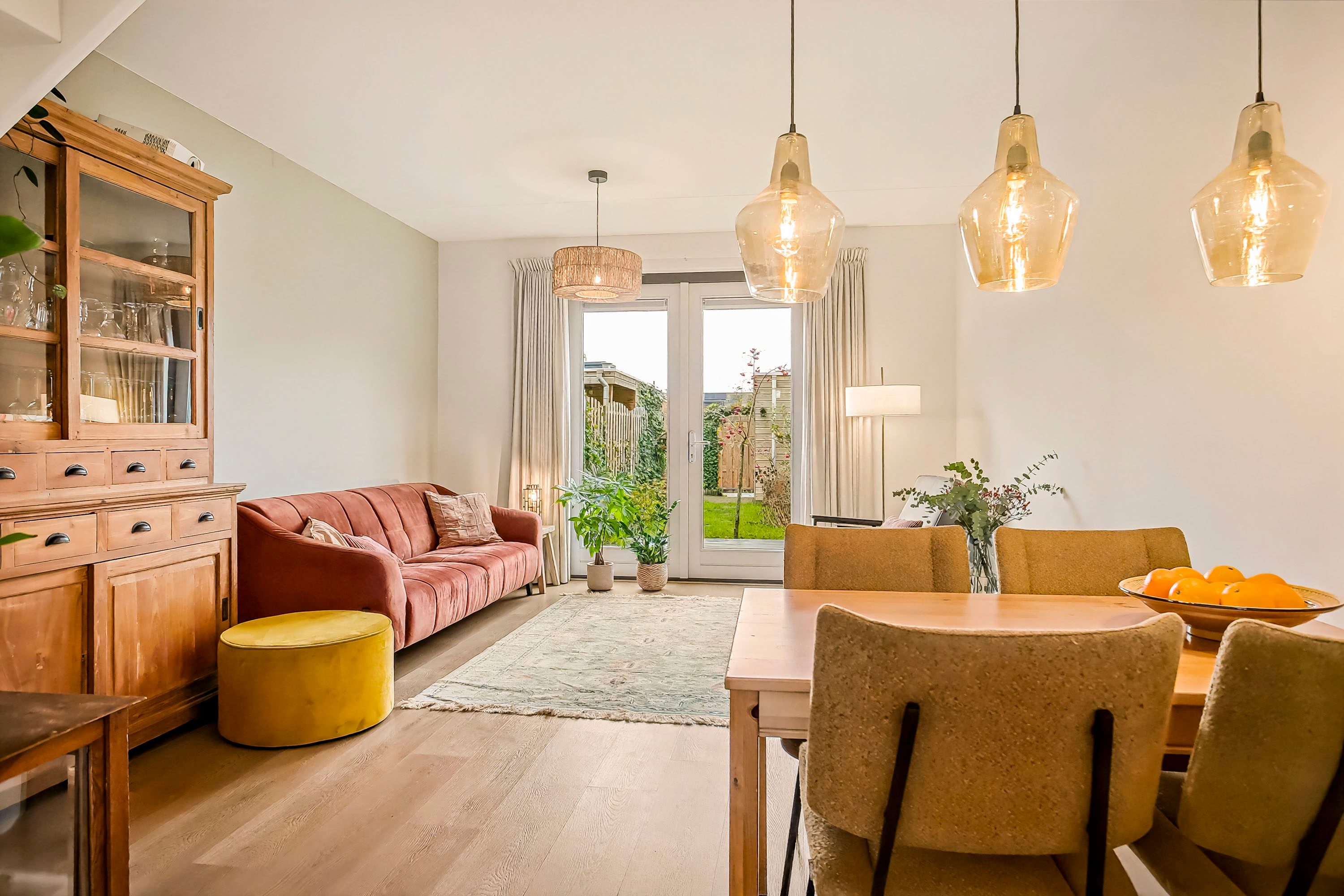 Vanuit de hal is er toegang tot de woonkamer. Deze heeft een prettige lichtinval en is voorzien van openslaande deuren naar de achtertuin. Door de uitbouw van 1.2 meter heb je een fijne zithoek en ook nog voldoende ruimte voor de eettafel. De half open keuken is voorzien van een nette inbouwkeuken waar je de beschikking hebt over een inductie kookplaat, afzuigkap, combi-oven/magnetron, koelkast, vriezer en vaatwasser. De gehele begane grond (m.u.v. de toiletruimte) is voorzien van een lichte (click) PVC vloer.