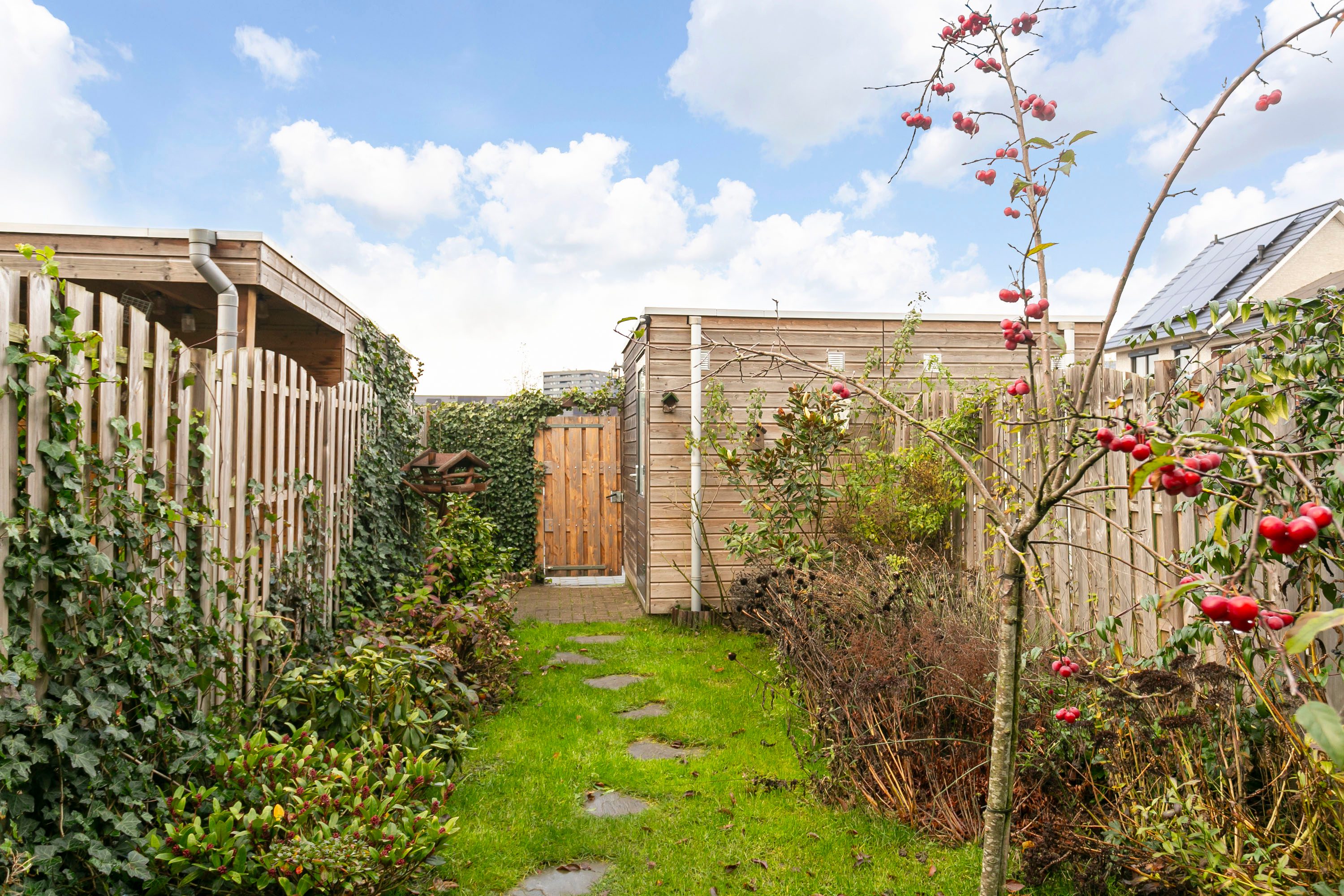 De diepe achtertuin heeft een situering op het noordwesten. De tuin is voorzien van een houten vlonder, bestrating en beplanting en achterin de tuin staat een houten berging. De poortdeur zorgt ervoor dat de tuin ook via het achtergelegen parkeerterrein bereikbaar is. De voortuin is ingericht met beplanting, bestrating en een pergola.