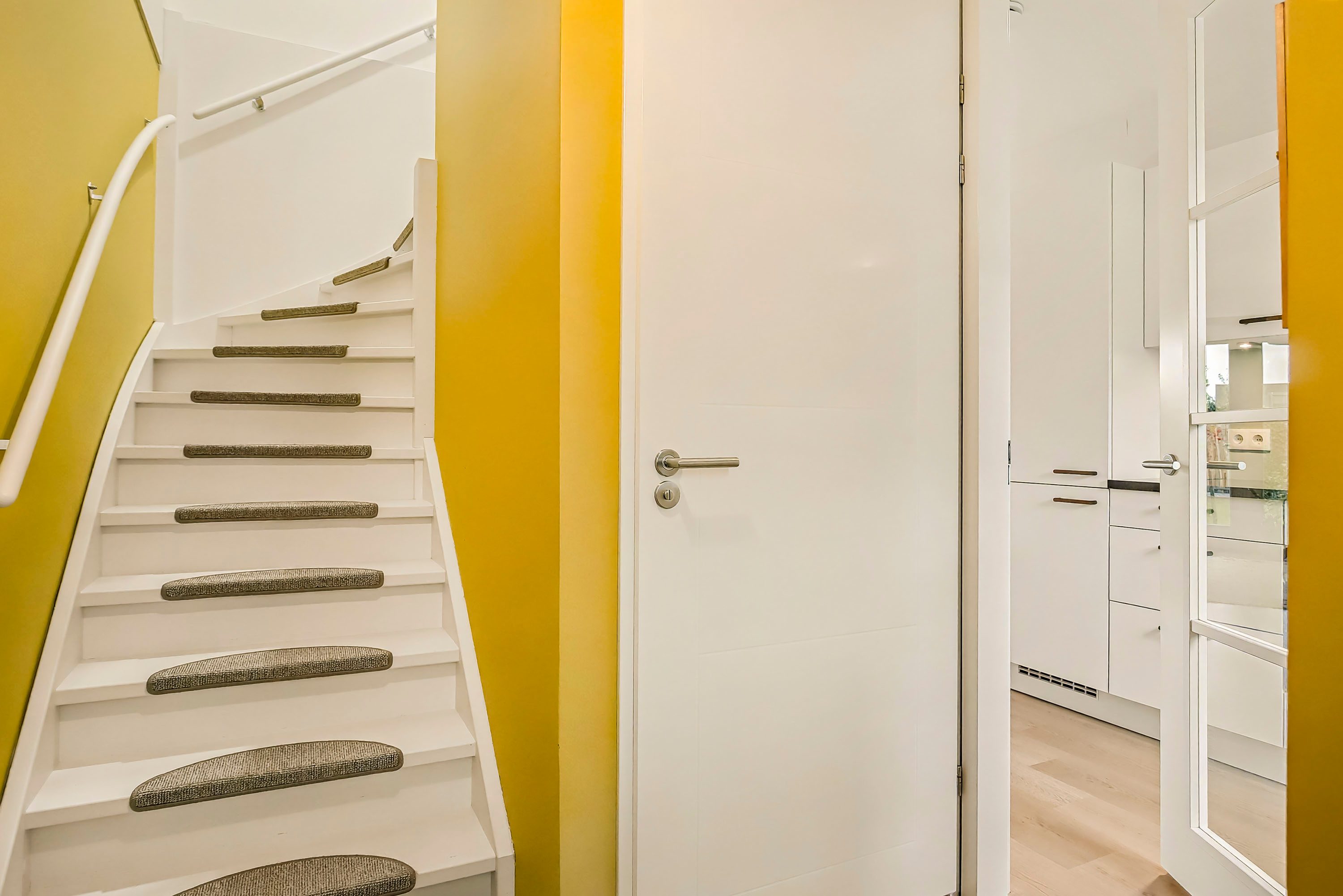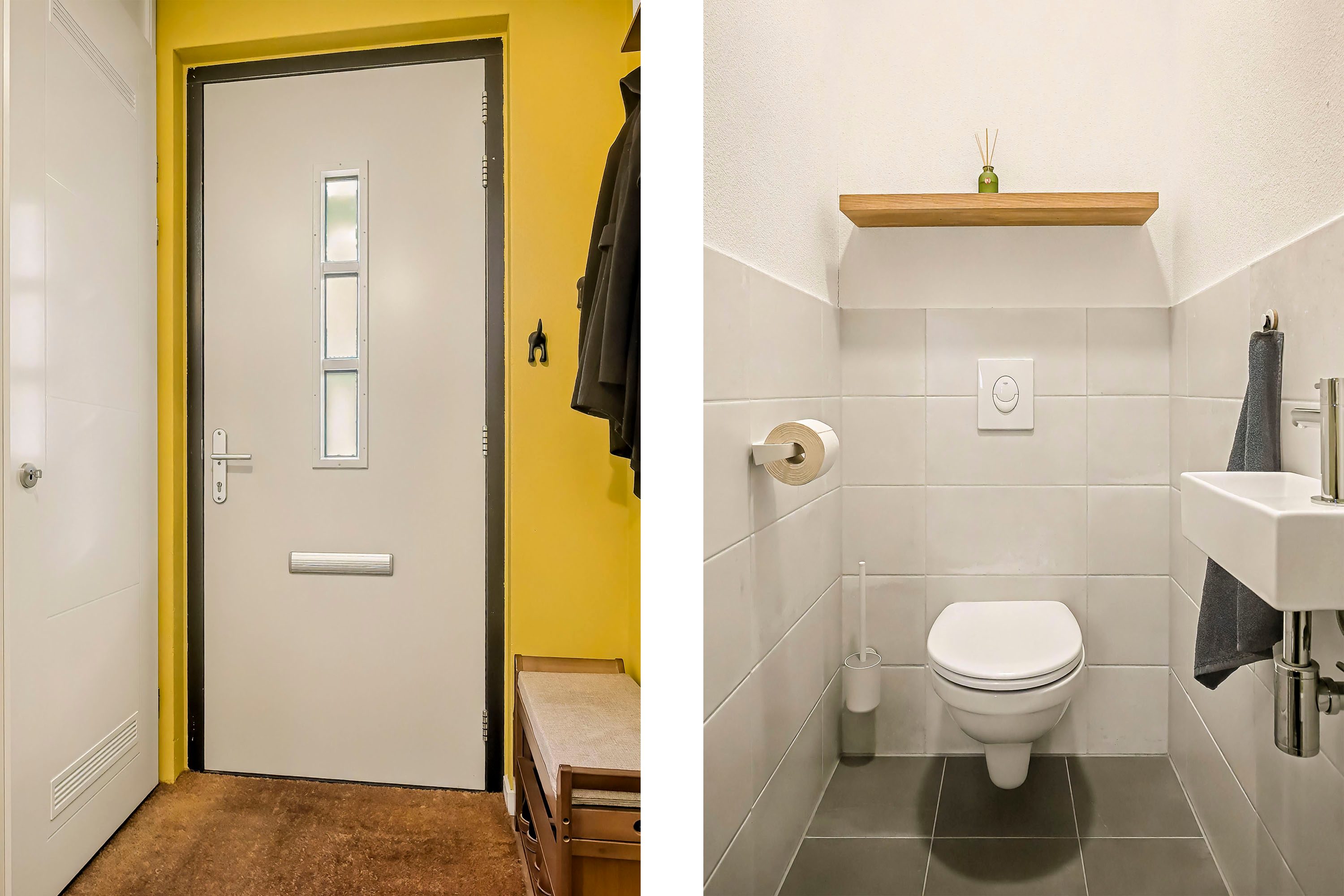 Je komt de woning binnen in de entreehal met meterkast, trapopgang en de toiletruimte. De toiletruimte is voorzien van een hangend toilet en een fonteintje en heeft met de witte wandtegels en antracietkleurige vloertegels een neutrale en tijdloze basis.