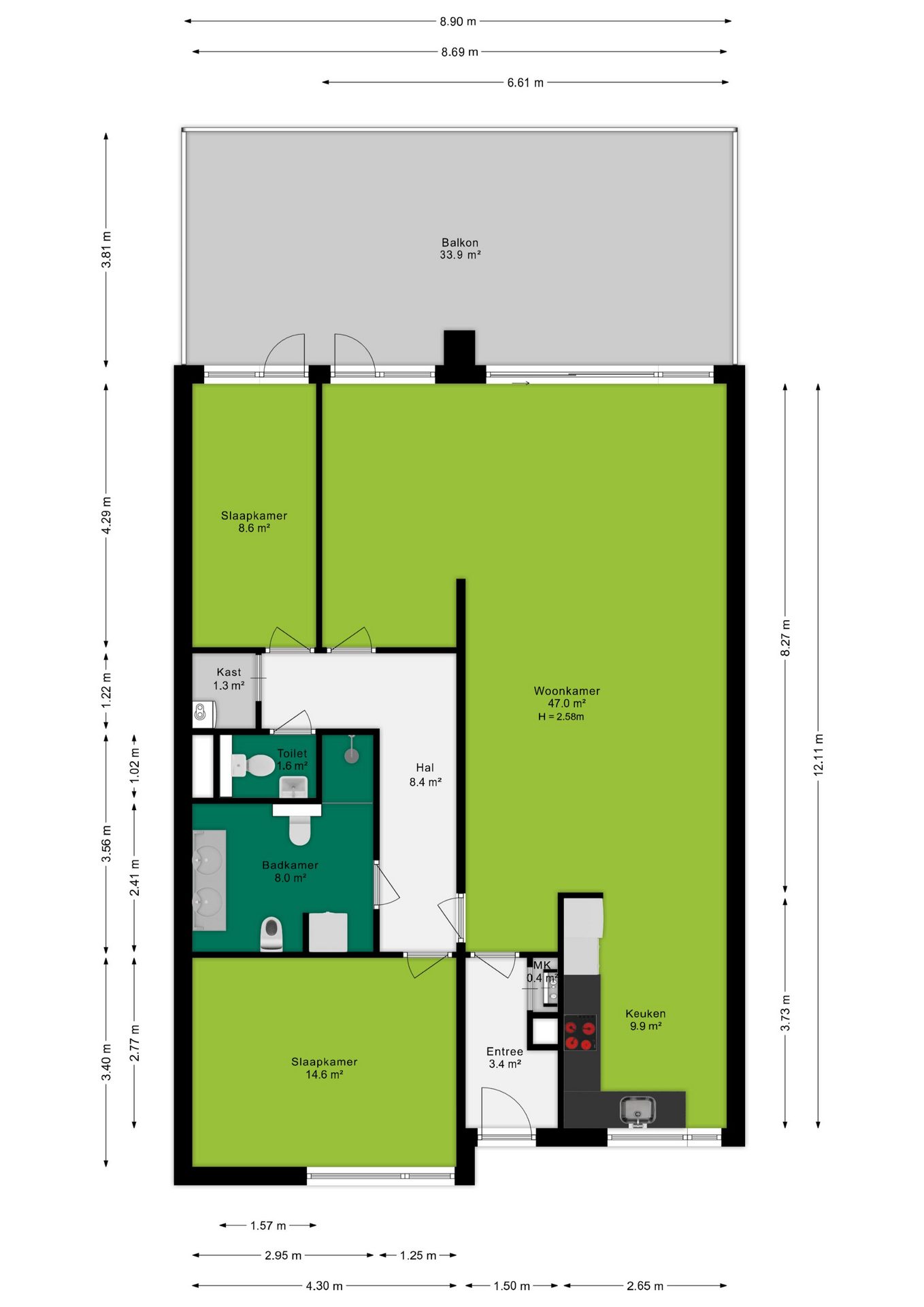 Via de entree betreed je het appartement, waar je ook de meterkast vindt. Vanuit de hal heb je toegang tot de riante woonkamer van 47m², met grote schuifpui die zorgt voor veel lichtinval en toegang biedt tot het riante balkon. De L-vormige woonkamer biedt bovendien de mogelijkheid om gemakkelijk een extra (derde) slaapkamer te realiseren. De open keuken in hoekopstelling is voorzien van inbouwapparatuur, zoals een keramische kookplaat, afzuigkap, vaatwasser en combi-oven.