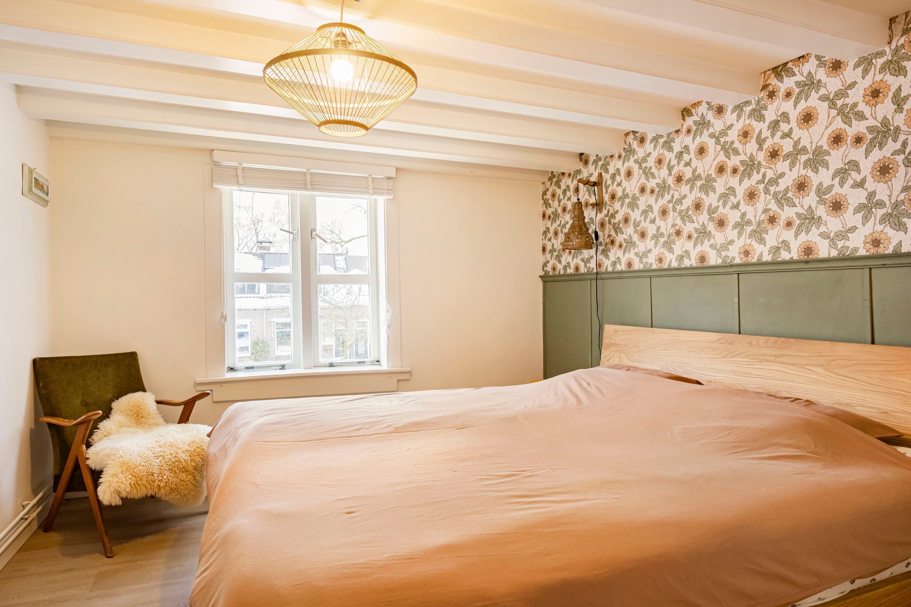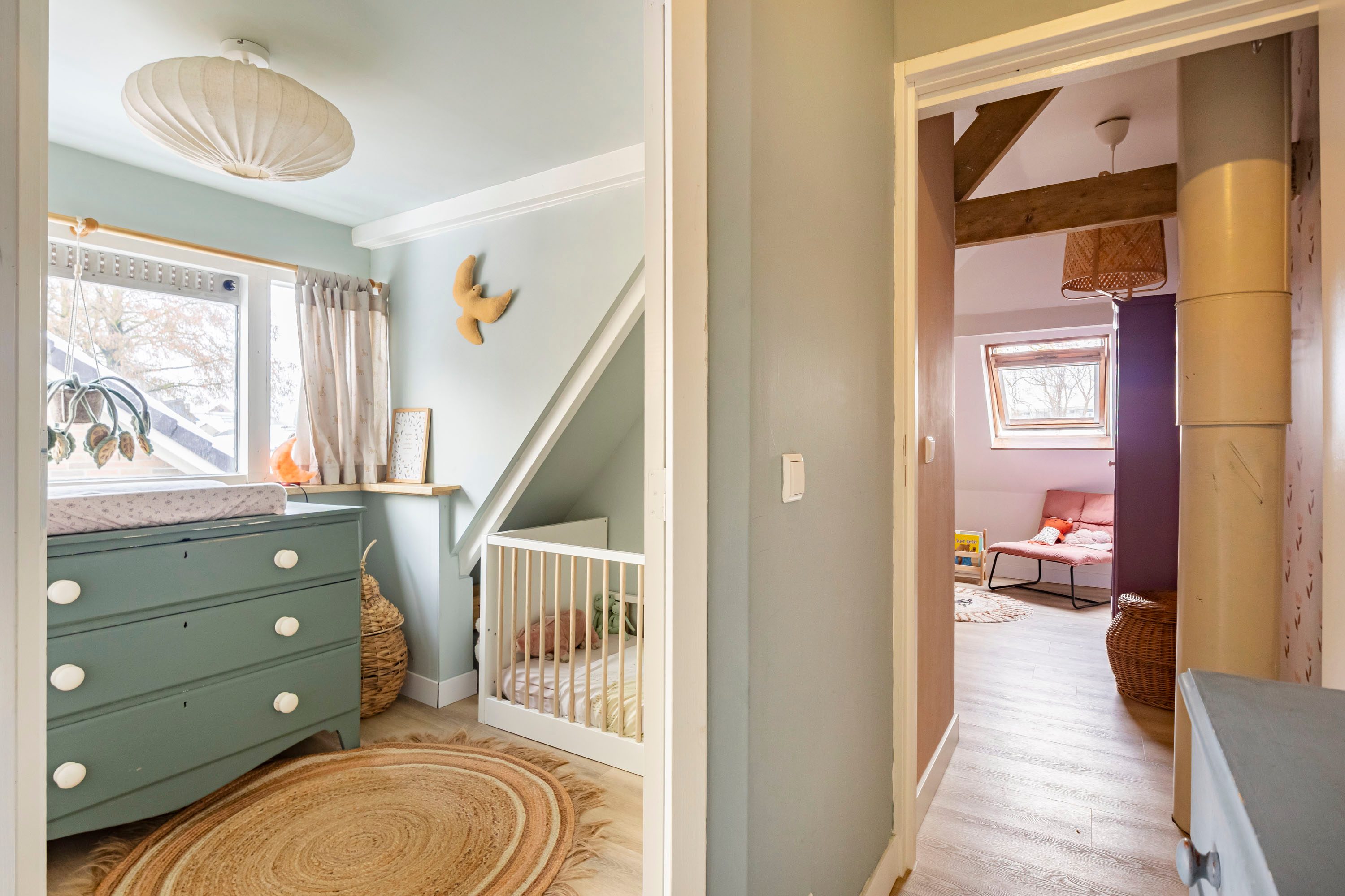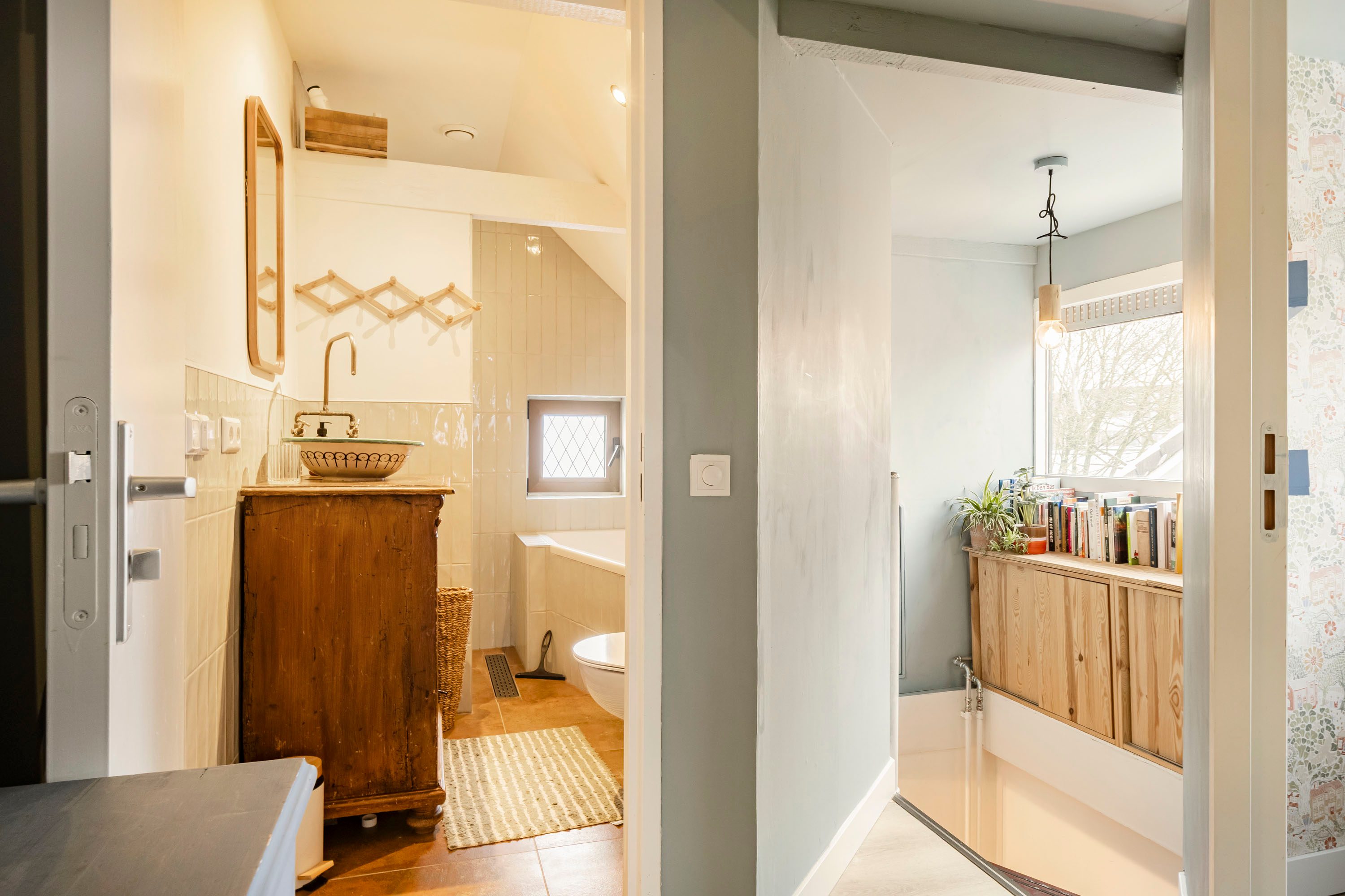 Via een vaste trap bereik je de tweede verdieping, waar zich nog twee slaapkamers bevinden van respectievelijk 4,5 m² en 6,3 m². De kleinste kamer is voorzien van een dakkapel (vernieuwd in 2023), terwijl de grotere kamer beschikt over een dakraam. Daarnaast bevindt zich op deze verdieping een in 2023 vernieuwde/gemoderniseerde badkamer van 3,1 m², die is voorzien van elektrische vloerverwarming en uitgevoerd in een speelse kleurstelling. De badkamer beschikt over een wastafelmeubel, inloopdouche, ligbad en toilet, wat zorgt voor optimaal comfort.