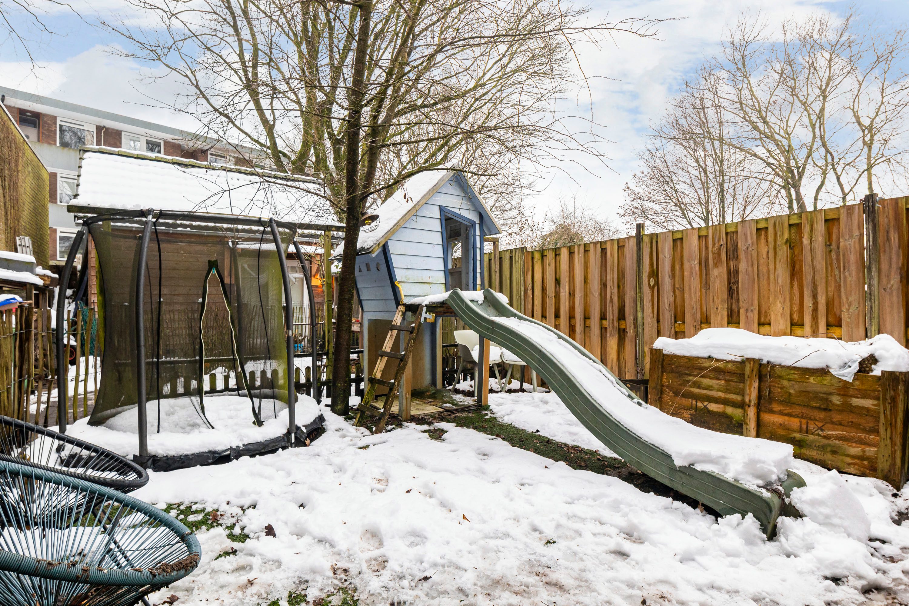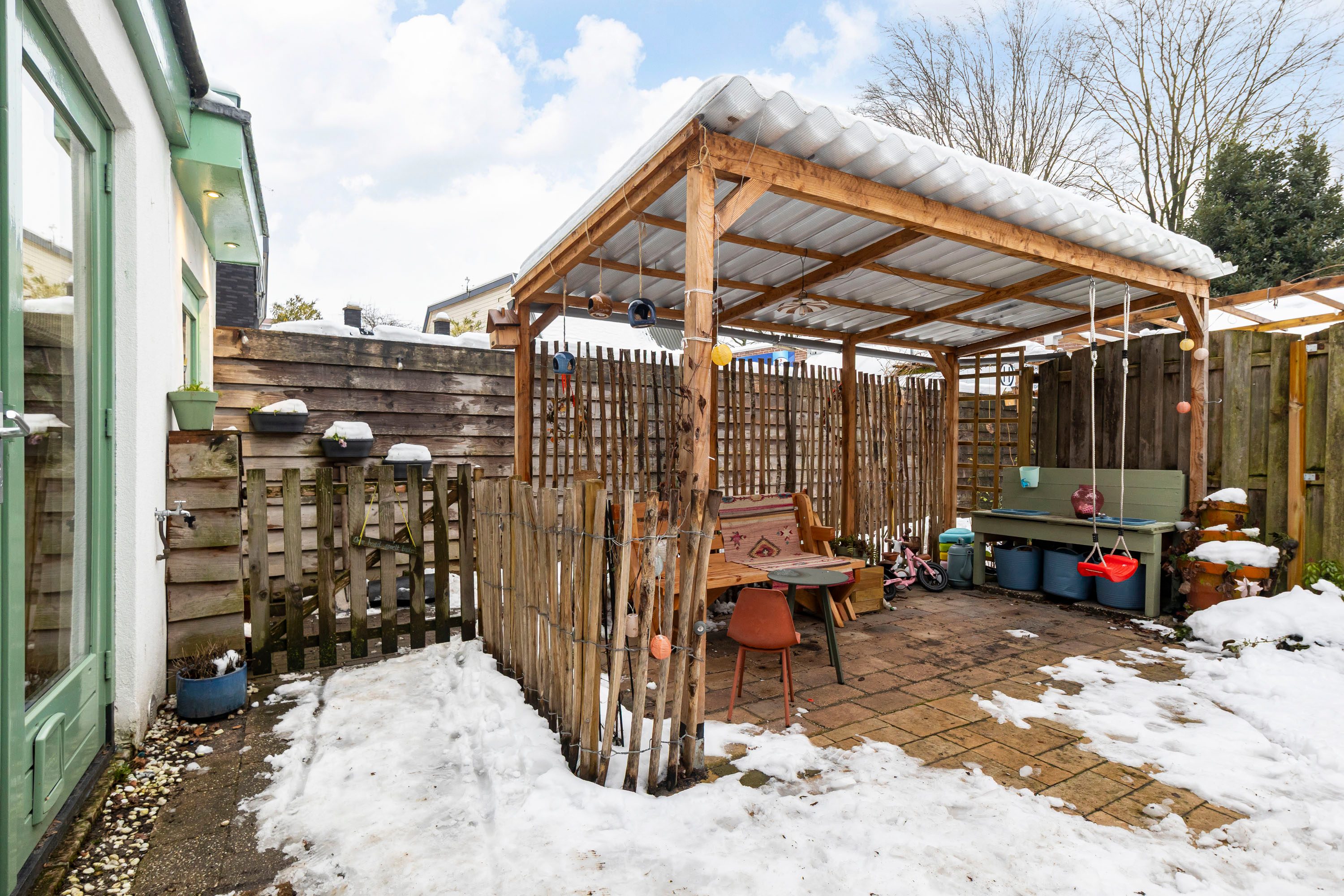 De zonnige achtertuinen zijn gelegen op het zuidwesten en bieden volop ruimte voor een gezellige loungehoek en een speelplek voor kinderen. Tevens is er een houten berging van 6,1 m², ideaal voor fietsen en tuingereedschap. De tuin is bovendien via de zijkant van de woning bereikbaar, wat extra praktisch is. Een gedeelte van de tuin is bereikbaar via het naastgelegen perceel, met een vastgelegd recht van overpad.