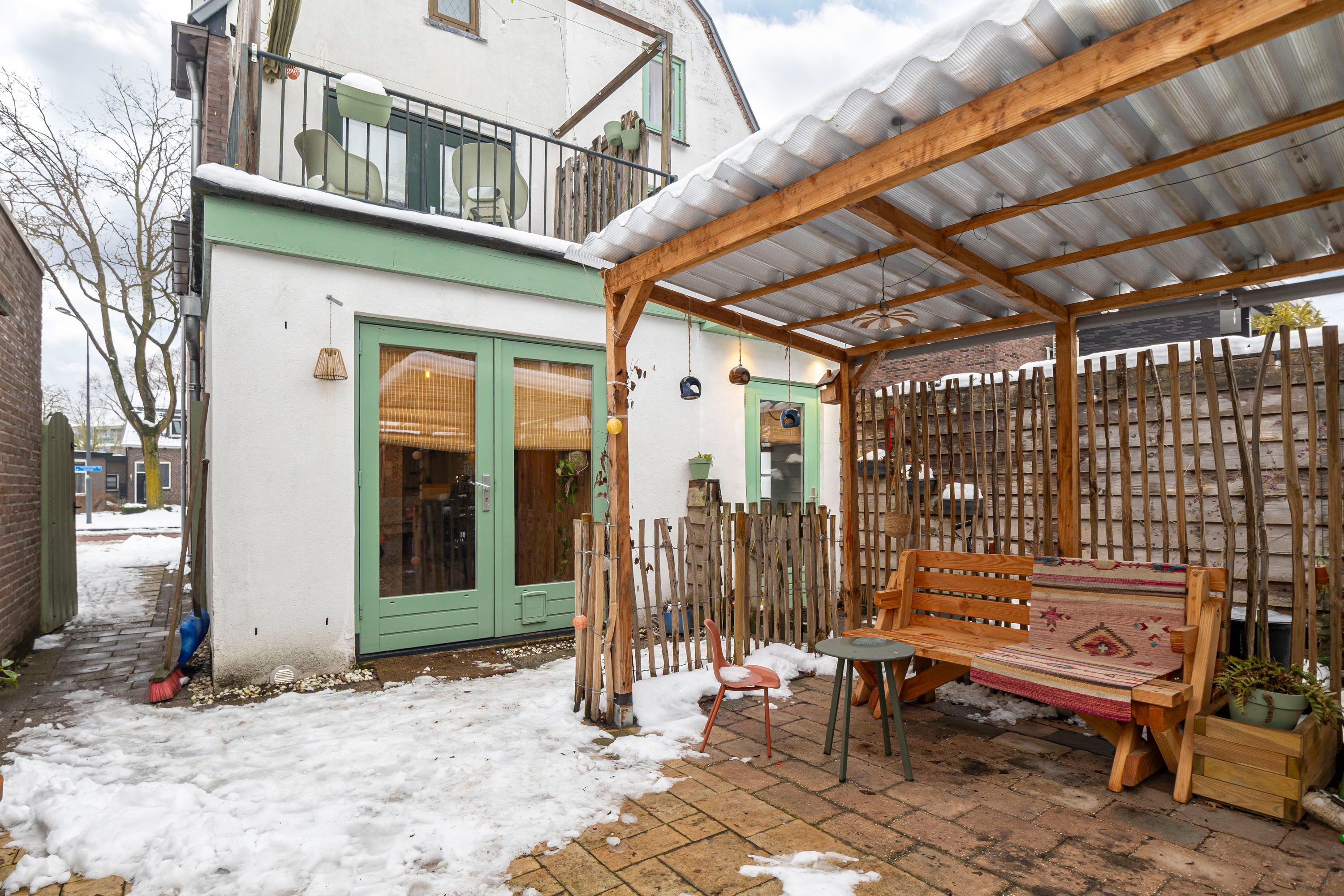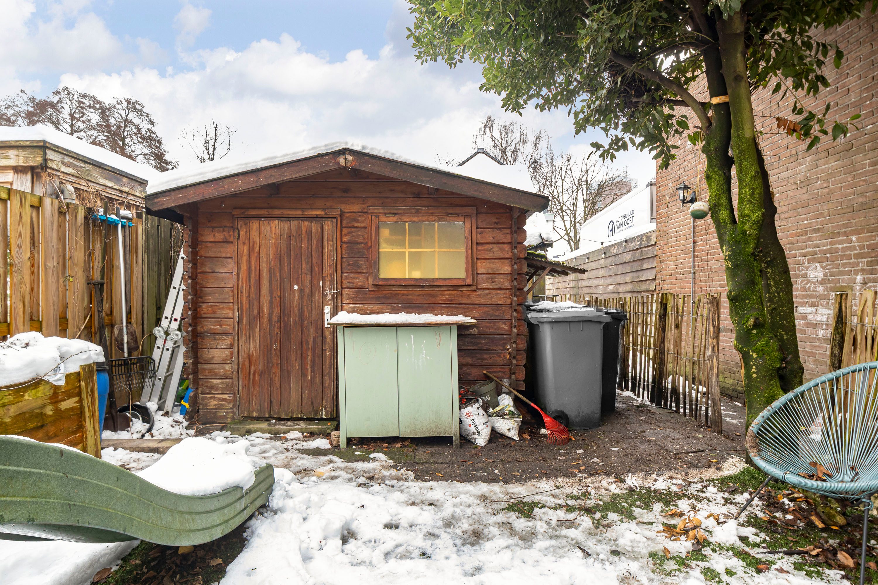 Aan de achterzijde van de woning zijn nog twee losse, praktische opbergkasten aanwezig en geven openslaande tuindeuren direct toegang tot de tuin.