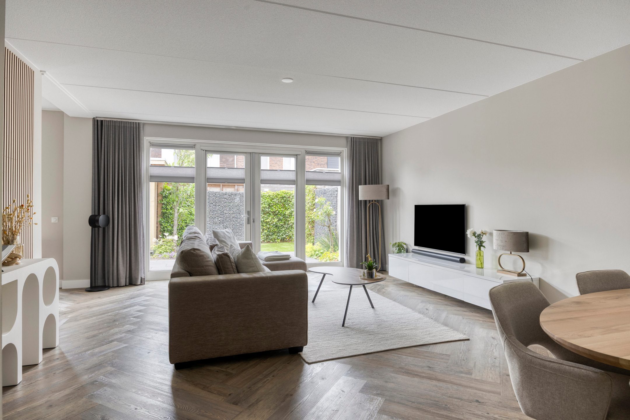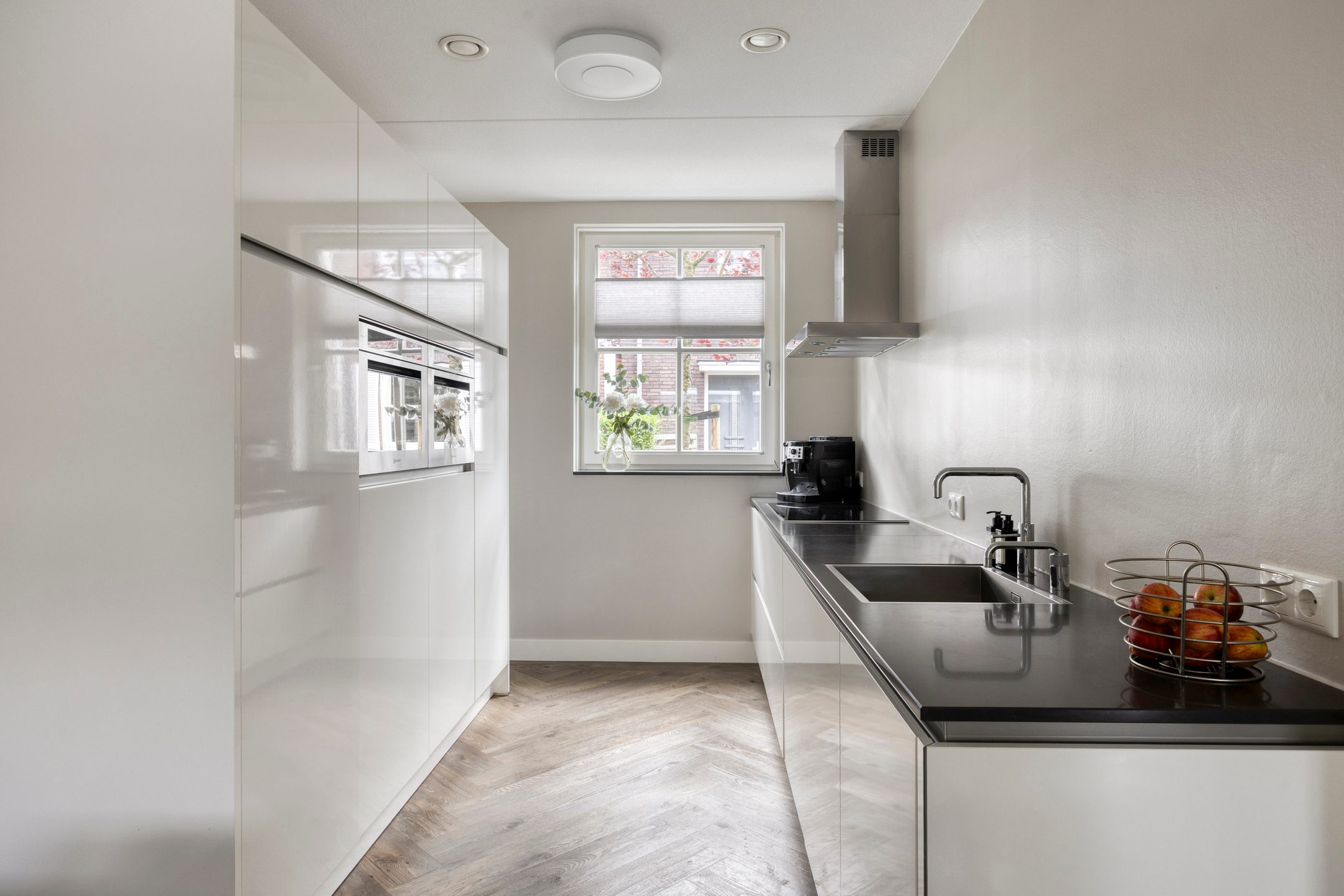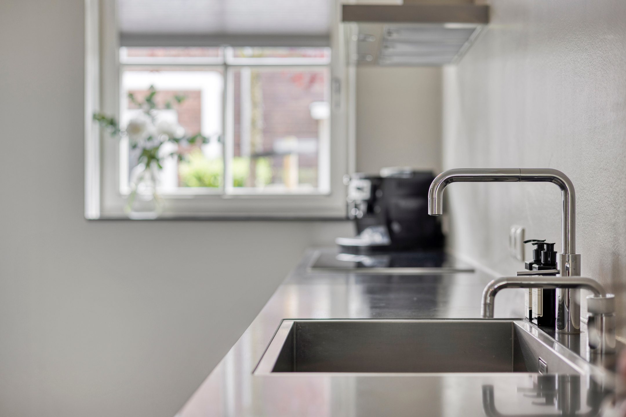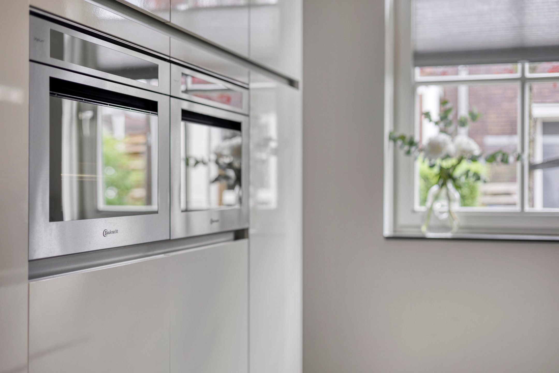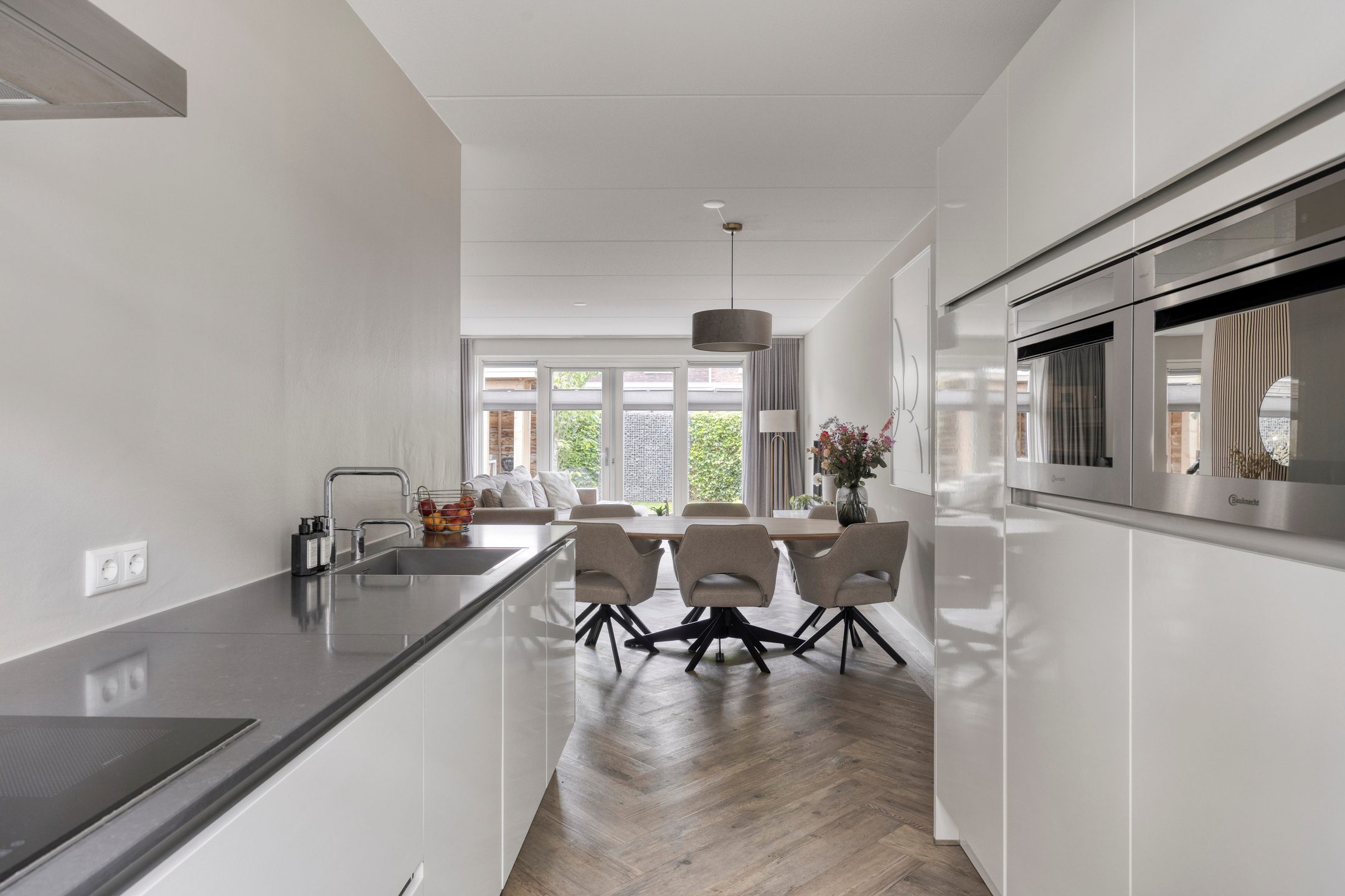 Aan de voorzijde van de woning bevindt zich het eetgedeelte, dat naadloos overgaat in de moderne keuken. De keuken is uitgevoerd in een hoogglans wit design en beschikt over een ruim keukenblok, met alle luxe die je kunt wensen. Denk hierbij aan een ingebouwde vaatwasser, een inductiekookplaat, een afzuigkap, een combi-oven, een Quooker en een koel-vriescombinatie. Alles is hier perfect afgestemd om comfortabel en stijlvol te koken en eten.