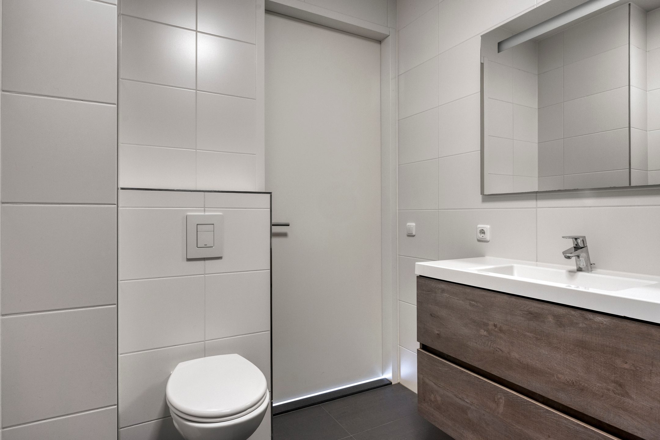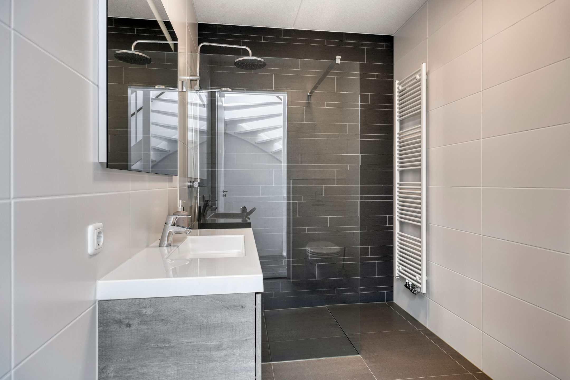 De moderne badkamer is stijlvol afgewerkt met wit- en antracietkleurig tegelwerk. De badkamer is ingericht met een strak wastafelmeubel, een ruime inloopdouche en een toilet.