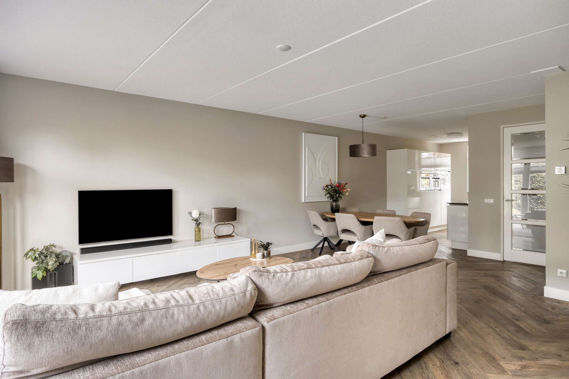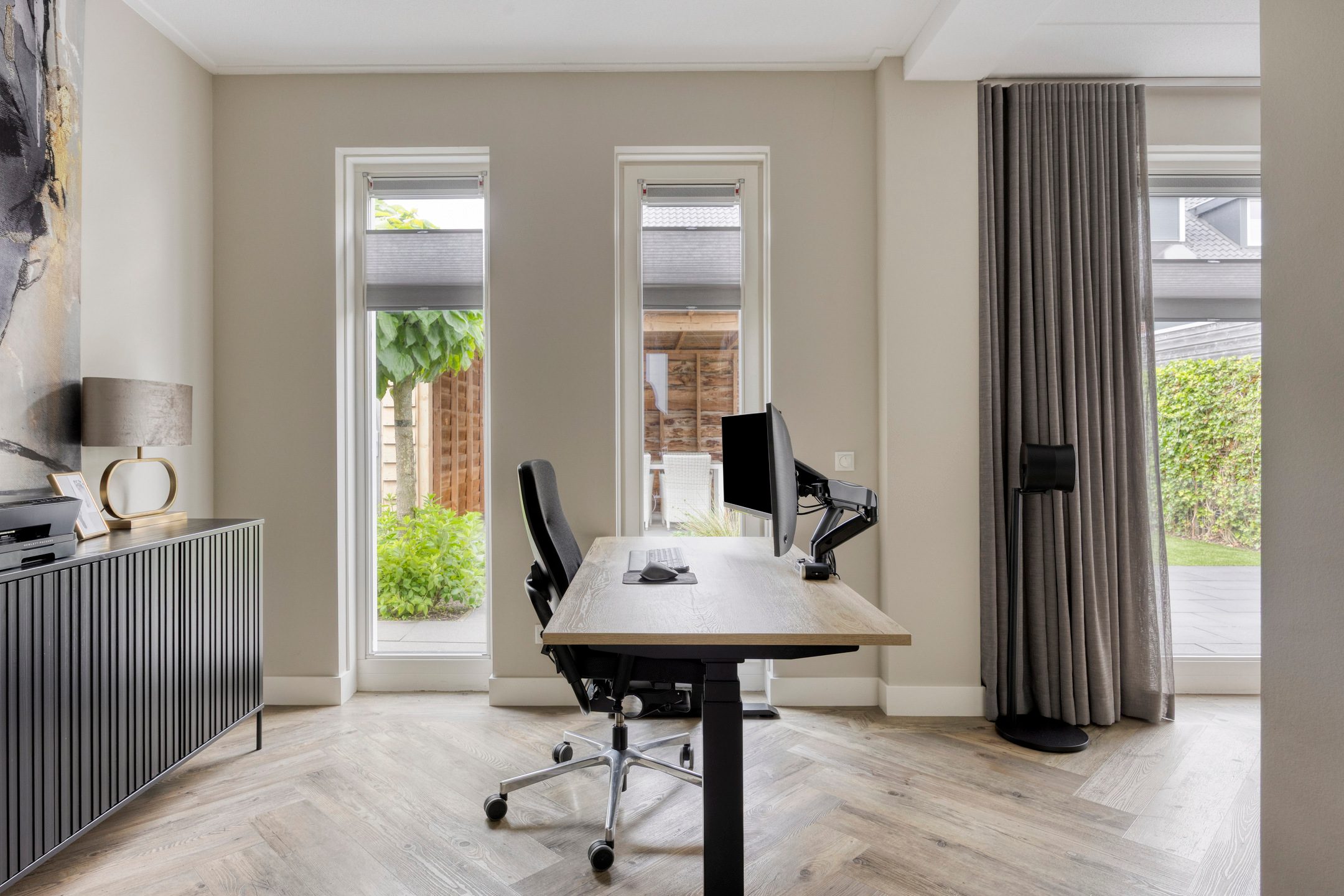 Via de eigen oprit bereik je de entree, die toegang geeft tot een ruime hal met de meterkast, een toiletruimte en de trapopgang naar de eerste verdieping. De uitgebouwde woonkamer is heerlijk ruim en wordt gekenmerkt door grote raampartijen, waardoor er veel natuurlijk licht de ruimte binnenkomt. De visgraat gelegde pvc-vloer geeft de woonkamer een moderne en warme uitstraling. In de royale opstelling is er volop ruimte voor een grote zitbank en gezellige hoekjes, waardoor je een knusse sfeer kunt creëren. Centraal tussen de woonkamer en keuken bevindt zich het eetgedeelte. Hier is meer dan voldoende ruimte voor een grote eettafel met stoelen. Een fijne plek om met familie en/of vrienden te genieten van een hapje, drankje en spelletje! Daarnaast is er in de woonkamer een aparte ruimte die ideaal is als kantoor, speelhoek of werkplek. Vanuit deze ruimte heb je bovendien toegang tot de inpandige berging.