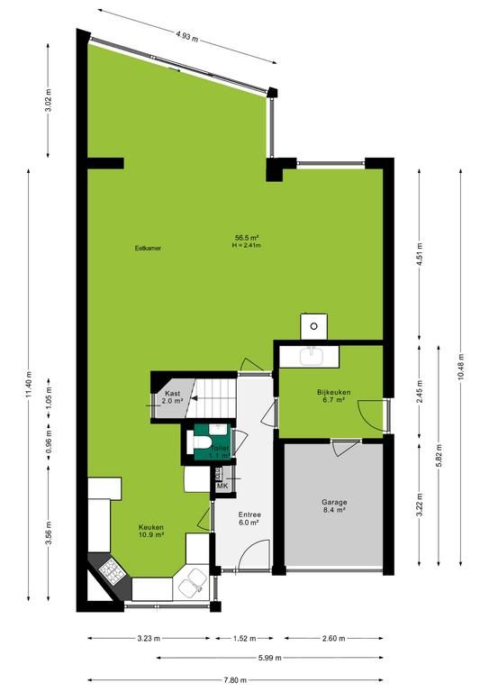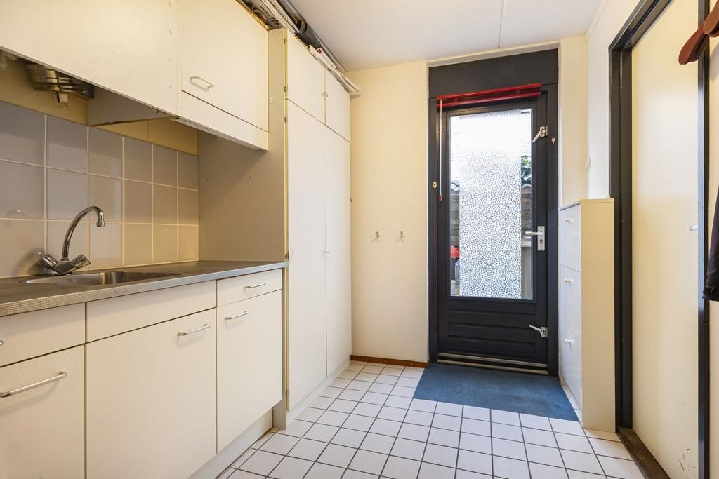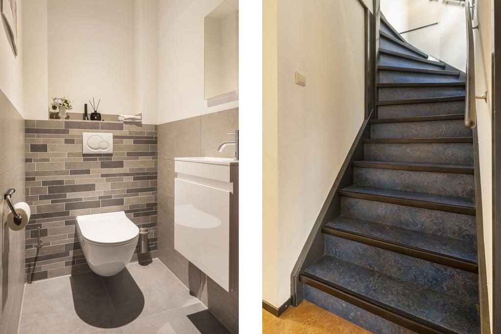 Op de begane grond vind je ook een moderne toiletruimte (gerenoveerd in 2020) en een handige bijkeuken, gecreëerd in het achterste deel van de garage. Deze bijkeuken biedt extra opslag- en werkruimte. De garage biedt mogelijkheden om een eigen werkkamer te creëren.