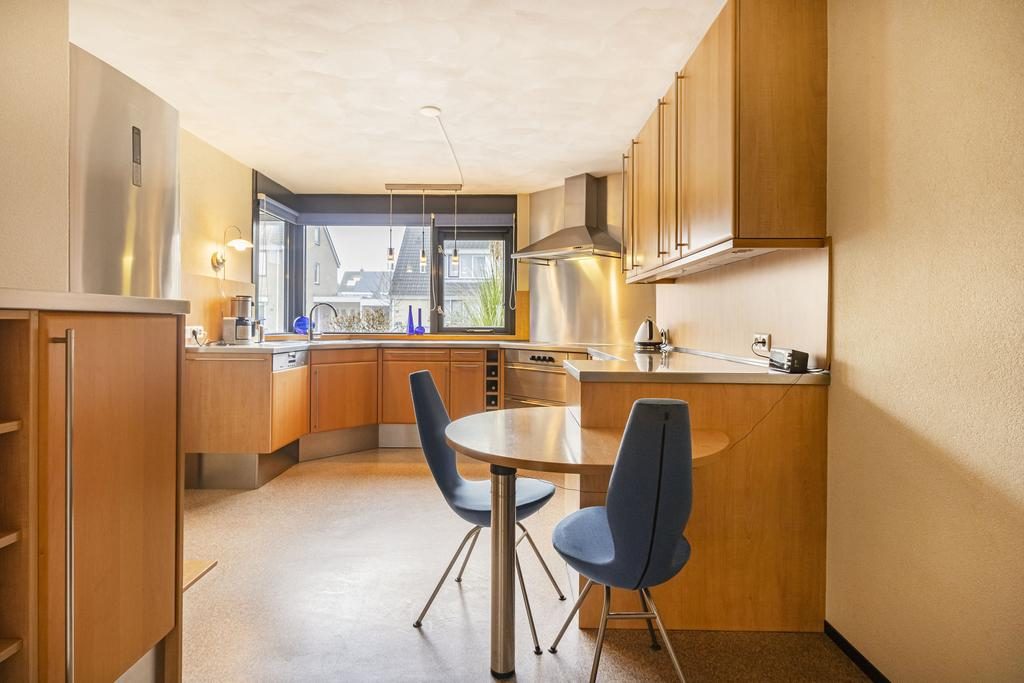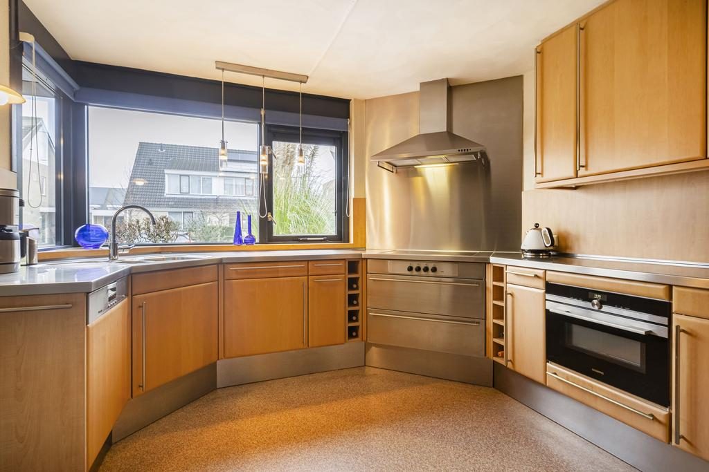 De keuken biedt voldoende ruimte voor een gezellige eethoek. De halfopen keuken aan de voorzijde is praktisch en luxe uitgevoerd in een hoekopstelling met houten fronten- en RVS-accenten. De keuken is voorzien van goede inbouwapparatuur, zoals een keramische kookplaat, een vaatwasser, een oven-magnetroncombinatie en een afzuigkap.
