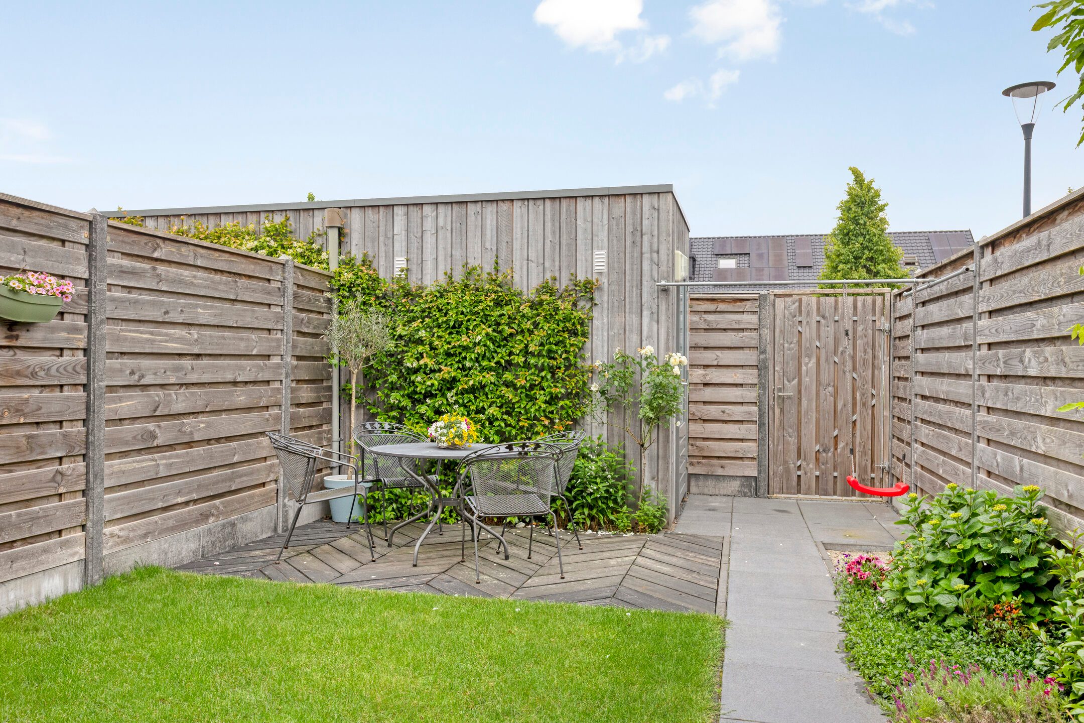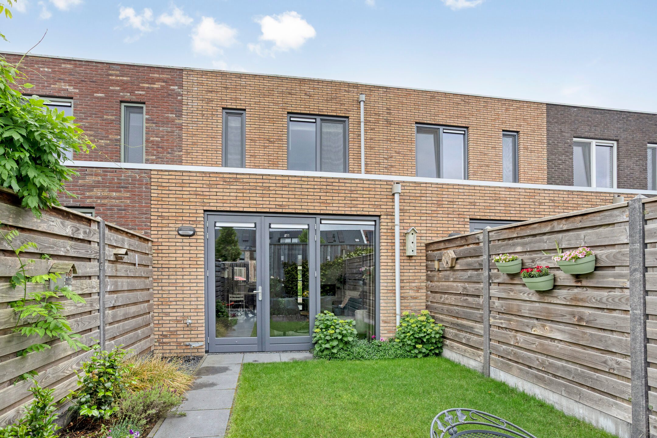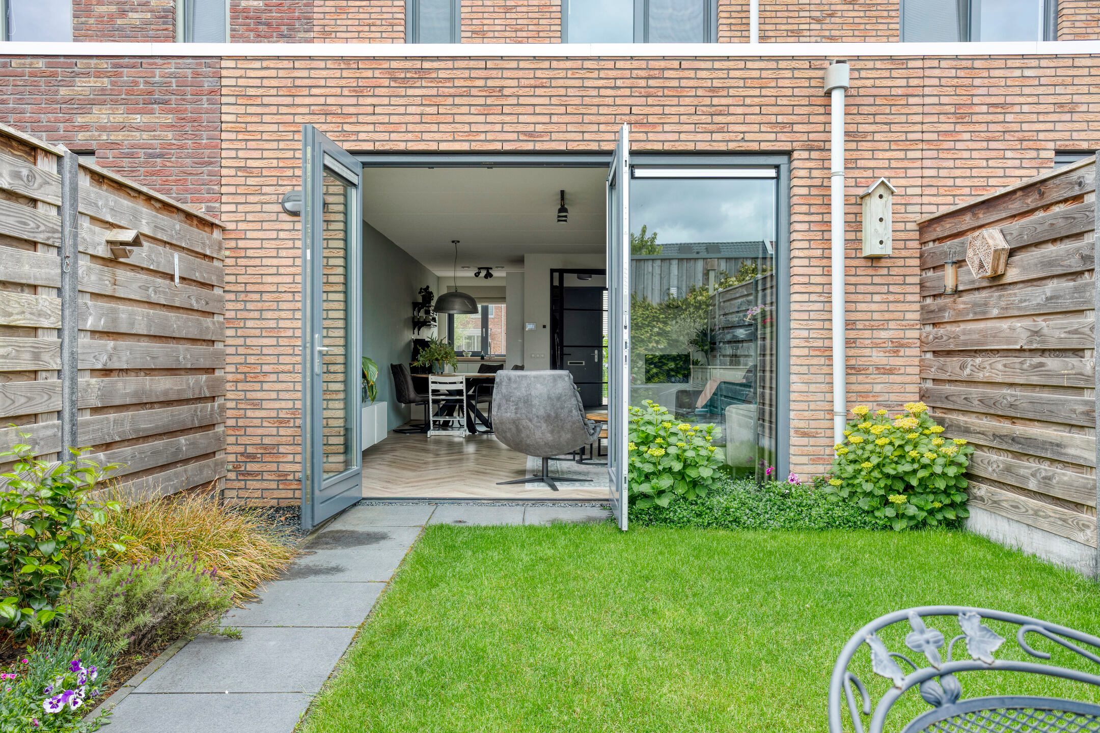 Via de twee openslaande deur in de woonkamer stap je de tuin in. De tuin is praktisch aangelegd en beschikt over een grasperk, houten vlonderterras en plantenborders. Achterin de tuin bevindt zich een houten berging, ideaal voor het opbergen van fietsen of tuingereedschap. De tuin is tevens toegankelijk via een handige achterom.
