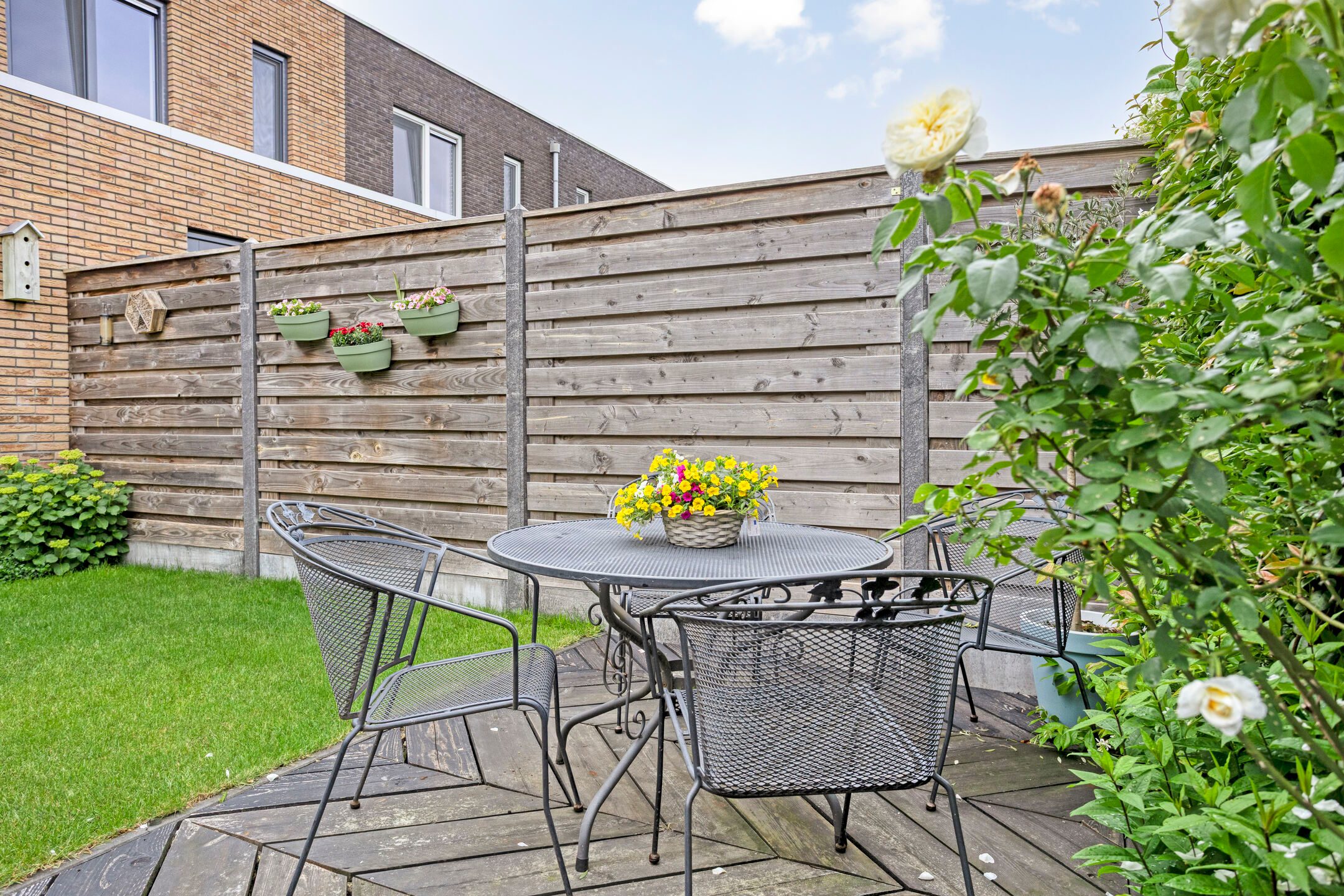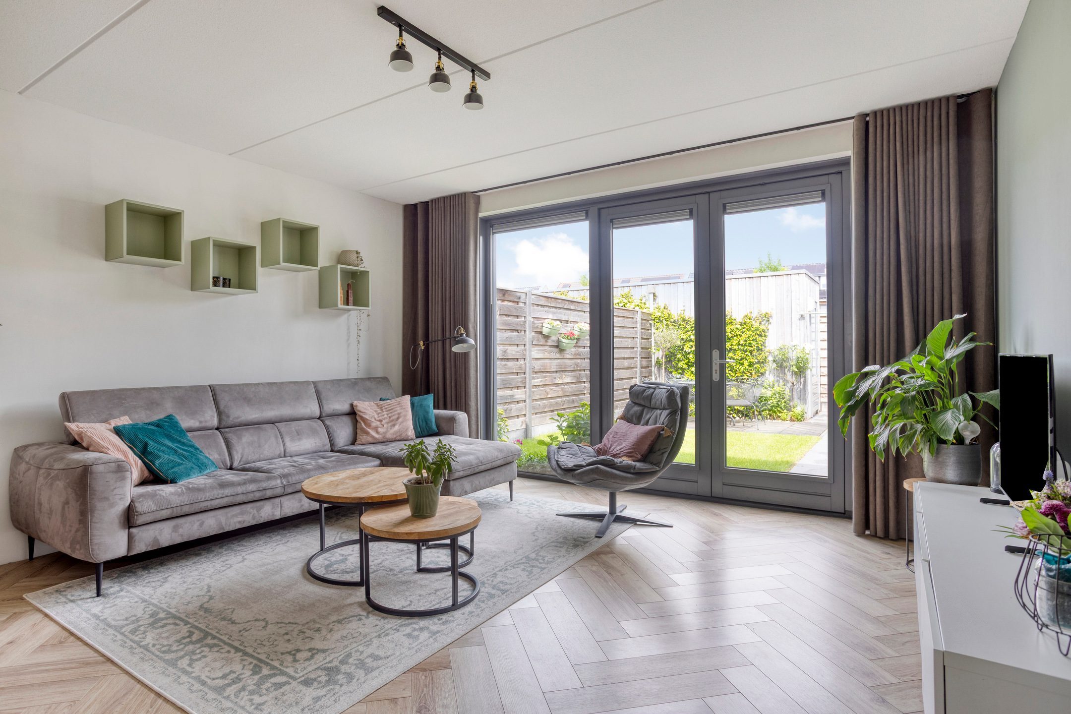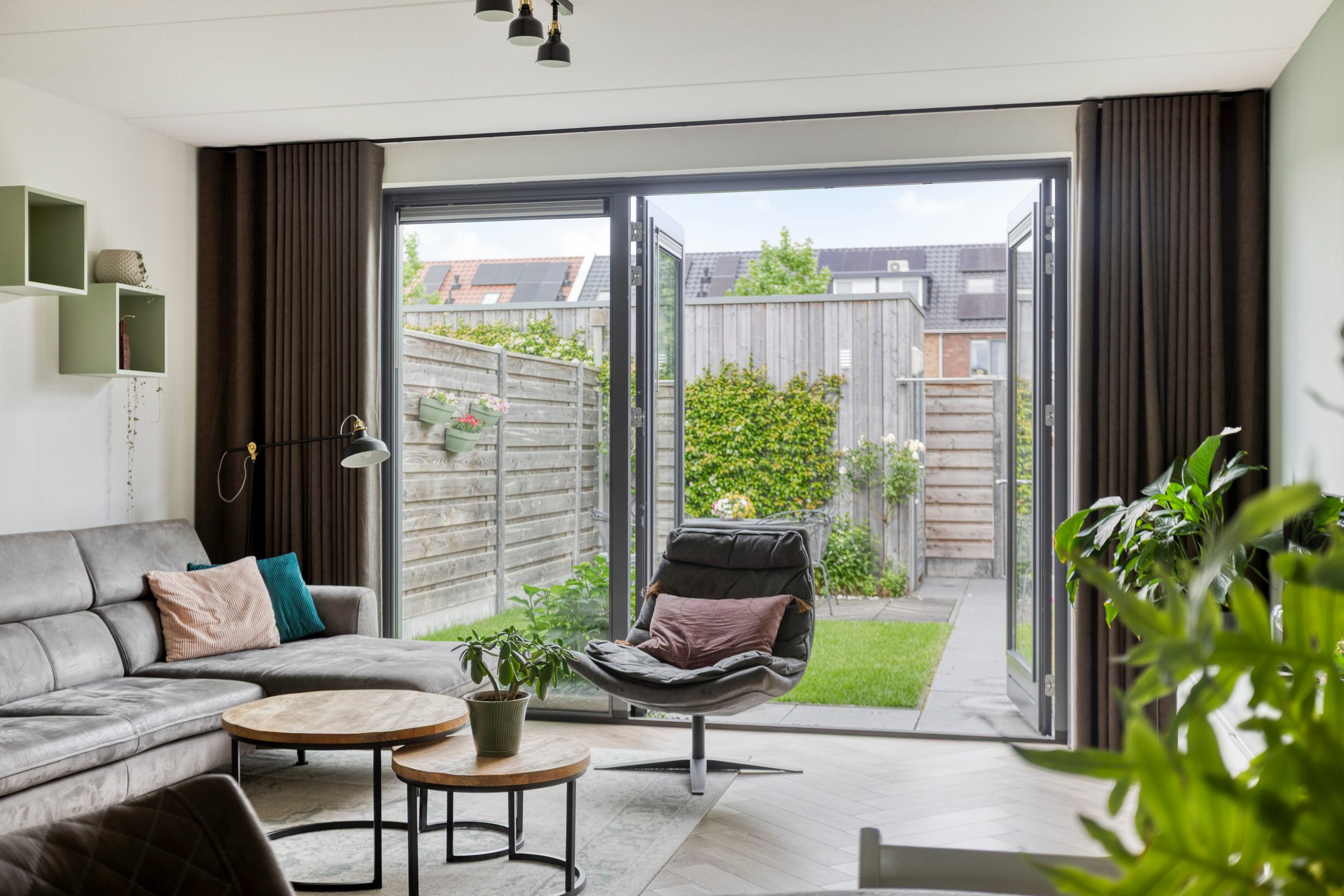 Via de twee openslaande deur in de woonkamer stap je de tuin in. De tuin is praktisch aangelegd en beschikt over een grasperk, houten vlonderterras en plantenborders. Achterin de tuin bevindt zich een houten berging, ideaal voor het opbergen van fietsen of tuingereedschap. De tuin is tevens toegankelijk via een handige achterom.