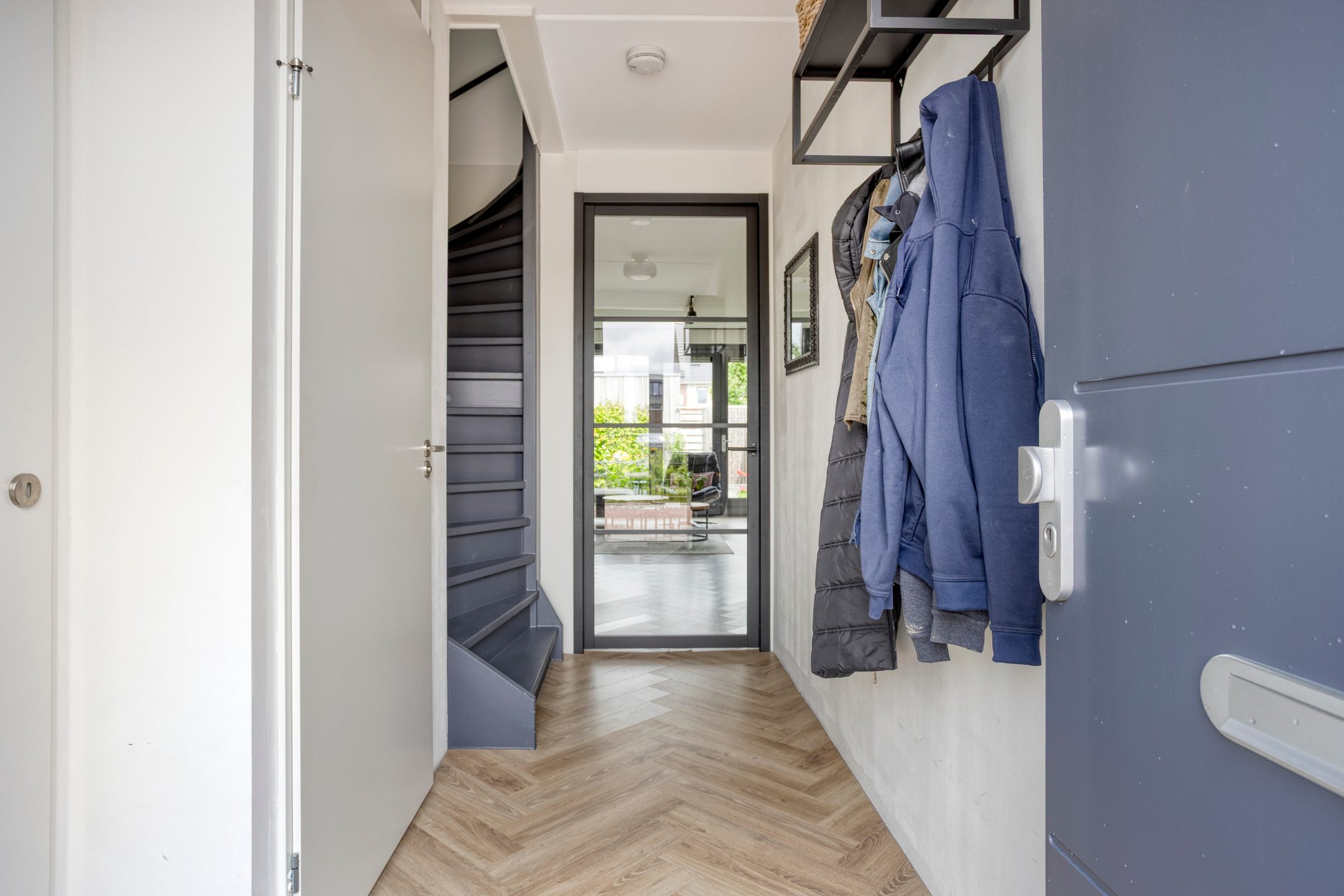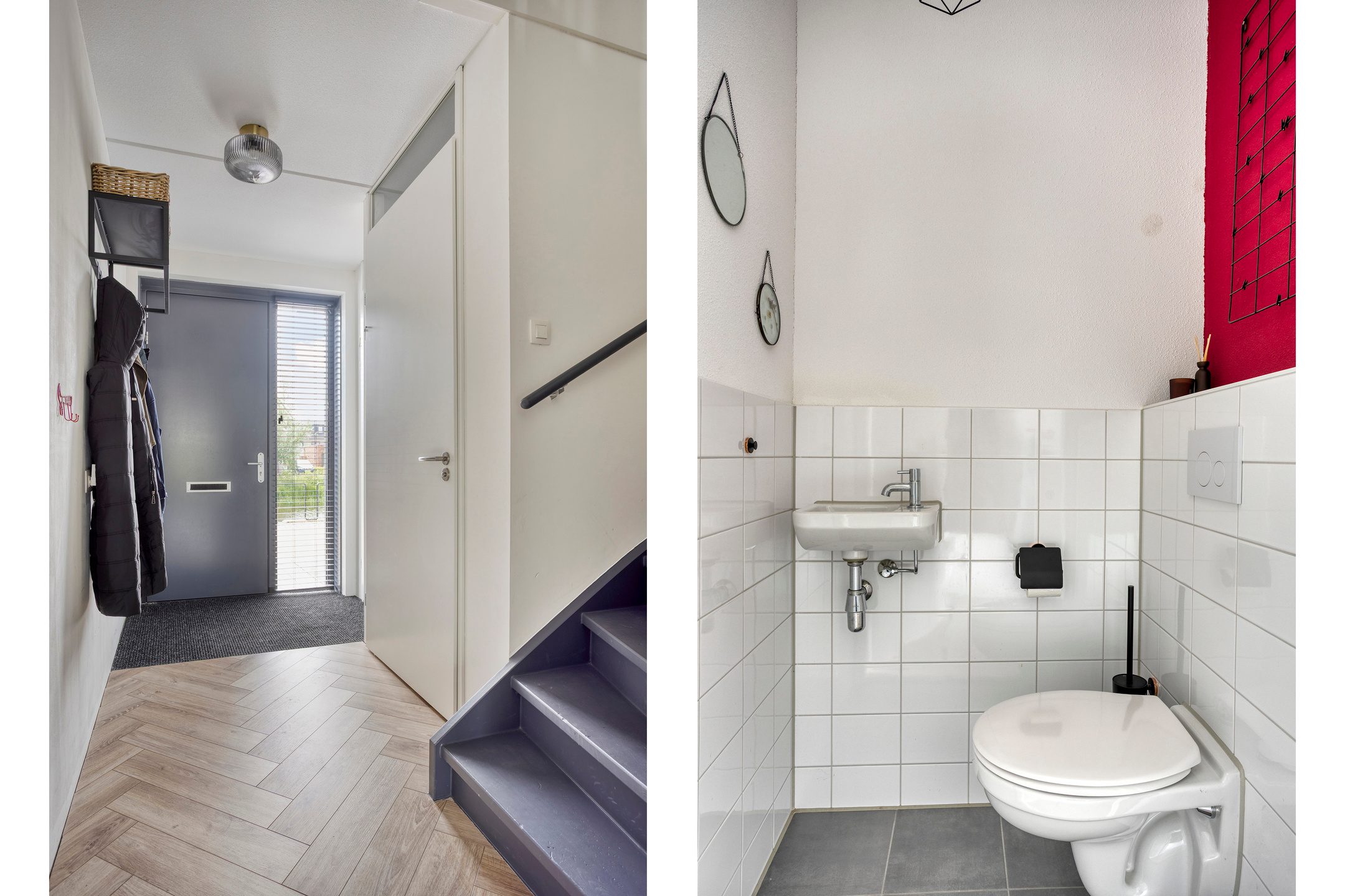 Wanneer je de woning binnenkomt, stap je in de entree, waar je ook de meterkast vindt. Direct naast de entree is er een keurig afgewerkt toilet met een fonteintje. Vanuit de entree leidt een trapopgang je naar de eerste verdieping.