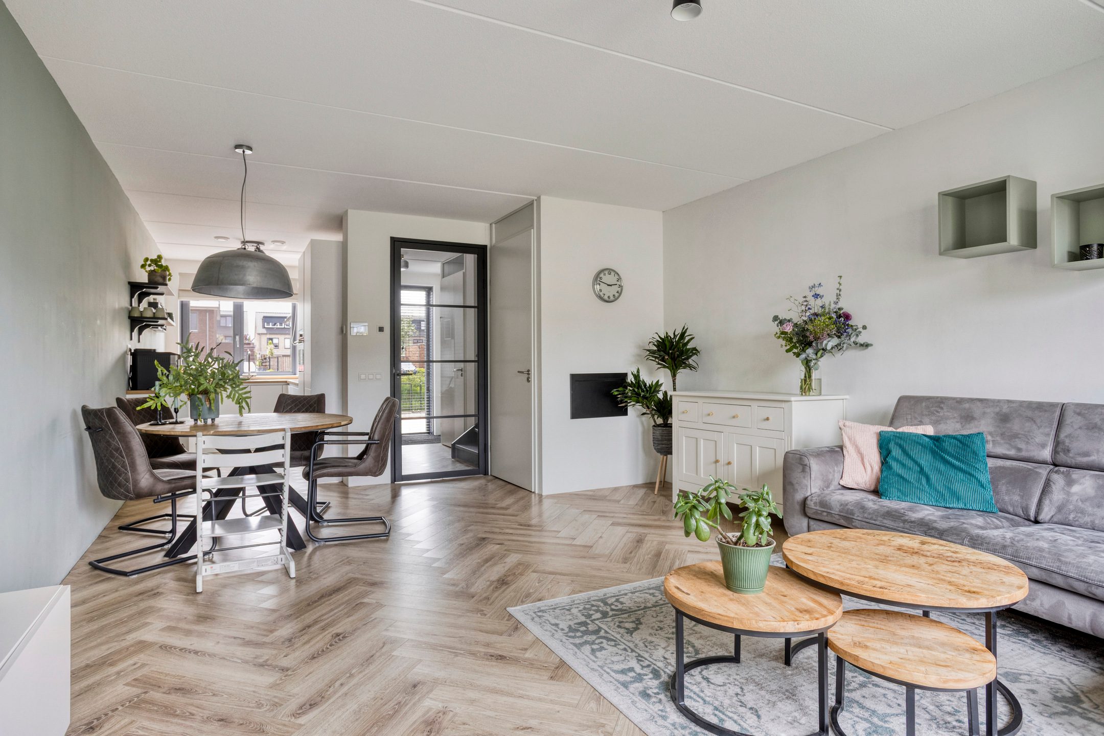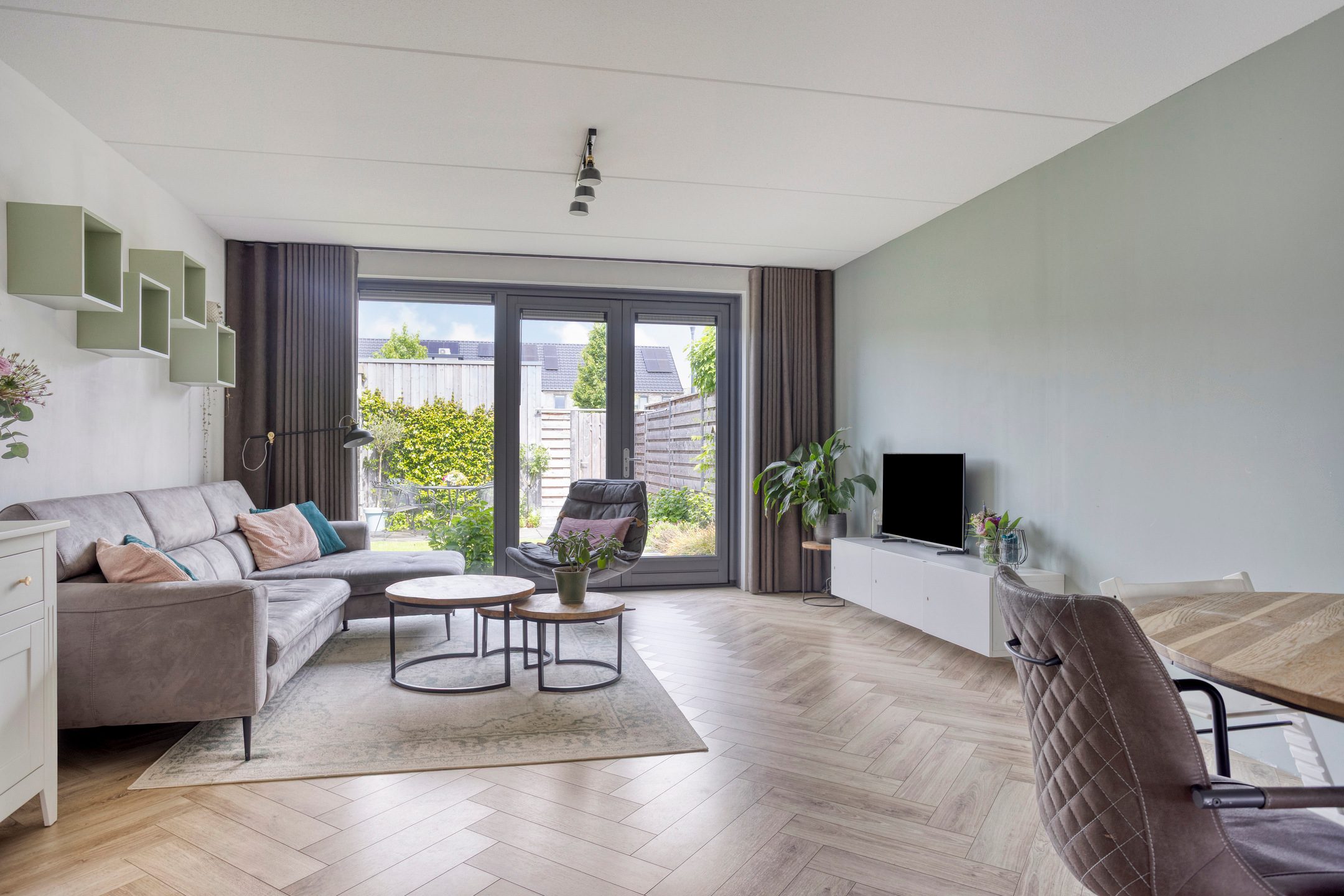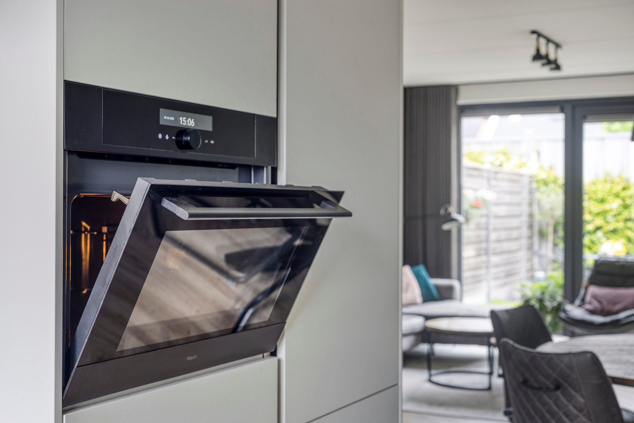 De royale (uitgebouwde) woonkamer is echt een blikvanger dankzij de grote raampartijen, die zorgen voor een overvloed aan natuurlijk licht. Vanuit de woonkamer heb je via twee tuin deuren directe toegang tot de tuin, waardoor het binnen-buitenleven naadloos met elkaar verbonden wordt. Centraal tussen de woonkamer en keuken bevindt zich het eetgedeelte. Hier is voldoende ruimte voor een eettafel met stoelen. Een fijne plek om met familie en/of vrienden te genieten van een hapje, drankje en spelletje! Aangrenzend aan de woonkamer vind je de moderne keuken, uitgevoerd in een lichte kleurstelling.