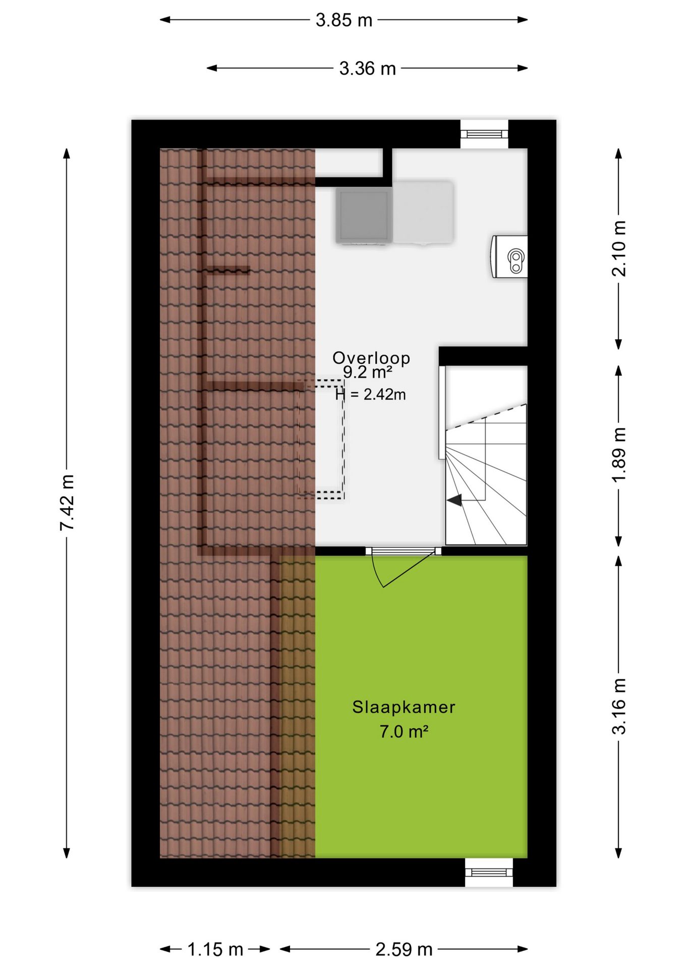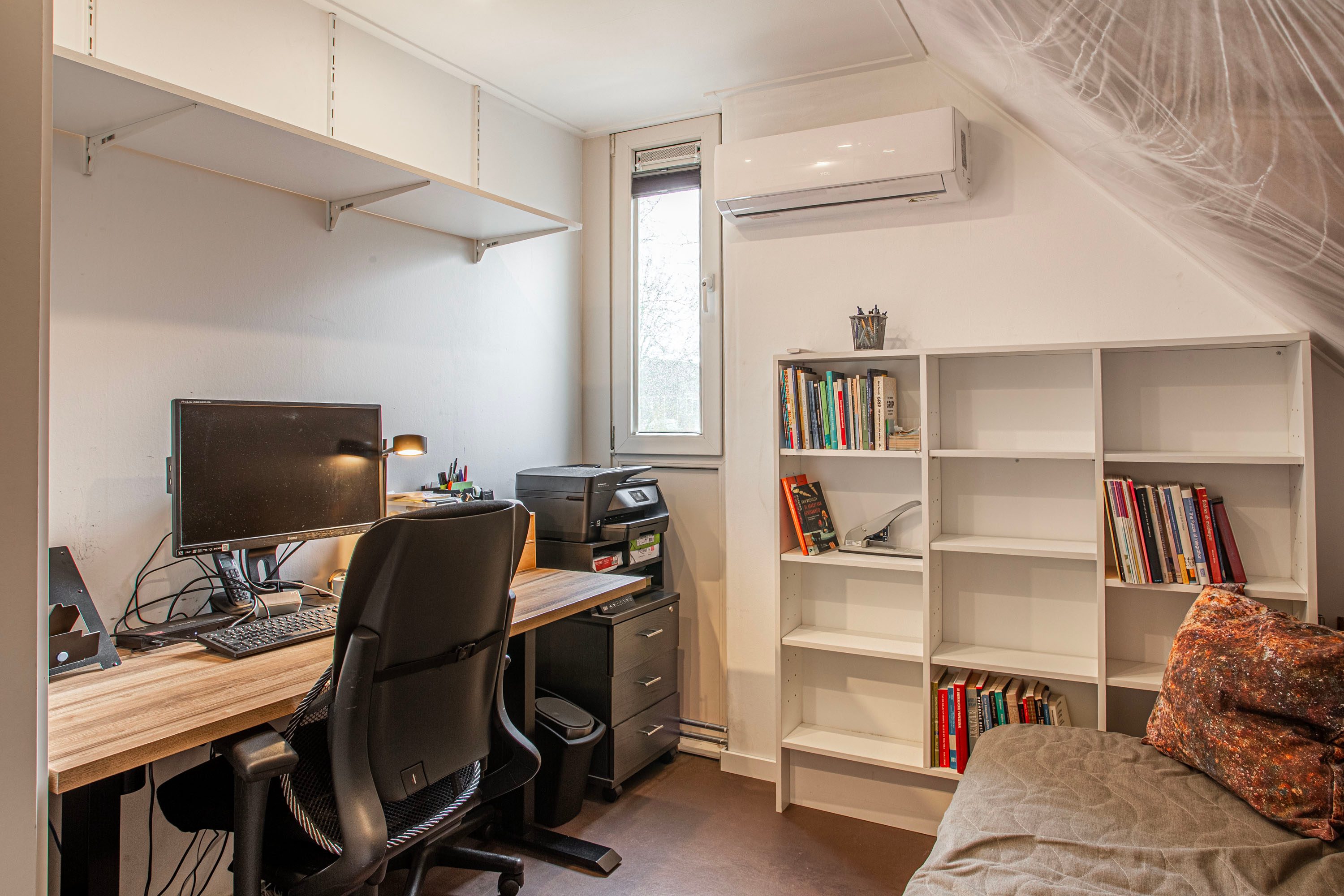 Via de overloop met witgoedaansluiting is de 4e (slaap)kamer te bereiken. Deze kamer heeft nog een afmeting van ca. 7m² en is multifunctioneel te gebruiken. Mede door de airco is het hier extra aangenaam.