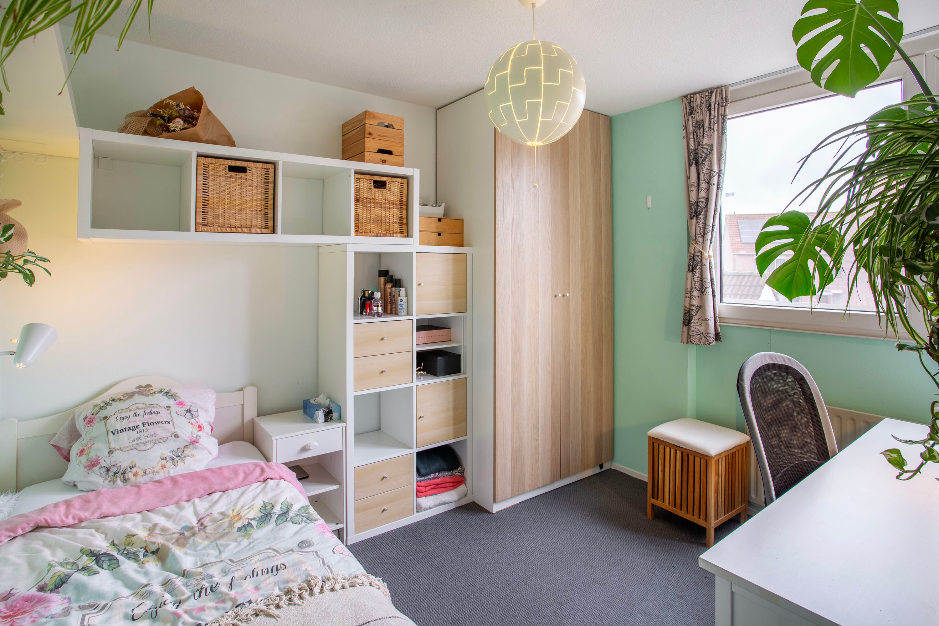 De overloop geeft toegang tot de 3 slaapkamers en de badkamer. De slaapkamers hebben een afmeting van ca. 12m², 9m² en 6m². De slaapkamers zijn voorzien van voldoende lichtinval en een nette afwerking. De badkamer is in 2021 vernieuwd, heeft een moderne kleurstelling en beschikt over een inloopdouche, wastafel met wastafelmeubel, toilet en een raam om extra goed te kunnen ventileren.