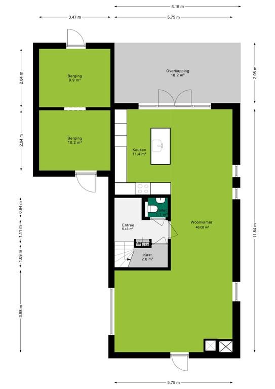 Entree/hal, uitgebreide meterkast met DEVO systeem, luxe toiletruimte met zwevend toilet en fonteintje in moderne kleurstelling. Vanuit de hal geeft een stalen deur toegang tot de woonkamer en keuken. De ruime open keuken is aan de tuinzijde gelegen en heeft voldoende ruimte om ook de eettafel te plaatsen. Doordat in de gevel meerdere ramen zijn geplaatst die tot op de grond reiken is de keuken een zeer lichte ruimte.
