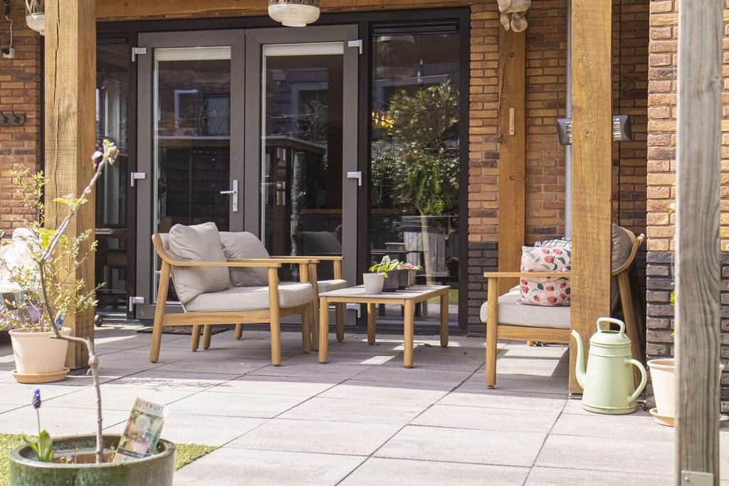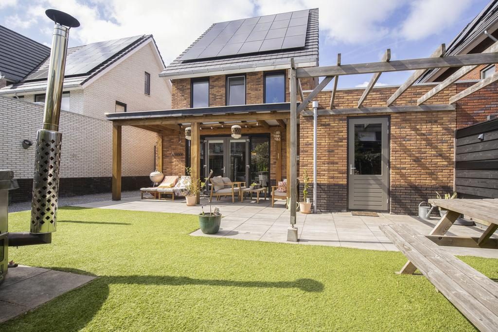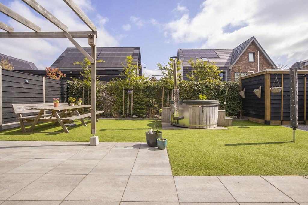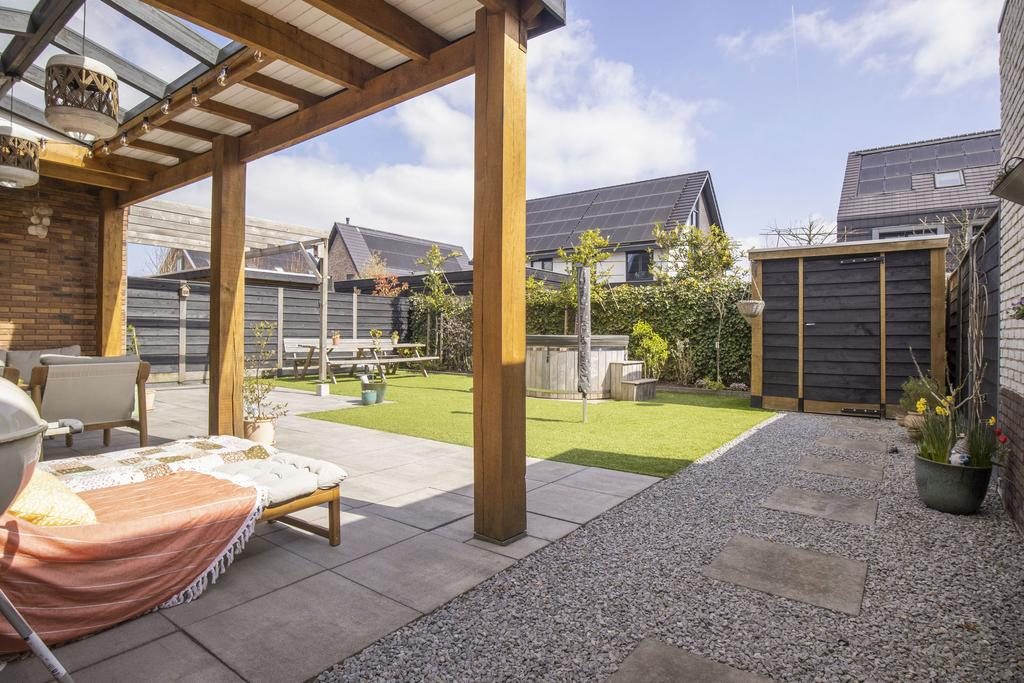 Fijne, op het zuidoosten gelegen, verzorgd aangelegde achtertuin met mooie sierbestrating en kunstgras gazon! Mooie grote terrastegels met naast de woning een grindpad met staptegels. Het pronkstuk is de aan de woning aangebouwde overkapping met een mooie lichtstraat voor extra daglicht onder de overkapping en in de keuken. Ook is er een praktische houten berging, ruim genoeg voor fietsen en overige tuinbenodigdheden.