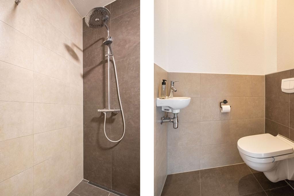 Er is een separate toiletruimte voorzien van een wandcloset en fonteintje, in de zelfde kleurstelling als de badkamer.