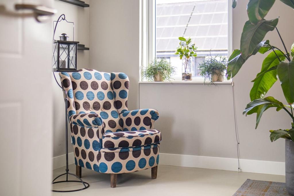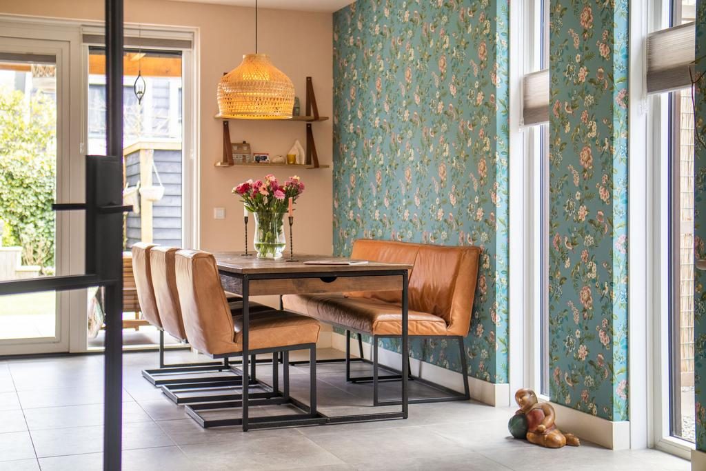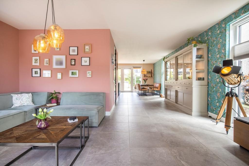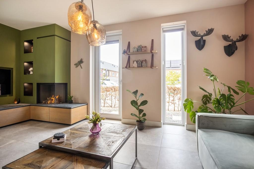 De woonkamer, aan de voorzijde gesitueerd, is zeer sfeervol, mede door de aanwezige gashaard (op propaangasflessen) met een strak wand-zitmeubel. Door het gebruik van warme kleuren en lichtgrijze vloertegels is er eenheid en rust in de woonkamer.