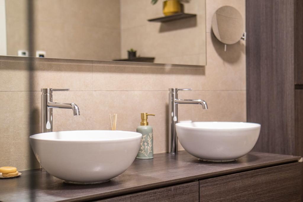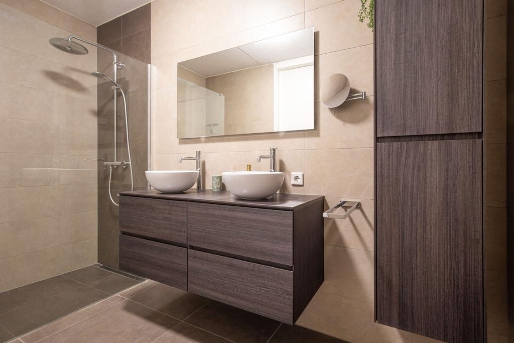 De badkamer ligt tussen de slaapkamers in en heeft de beschikking over een inloopdouche, fraai wastafel meubel met twee waskommen en een hoge wandkast. De wanden en vloer zijn betegeld met fraai tegelwerk.