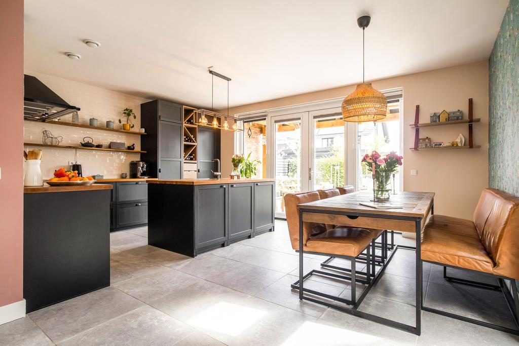 Verder is de uitgebreide luxe inbouwkeuken in L-opstelling geplaatst en heeft een spoeleiland. De keuken is uitgerust met veel kastruimte, wijnrekken en een massief houten blad. Qua apparatuur is er een zeer fraai Smeg fornuis met inductie kookplaat en drie ovens, daarboven een bijpassende Smeg afzuigkap. Prominent geplaatst is het spoeleiland, met veel werkruimte en uitgerust met een spoelbak en een vaatwasser. Tot slot heeft deze keuken een hoge kastenwand in zwarte uitvoering met diverse accenten in houtlook waar naast de diverse opbergruimte, de koelkast en vriezer geplaatst zijn. Vanuit de keuken geven twee tuindeuren toegang tot de sfeervolle overkapping die aan de achterzijde is aangebouwd. In de overkapping is een fraaie lichtstraat geplaatst.