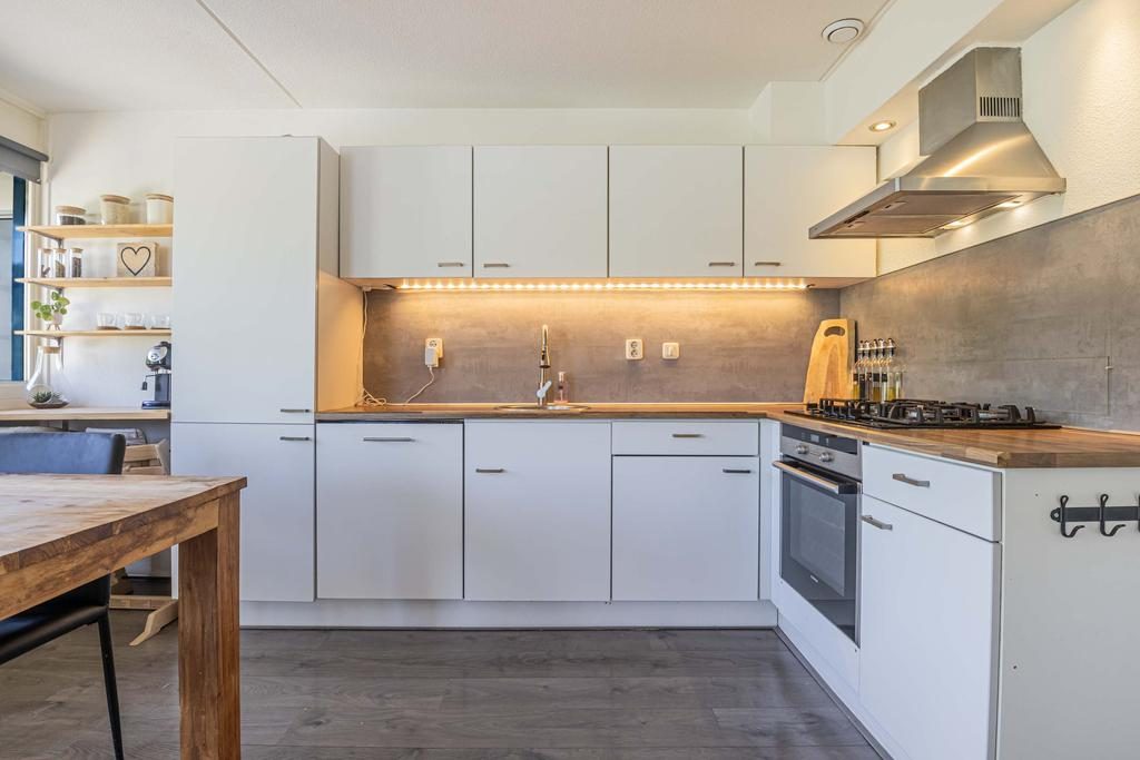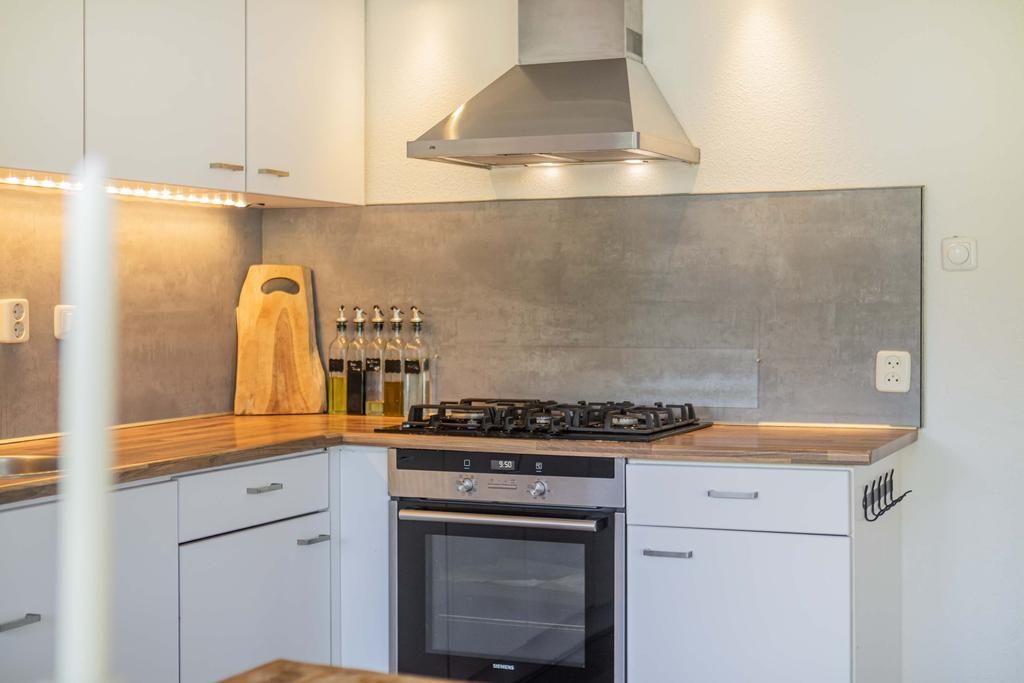 De keuken staat in open verbinding met de woonkamer, wat gezelligheid tijdens het koken garandeert. De keuken biedt veel opbergruimte dankzij de boven- en onderkastjes. Daarnaast beschik je over alle noodzakelijke inbouwapparatuur, waaronder een 4-pits gasfornuis met afzuigkap, vaatwasser, koel-/vriescombinatie en oven.