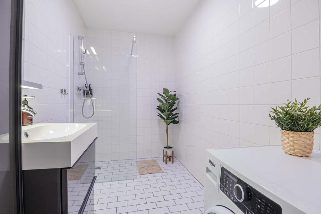 De ruime badkamer (ca. 4,9 m²) is voorzien van een ruime inloopdouche en een modern wastafelmeubel met opbergruimte. Hier vind je ook de aansluitingen voor de wasmachine, wat zorgt voor extra efficiëntie in de indeling van het appartement.