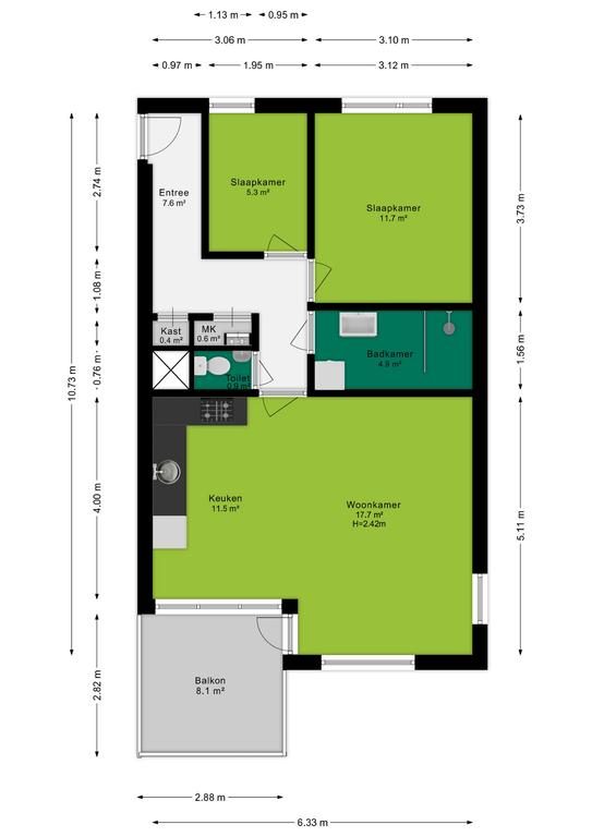De woonkamer voelt meteen ruim en uitnodigend aan, mede dankzij de vele ramen die zorgen voor een prachtige lichtinval. Met een oppervlakte van ruim 29 m² is hier alle ruimte om een gezellige zithoek en een eethoek te creëren. Perfect om te ontspannen of te genieten van je ochtendkoffie met dat rustgevende groene uitzicht. Een extra bonus is het deels overdekte balkon van circa 8,1 m², waar je beschut en in alle rust van het mooie uitzicht over de groenstrook kunt genieten – zelfs in de avonduren!