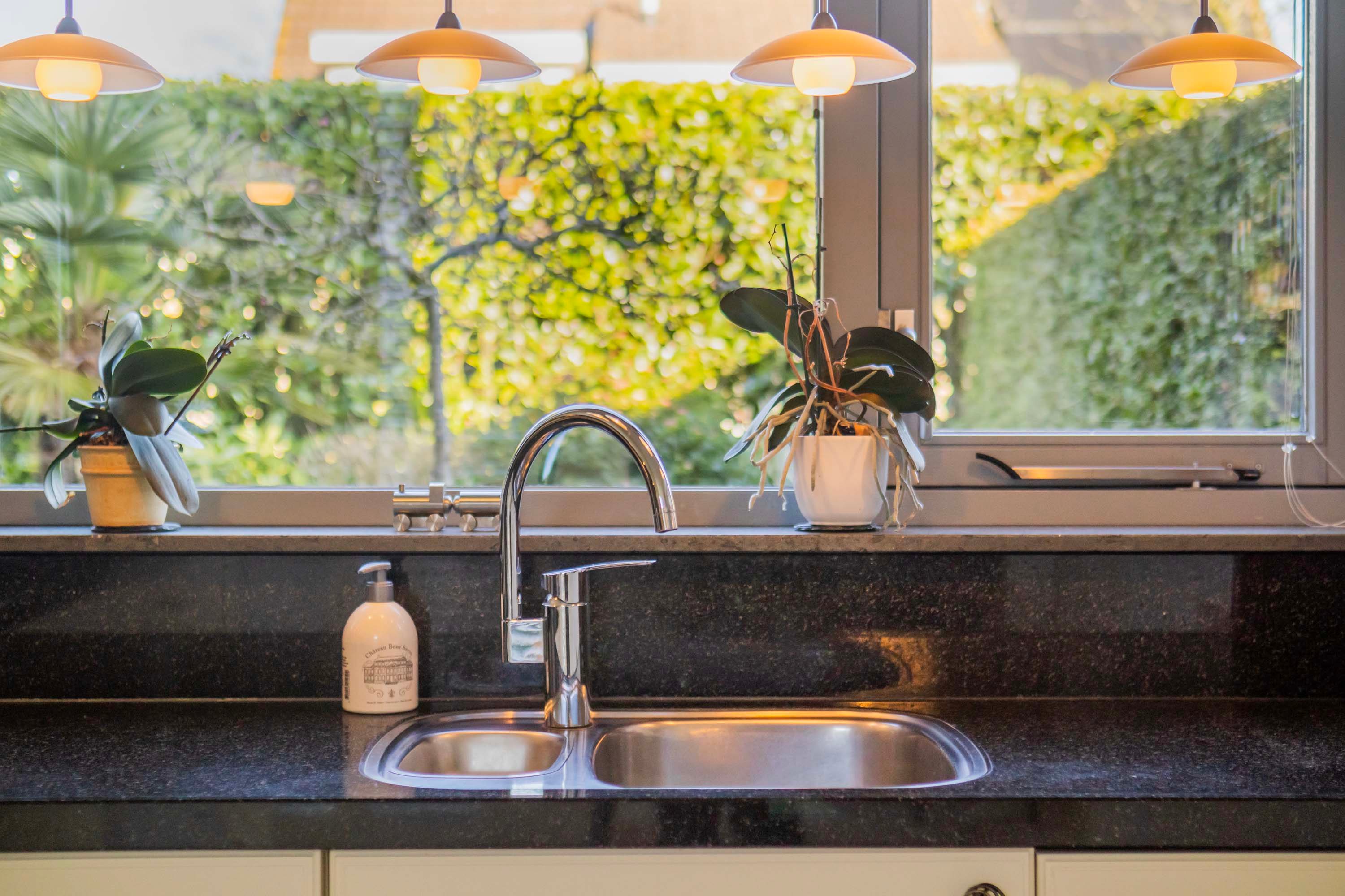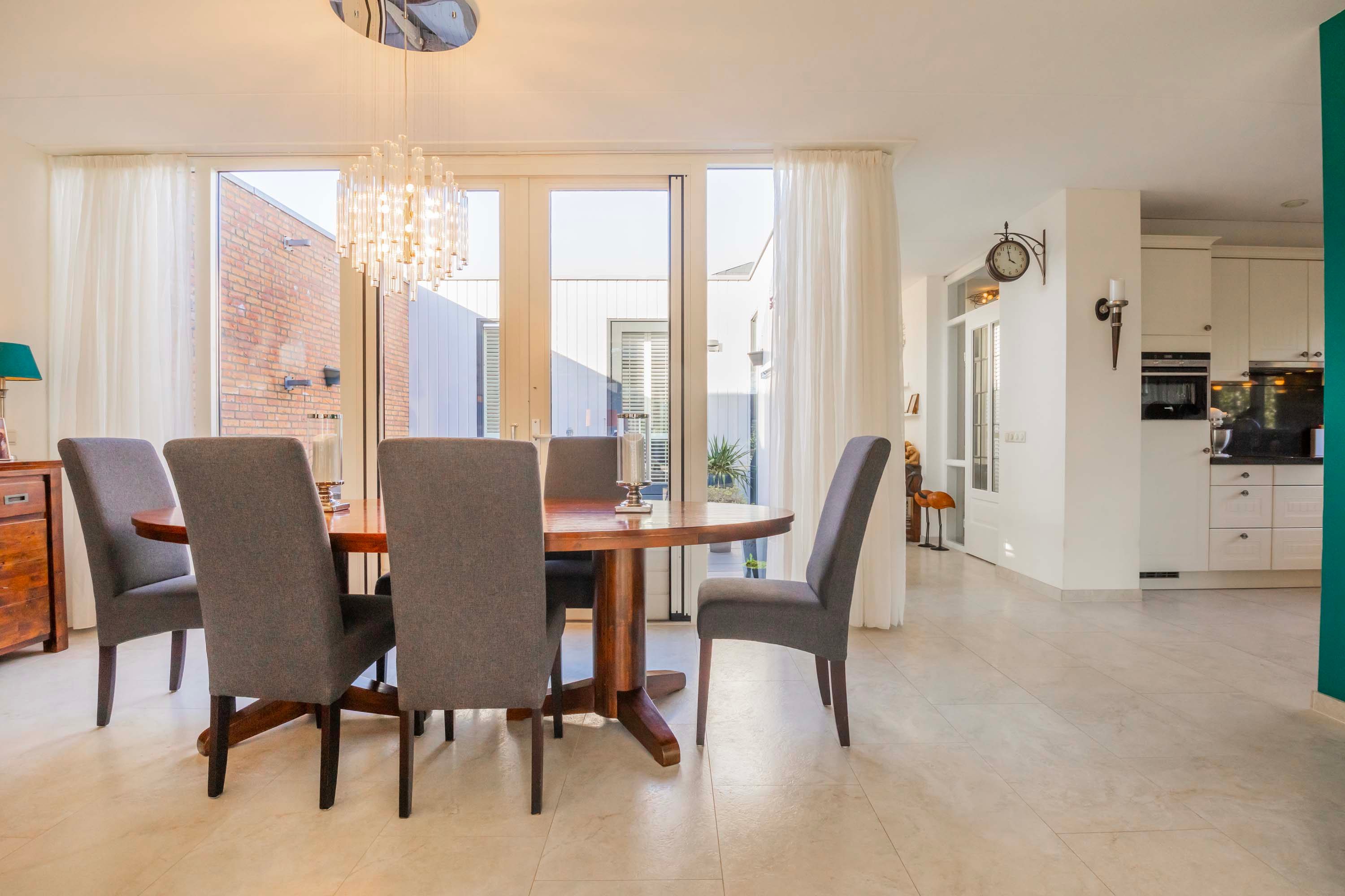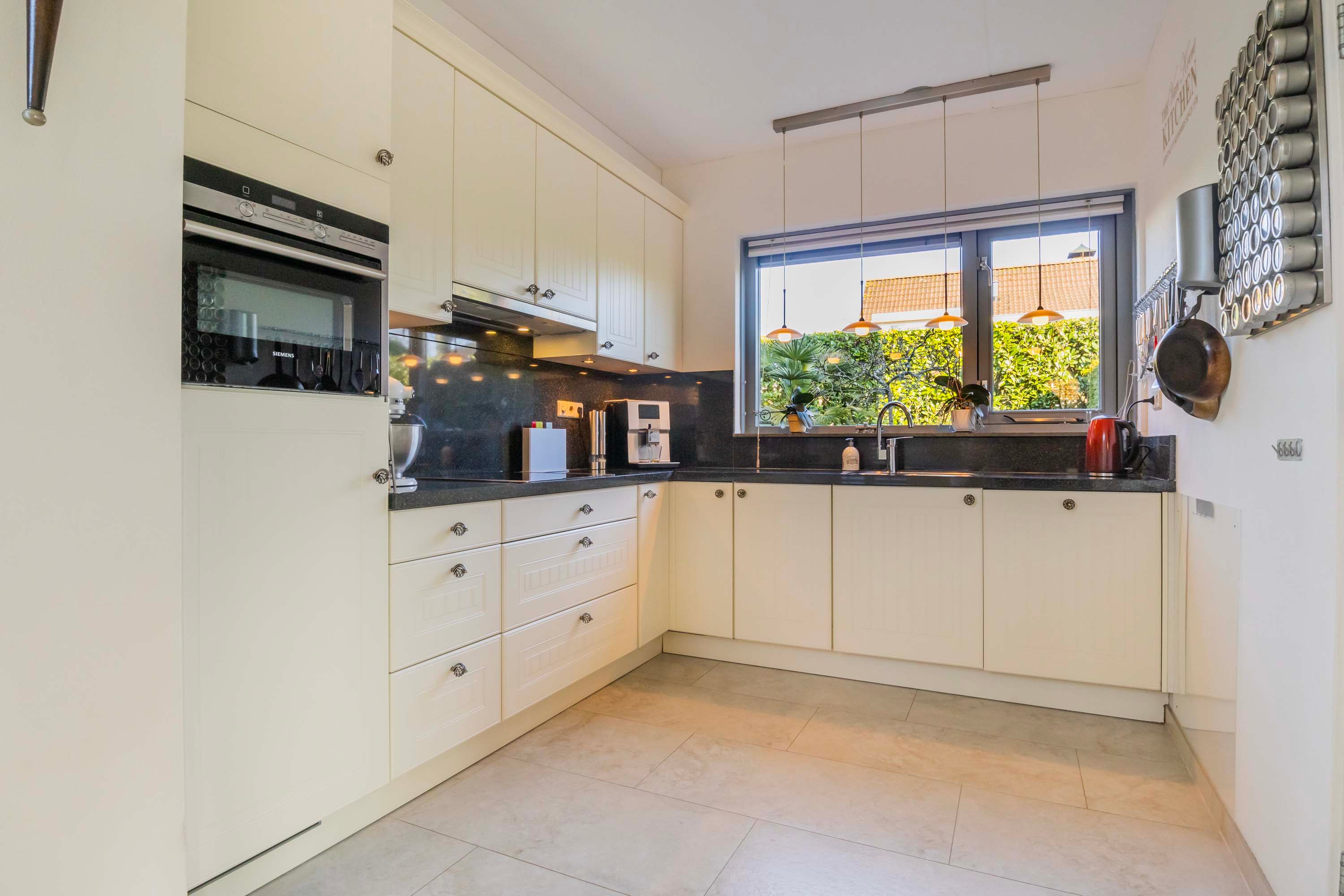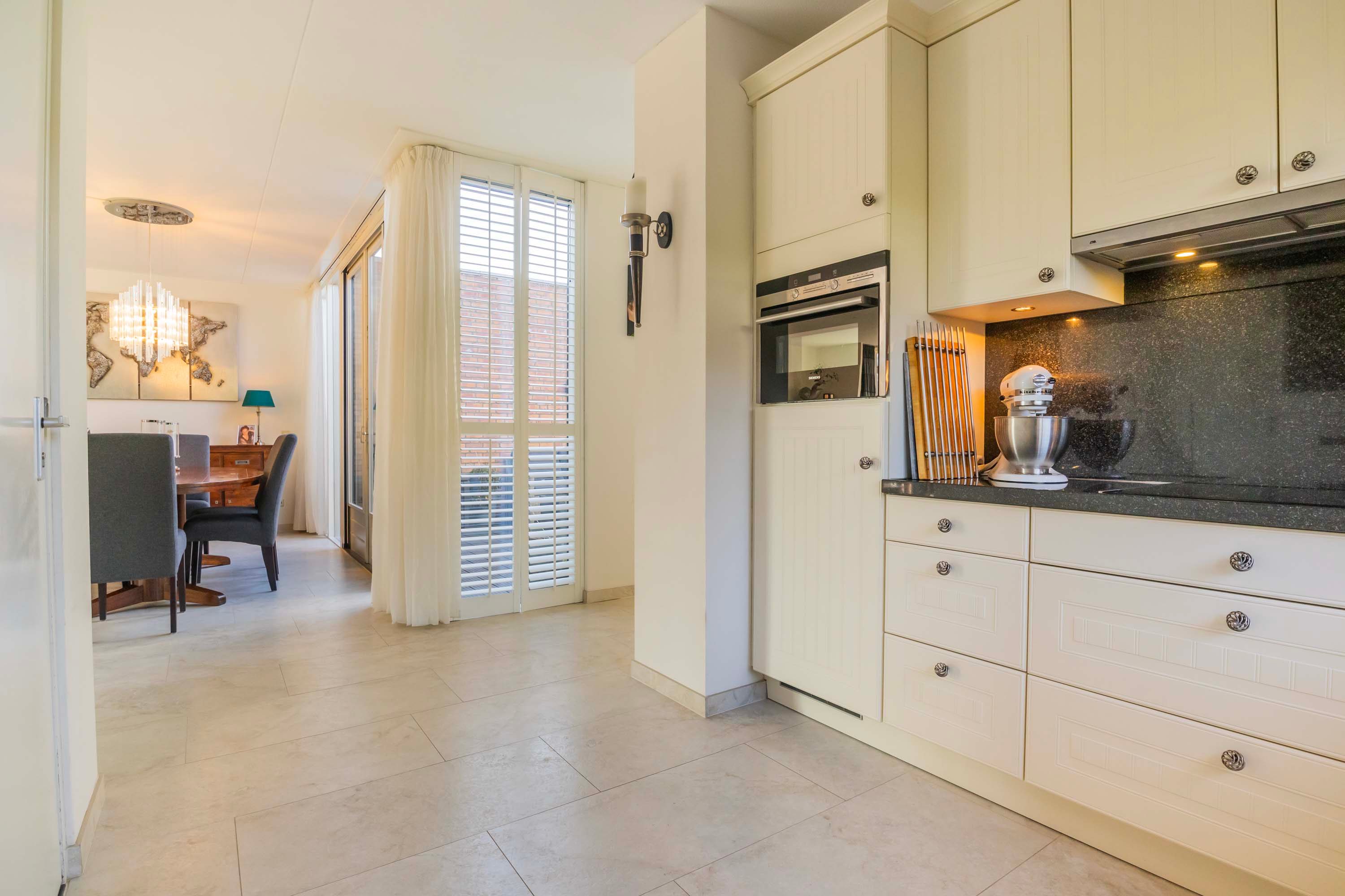 Door de prettige indeling is er ruimte genoeg voor een grote eettafel en ontstaat er een gezellige verbinding tussen de woonkamer en de keuken. De open keuken is voorzien van een in hoekopstelling geplaatste luxe inbouwkeuken met lichte kastfronten en een antraciet kleurig granieten aanrechtblad. Deze complete keuken is uitgerust met een spoelbak, vaatwasser, inductie kookplaat, afzuigkap, combimagnetron en koelkast. Direct vanuit de keuken heb je toegang tot de inpandige garage/berging, die voorzien is van een kanteldeur en een tuindeur. In de garage is tevens de opstelling van de was-apparatuur.