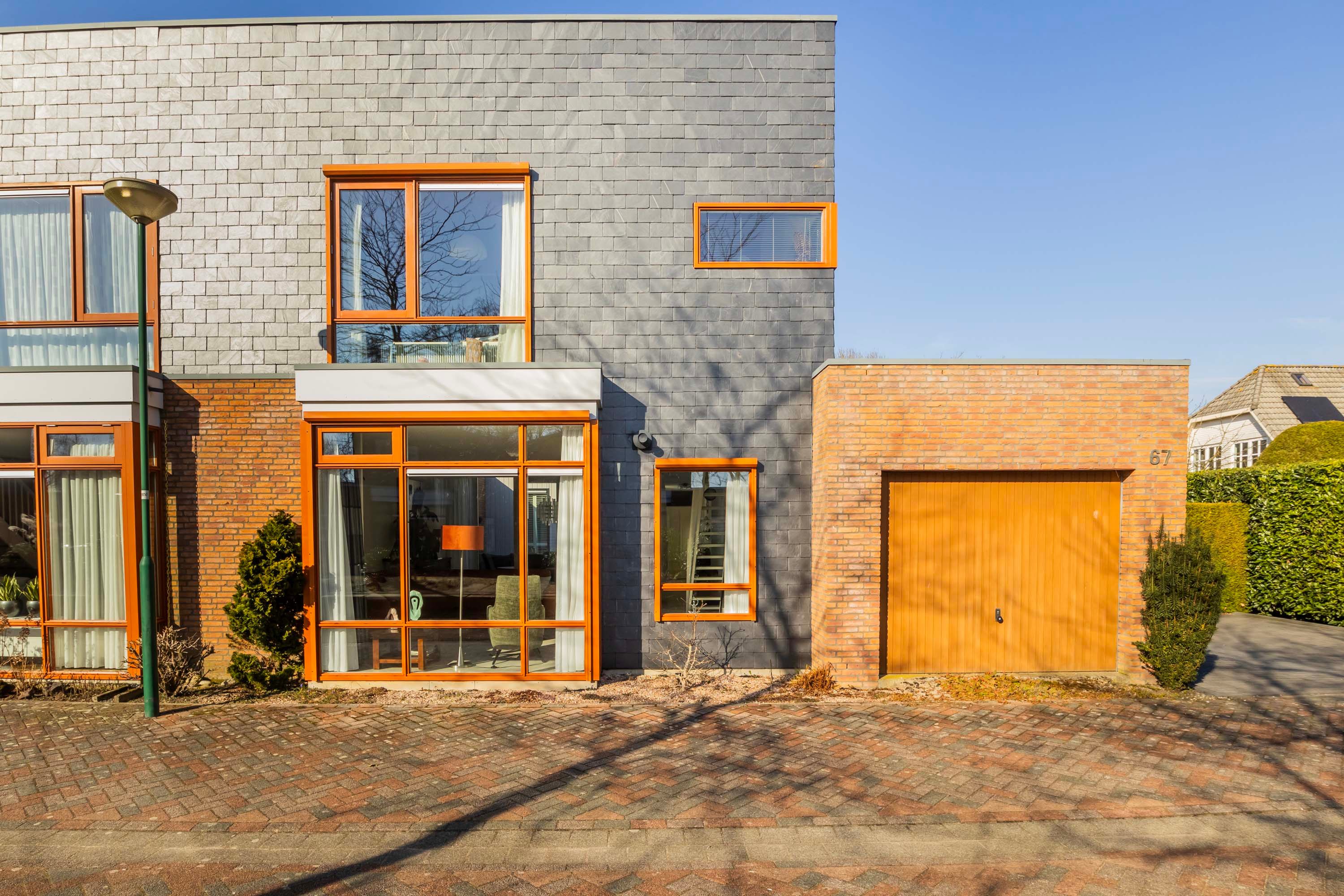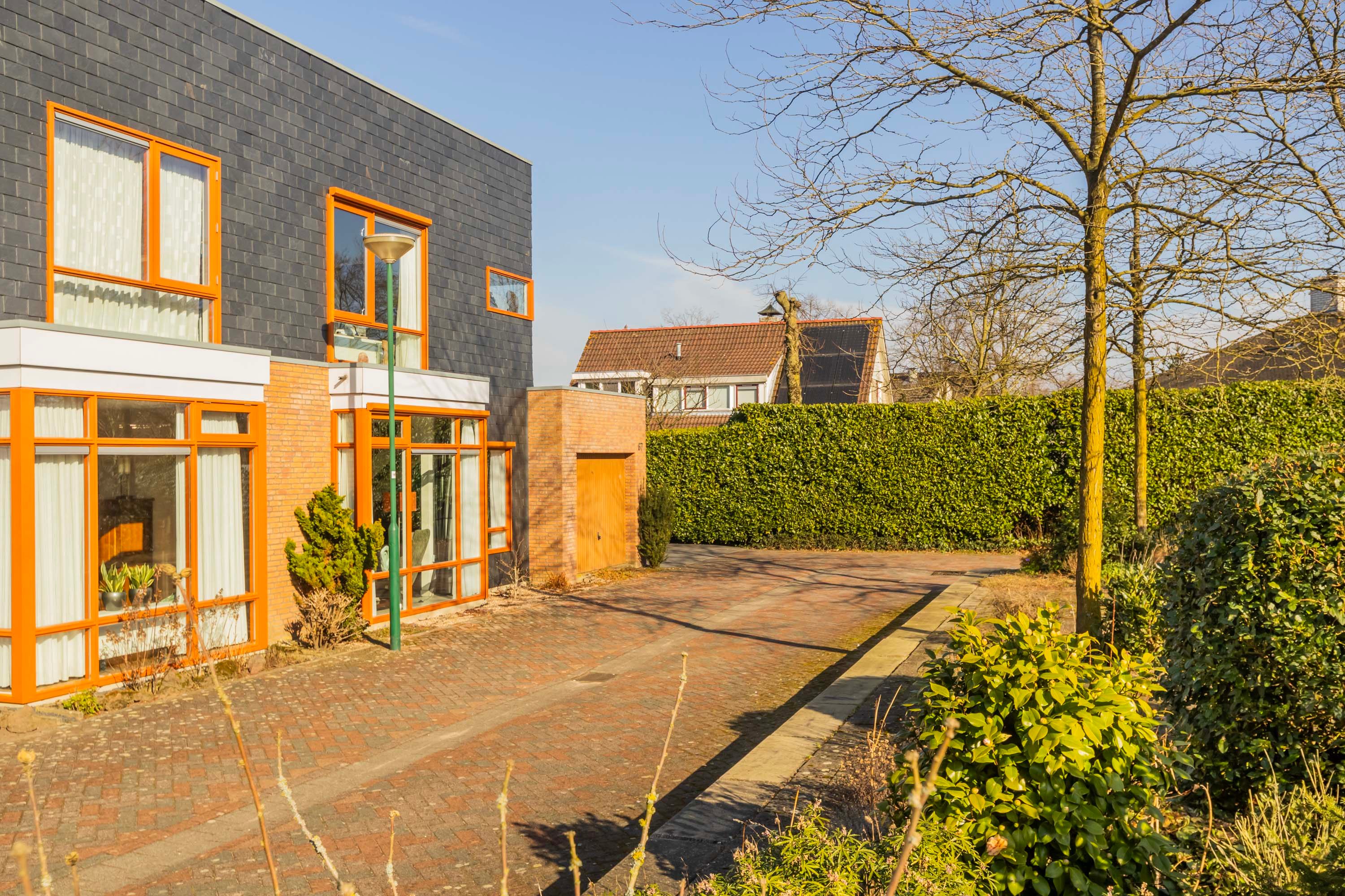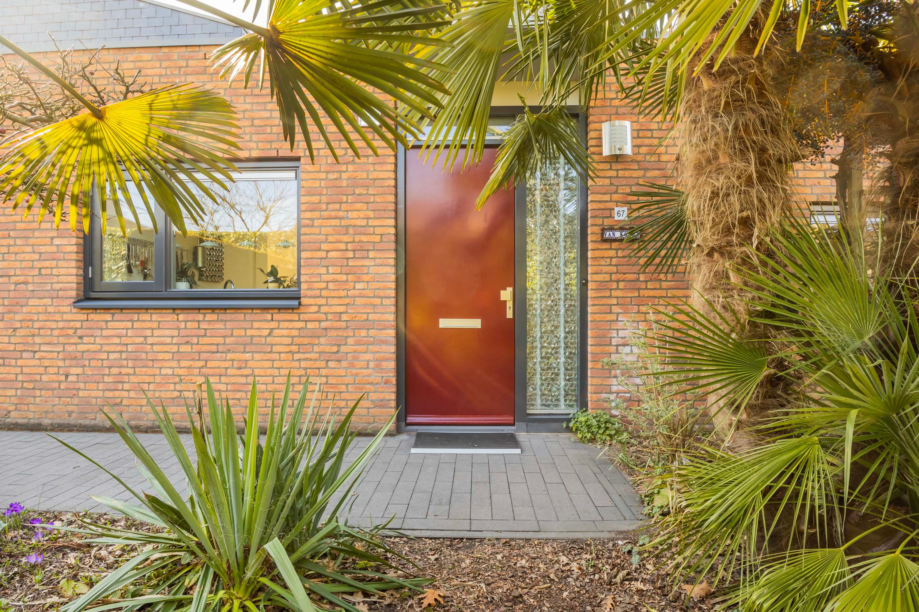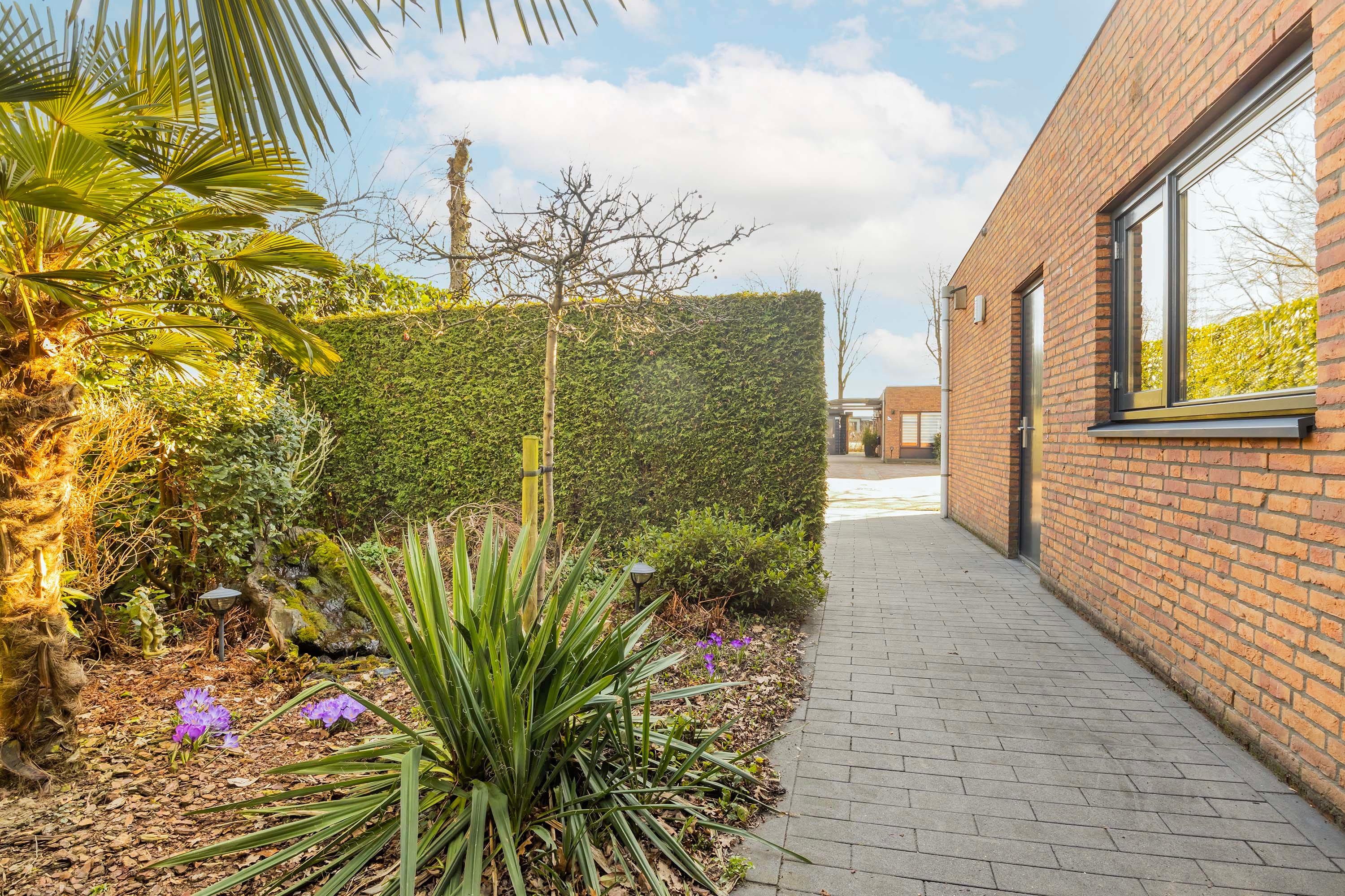 Deze fraaie bungalow heeft naast de besloten patio ook de beschikking over een fraai en verzorgd aangelegde zij-tuin met een sfeervol en privacy rijk terras met tropische uitstraling door de specifieke beplanting met onder andere palmbomen, pergola met druiven, kiwi’s en overige beplanting. De inpandige garage/berging is eveneens via de zij-tuin bereikbaar en is ook voorzien van een kanteldeur (thans buiten gebruik). Aan de voorzijde van deze woning heb je de beschikking over parkeerruimte voor twee auto’s en de opstelling voor de kliko’s.