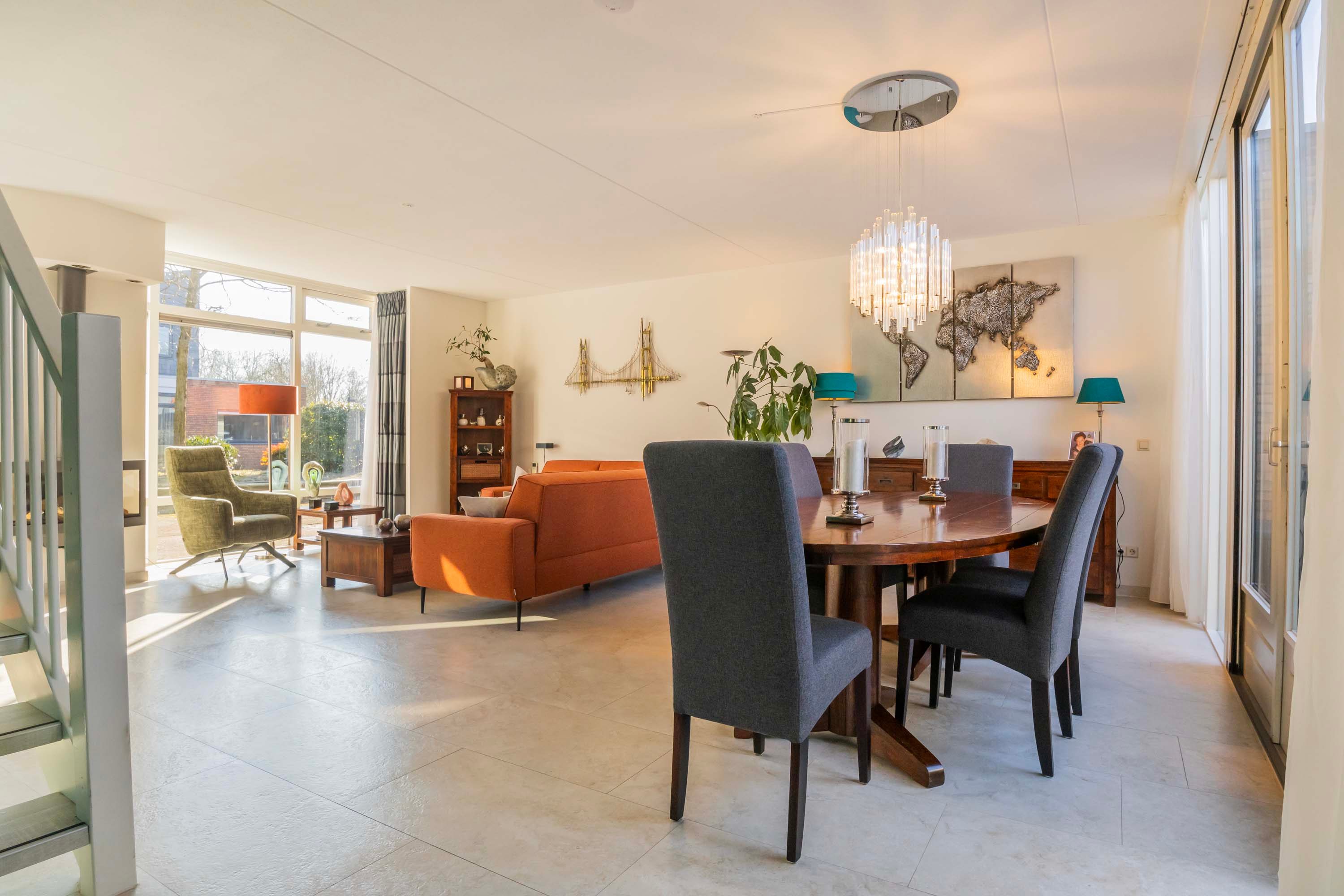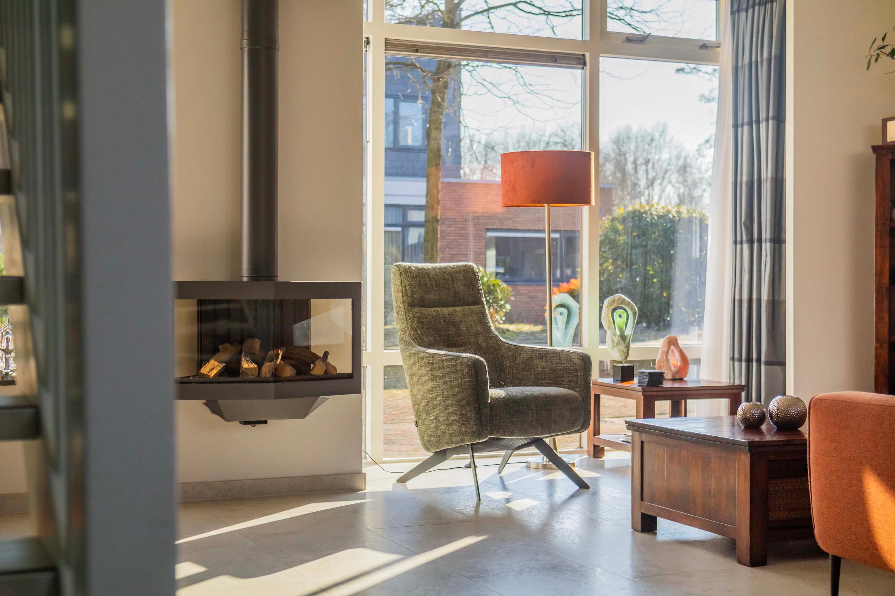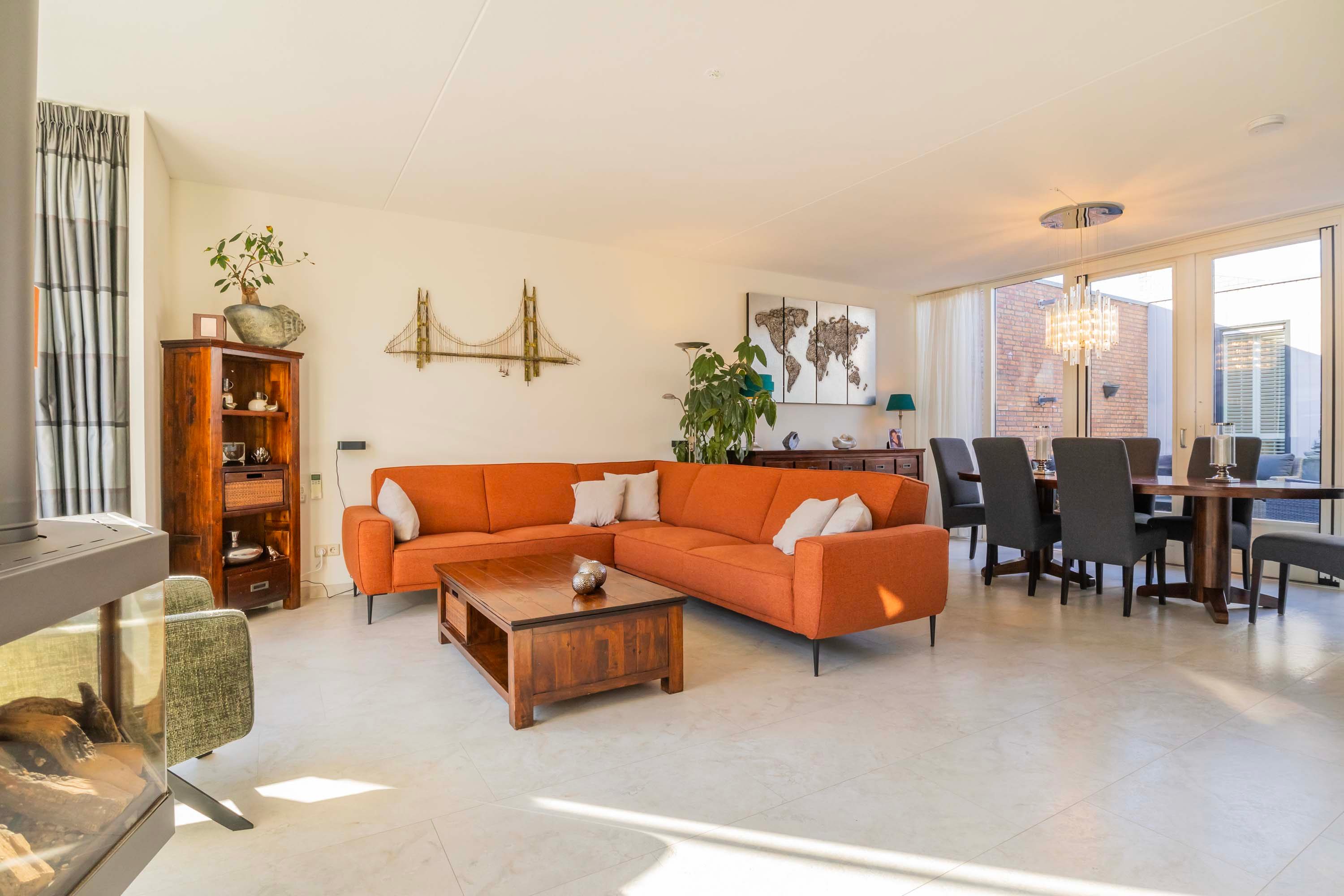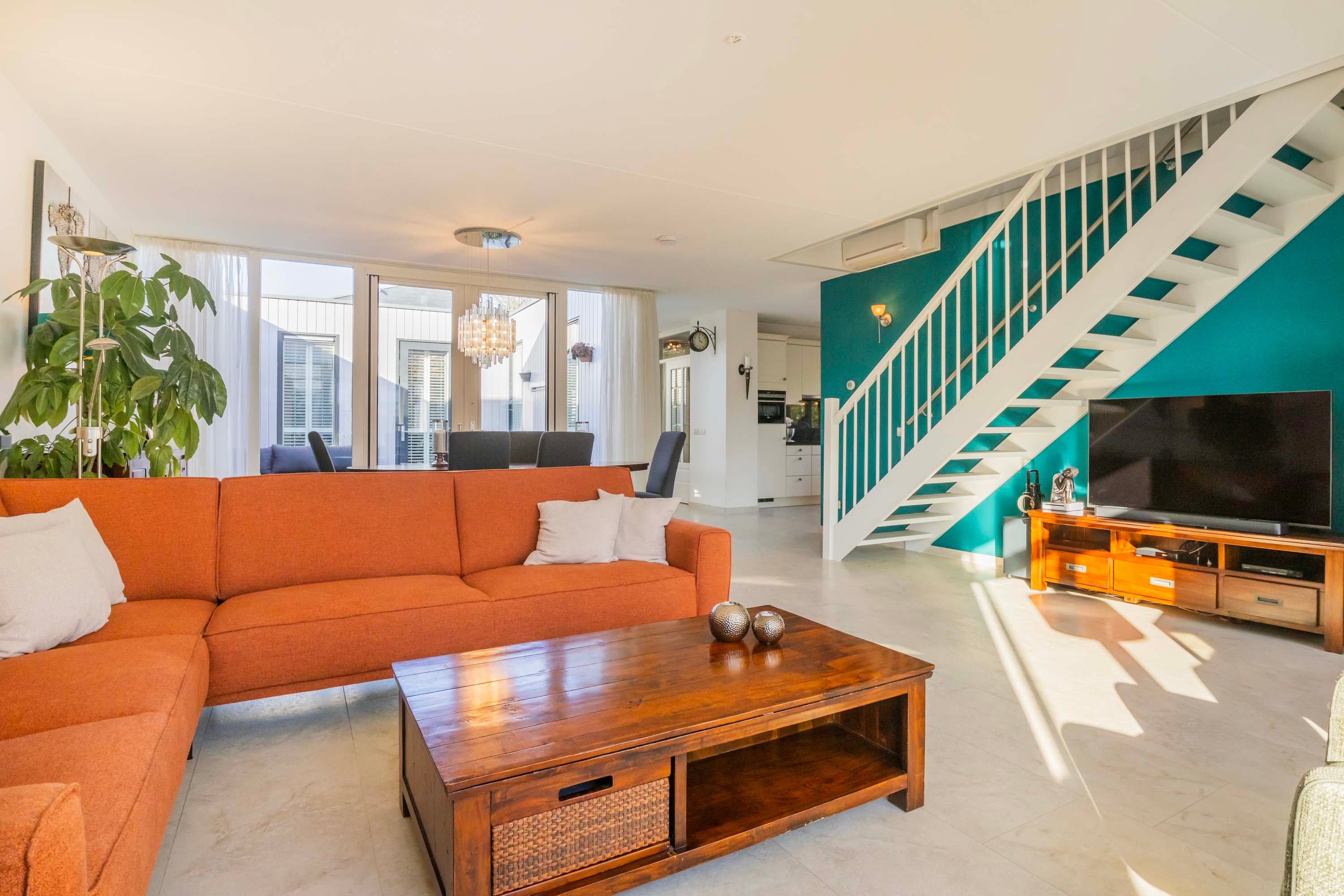 De entreehal is voorzien van een meterkast en inpandige berging en cv-ruimte, waar de mechanische ventilatie-unit en HR-cv-combiketel (merk: Nefit Proline HR CW4 combiketel, 2019) staan opgesteld. De keurige moderne toiletruimte is voorzien van wandcloset en een wastafelkast en is betegeld met lichte wand- en vloertegels met antraciet kleurige accenten. Vanuit de entreehal is er toegang tot de royale woonkamer van maar liefst 41.2m² met een open trapopgang naar de verdieping en prettig veel lichtinval door de vele raampartijen en een grote glazen pui met openslaande deuren naar de patio. Deze besloten patio biedt veel privacy en rust om te relaxen. De royale woonkamer beschikt over een mooie gashaard en tevens een airco om het binnenklimaat optimaal te kunnen regelen. De begane grond vloer is betegeld met een lichte plavuizen vloertegel met comfortabele vloerverwarming.