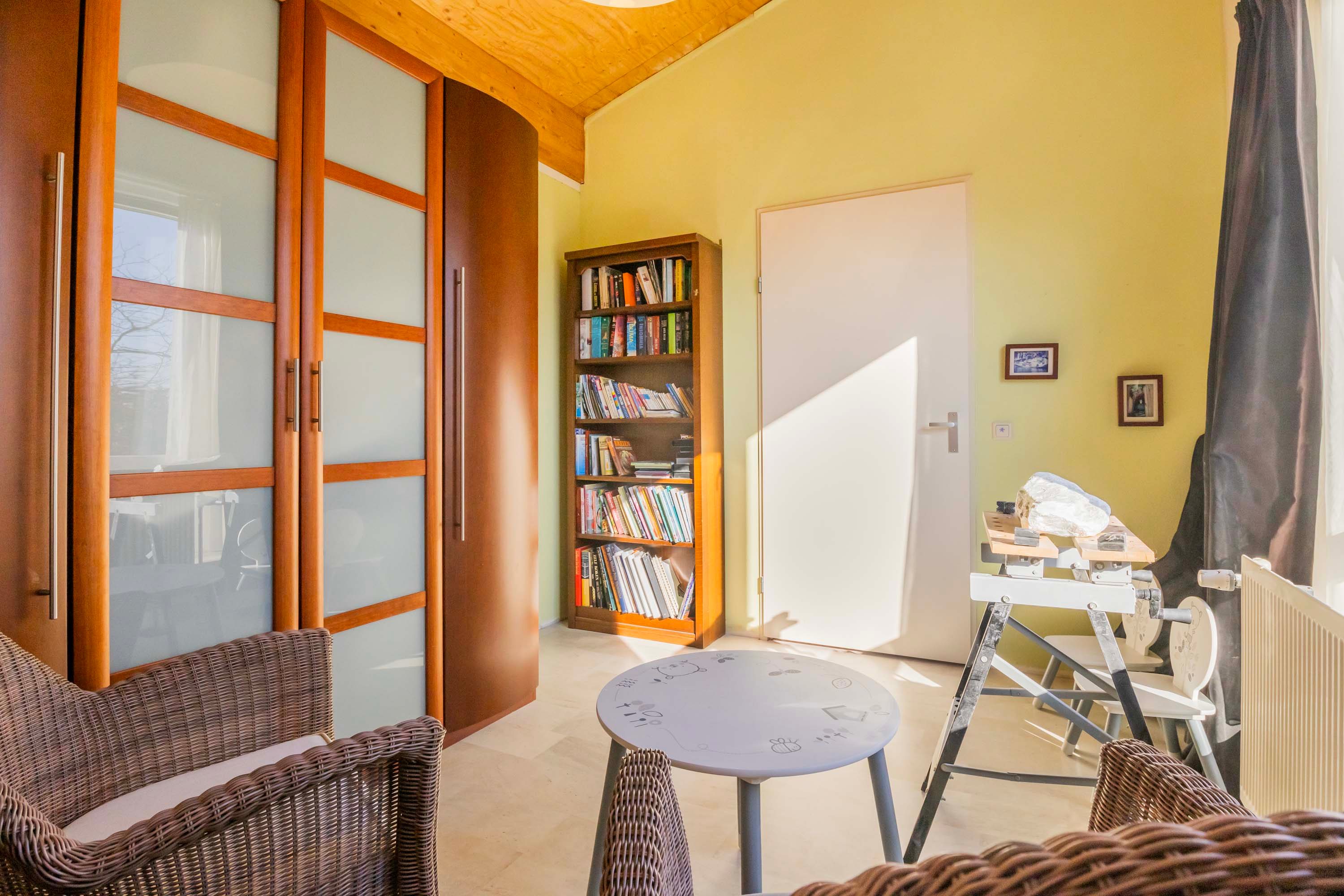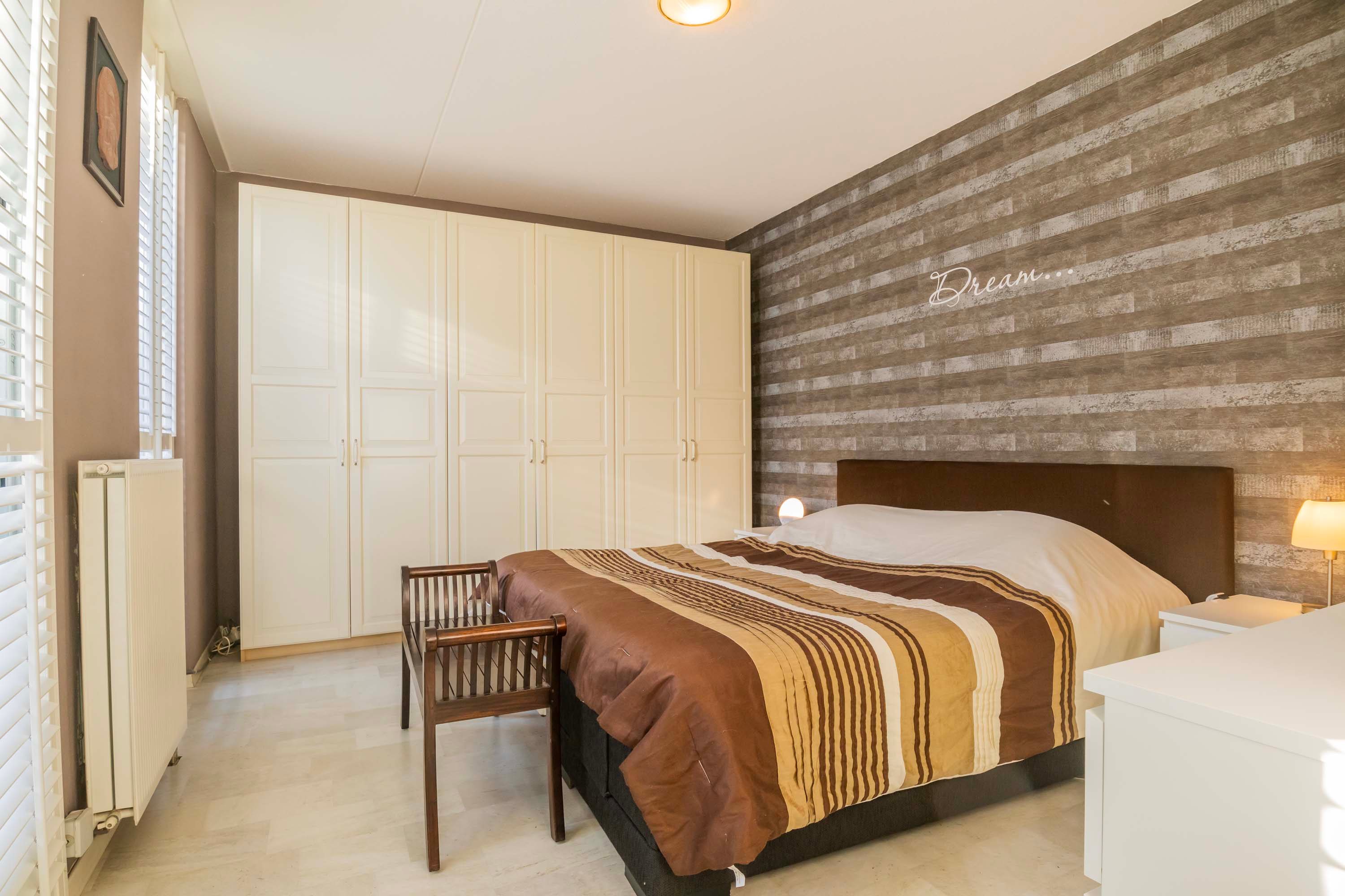 Vanuit de woonkamer/keuken loop je een gang in met ook veel daglichtinval door de vele raampartijen, vanuit deze gang is er toegang tot een ruime slaapkamer en een tweede slaapkamer die thans in gebruik is als kantoor en de in 2023 volledig vernieuwde badkamer. De grootste slaapkamer is praktisch en ruim en is voorzien van een deur naar de patio. De recente compleet fraai gerenoveerde badkamer is voorzien van een inloopdouche, wastafelmeubel en een wandcloset.