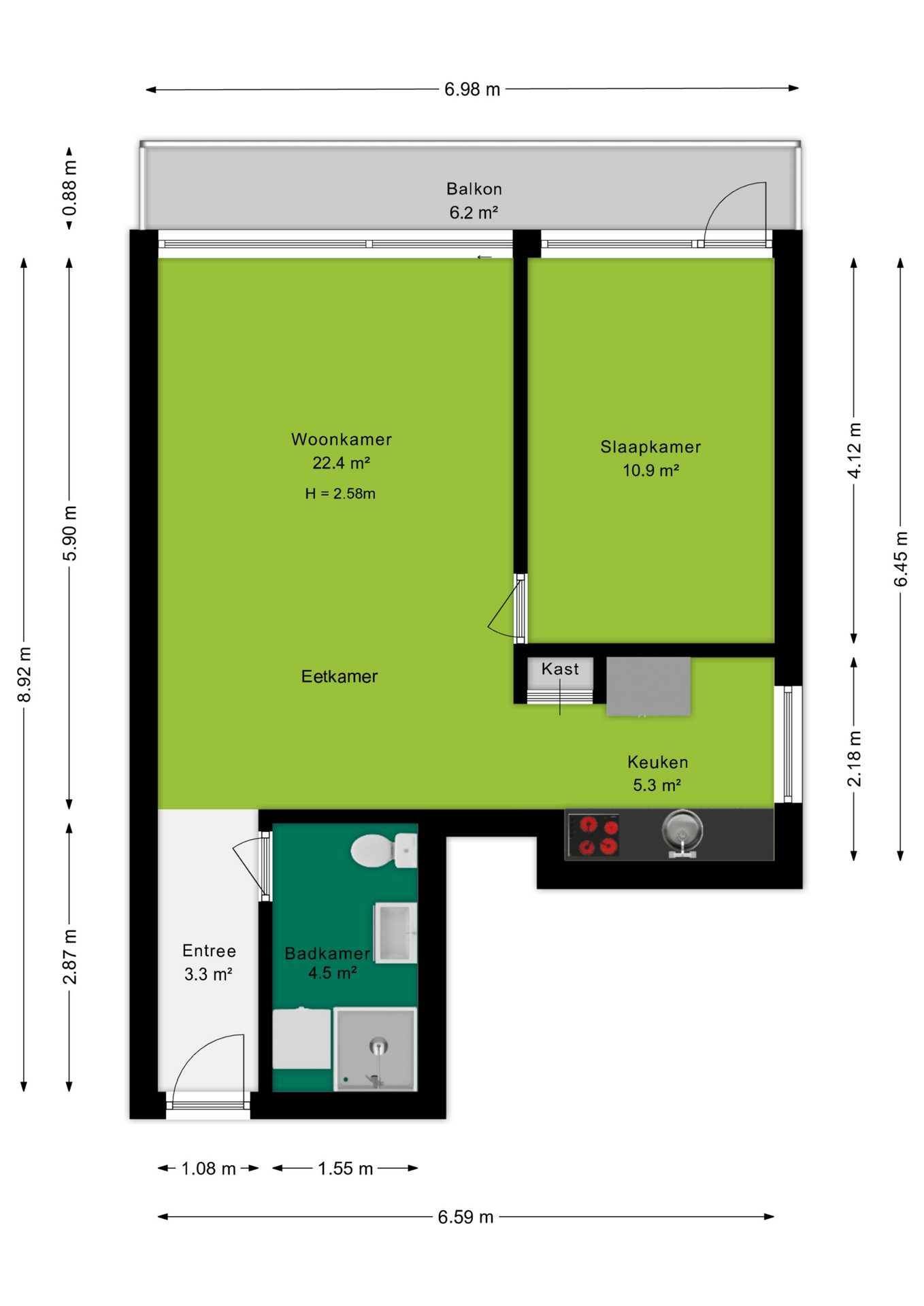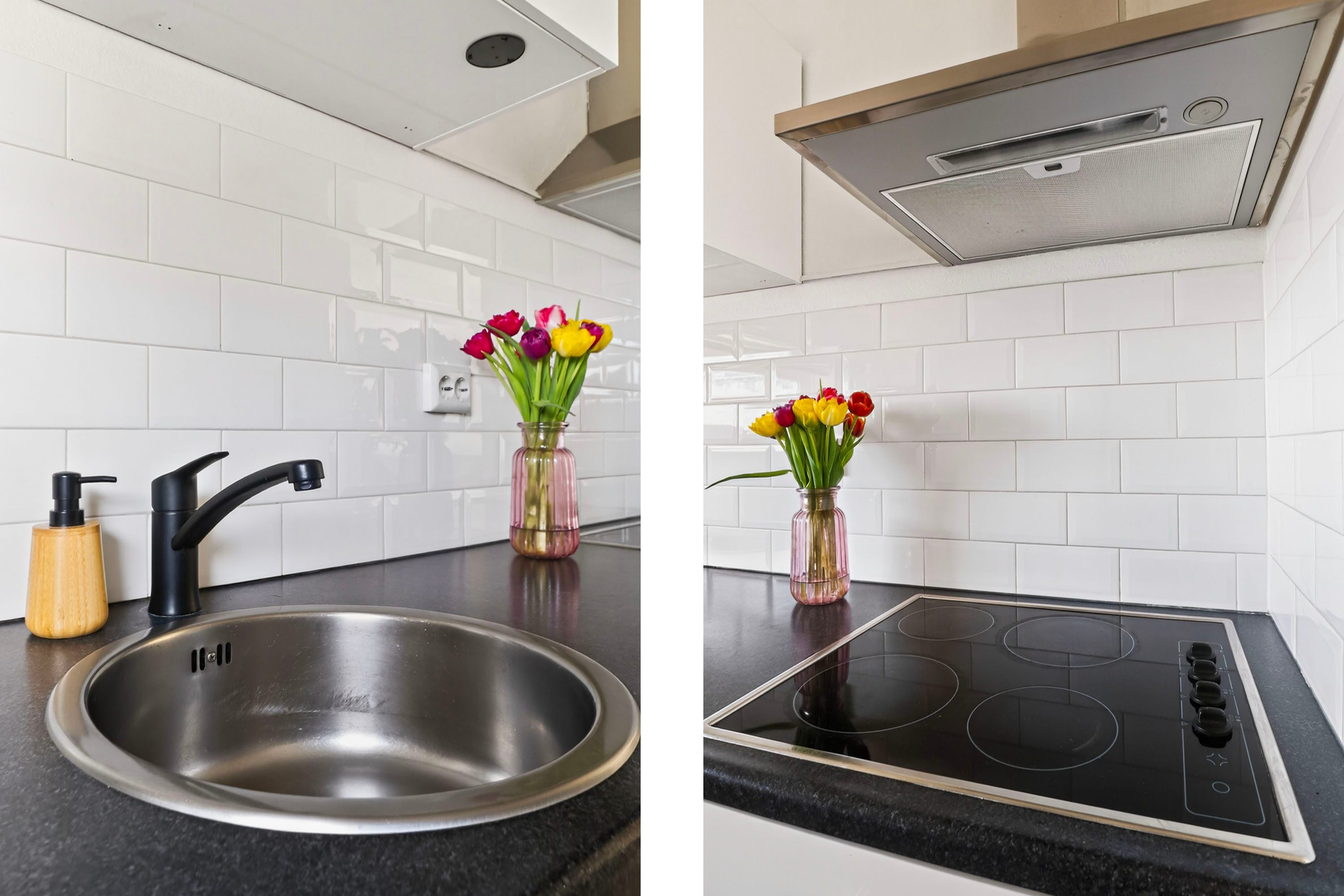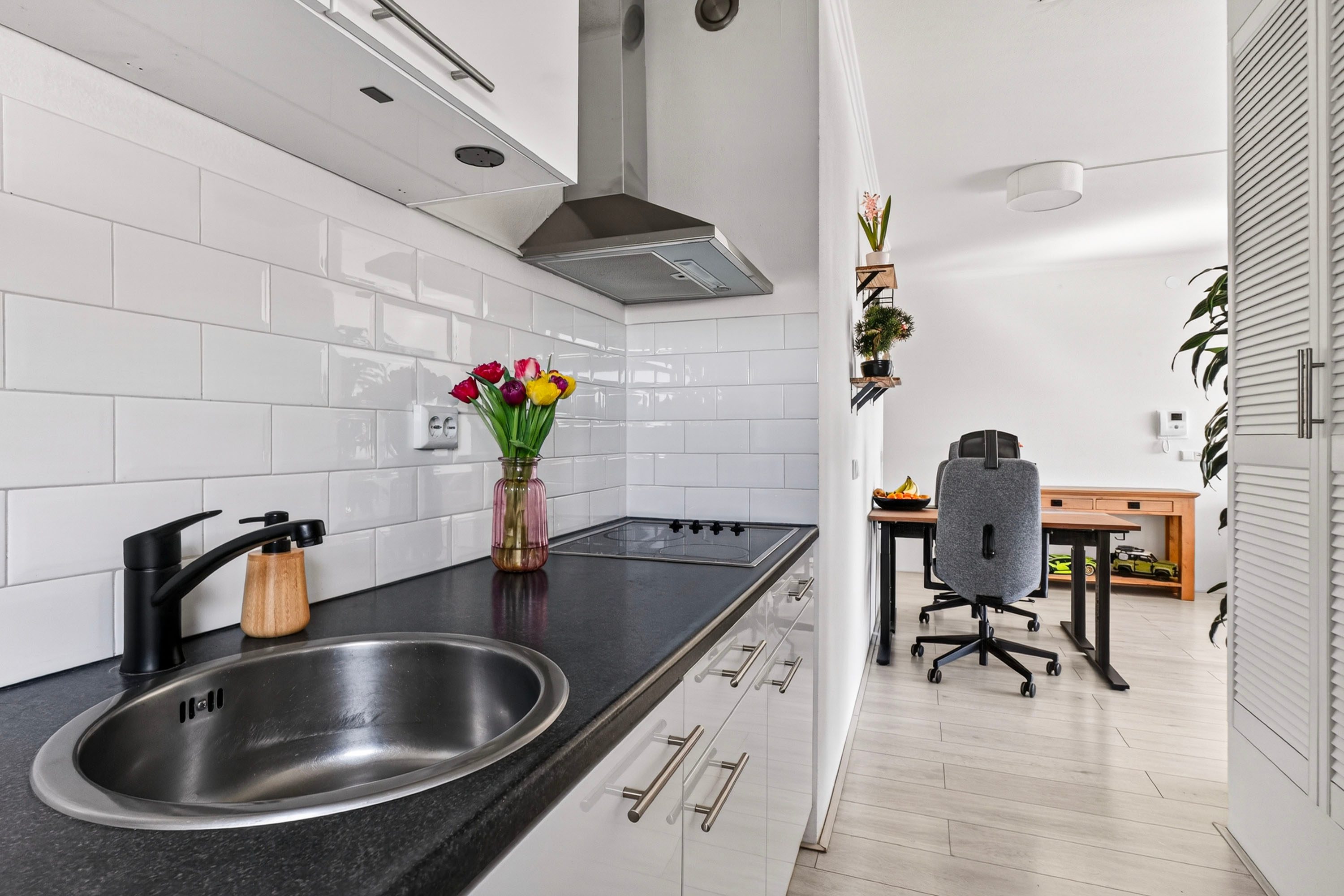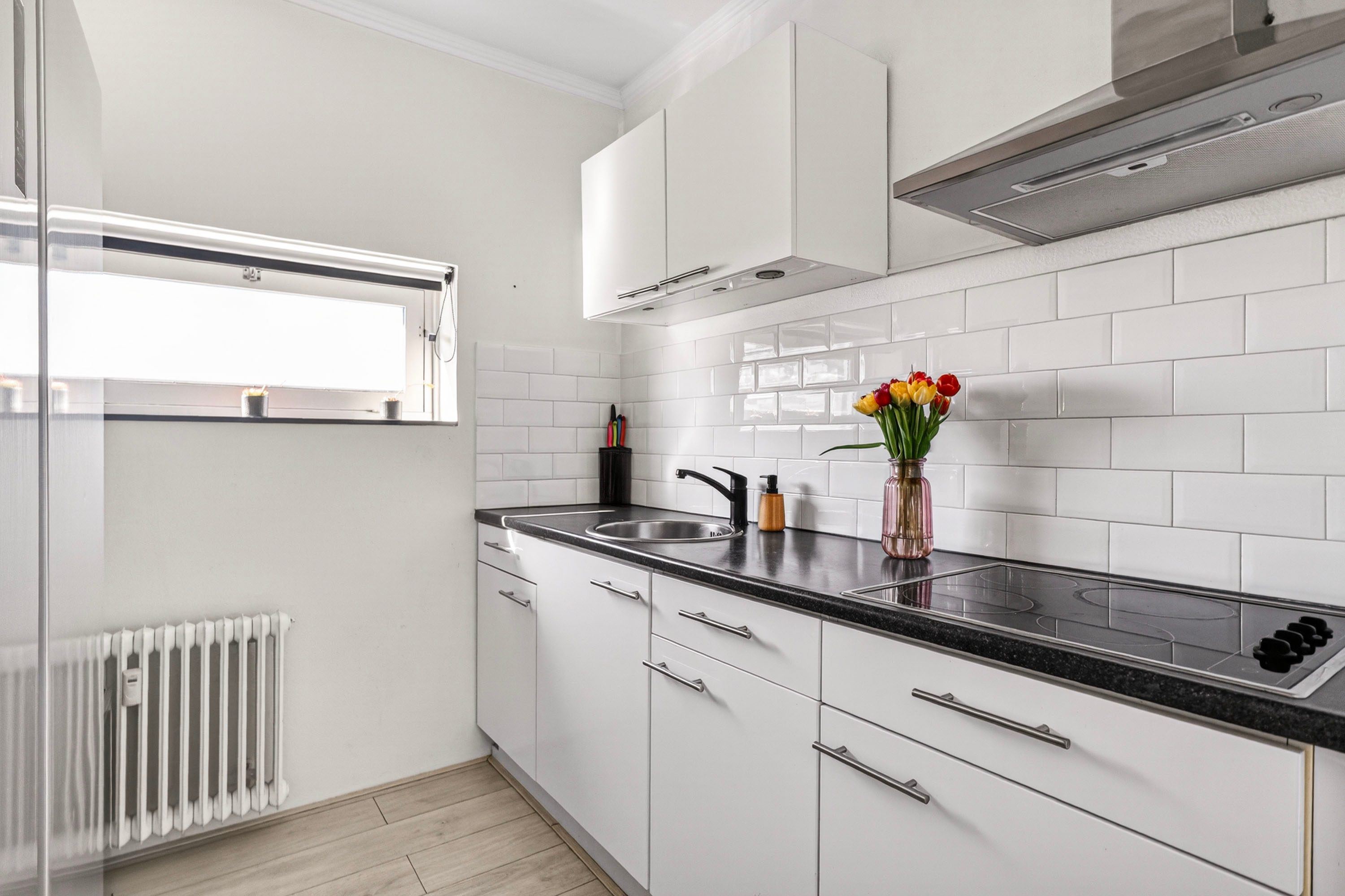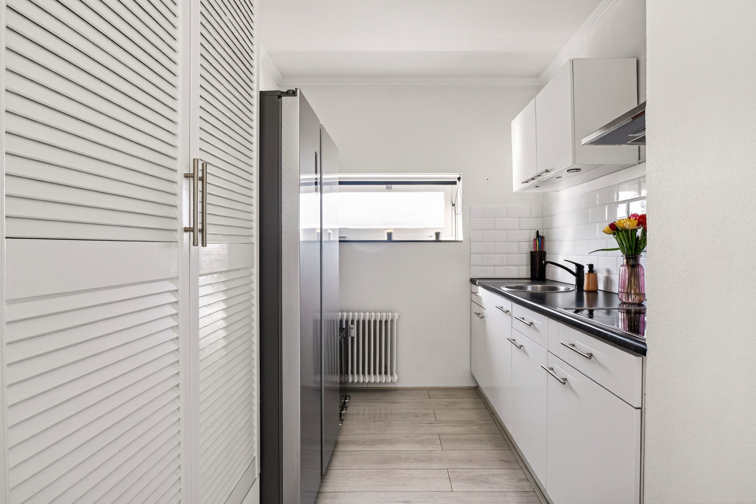 De open keuken is praktisch ingericht in een rechte opstelling en voorzien van een kookplaat en afzuigkap. Door de hoekligging van het appartement profiteer je hier bovendien van een extra raam, wat zorgt voor nog meer licht en ventilatie.