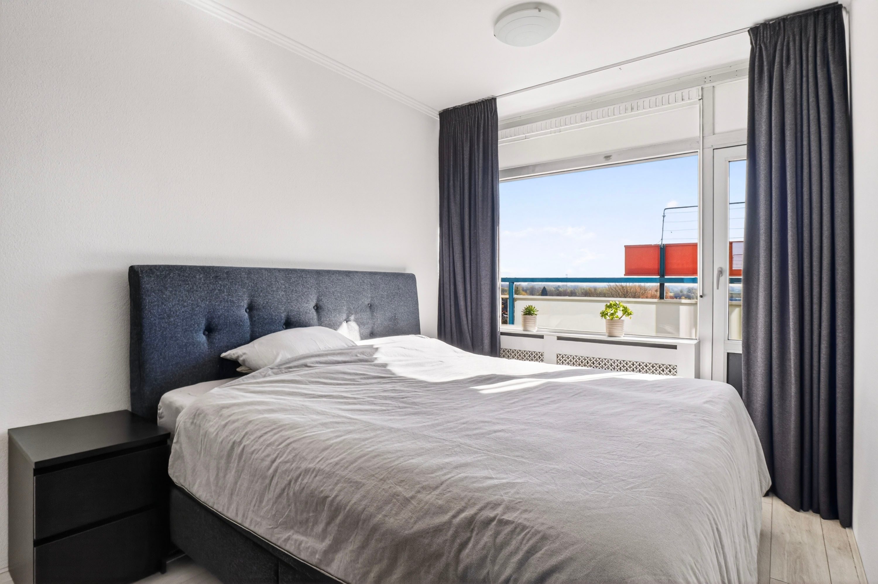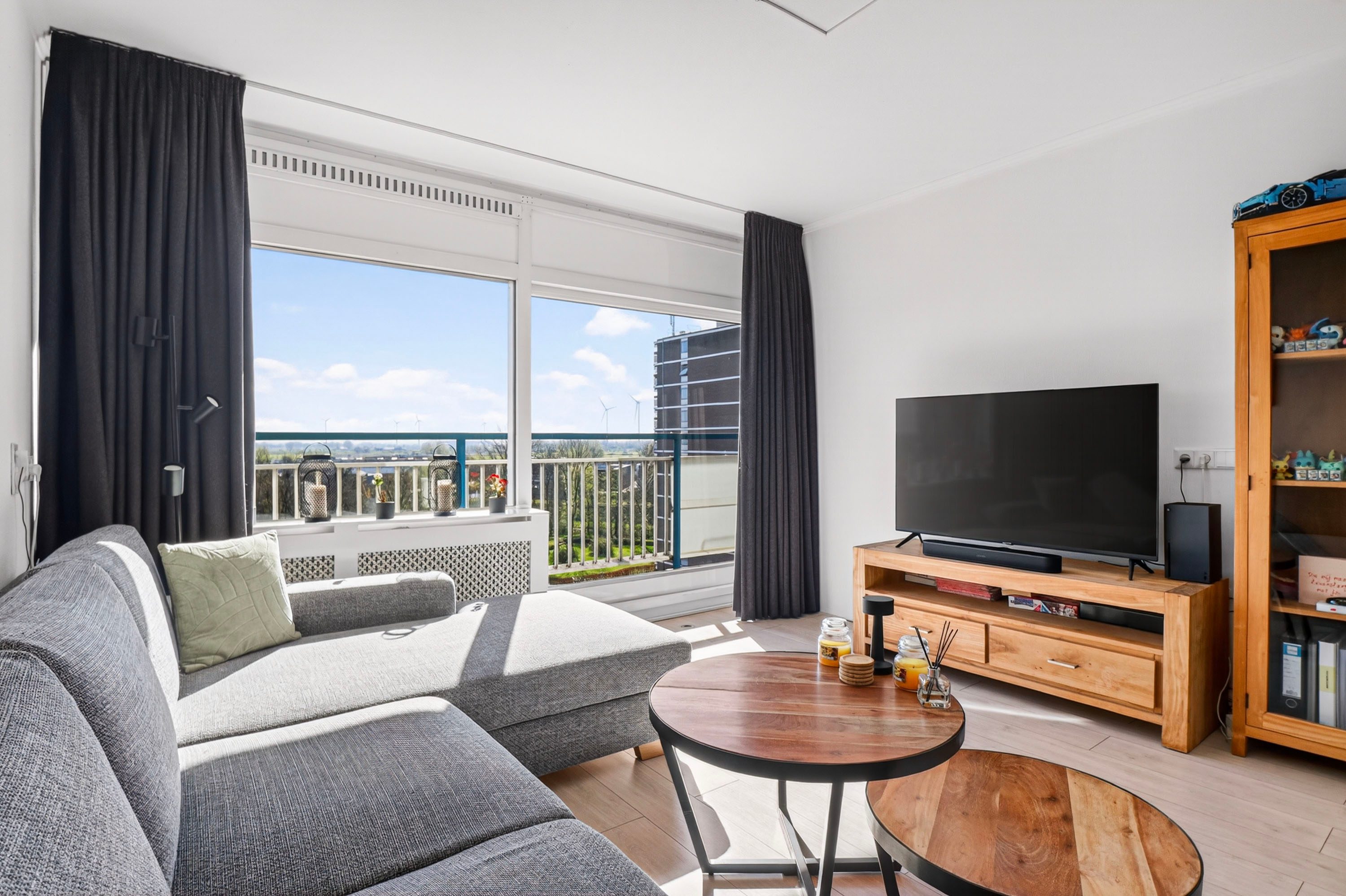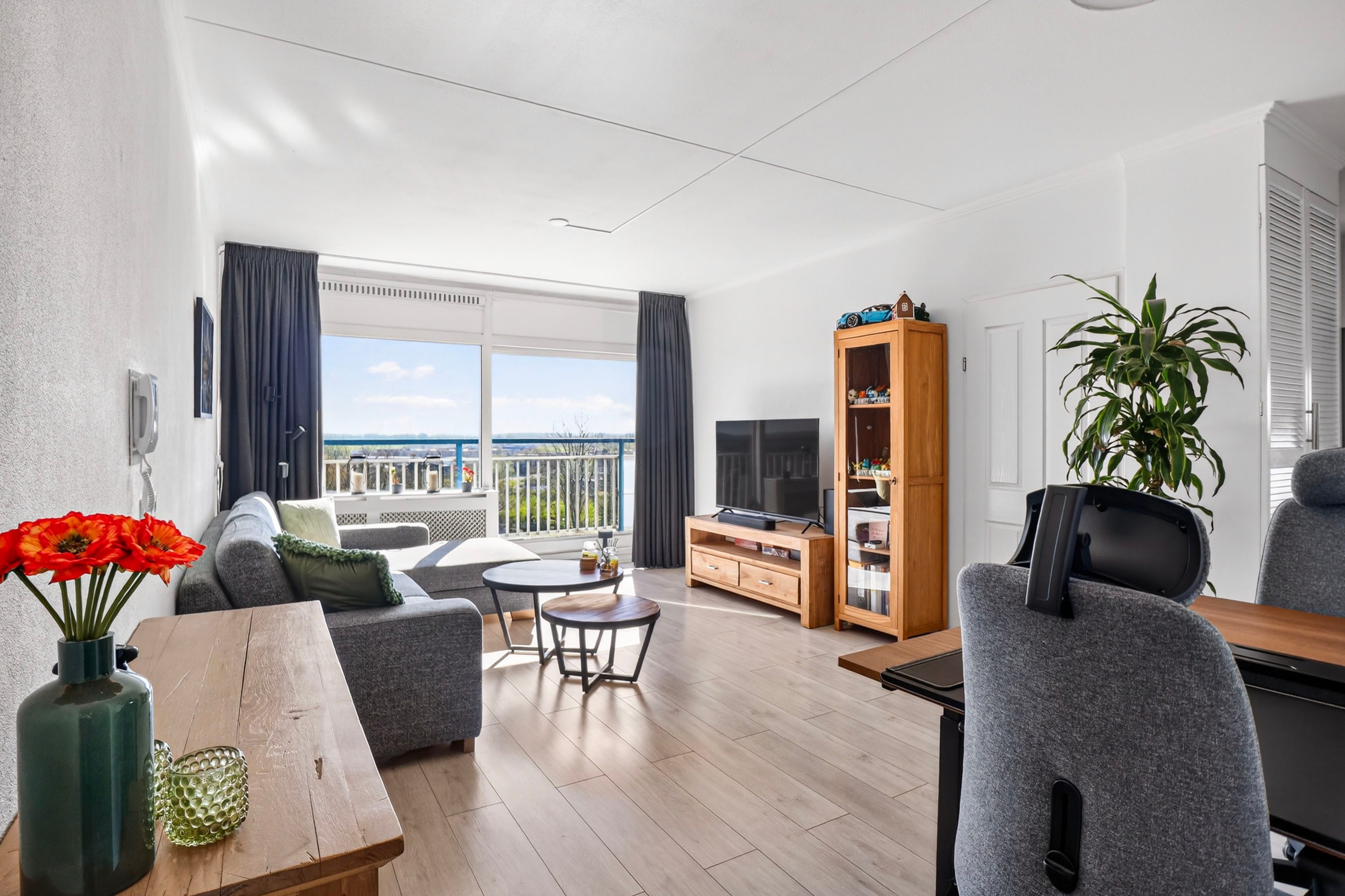 Bij binnenkomst word je direct verrast door de lichte en ruime woonkamer van circa 22 m². Dankzij de grote raampartijen geniet je hier van een prettige lichtinval en een mooi, vrij uitzicht. Vanuit de woonkamer heb je toegang tot het balkon over de volle breedte van het appartement, gelegen op het oosten, de perfecte plek om de dag te beginnen met een kop koffie in de zon.